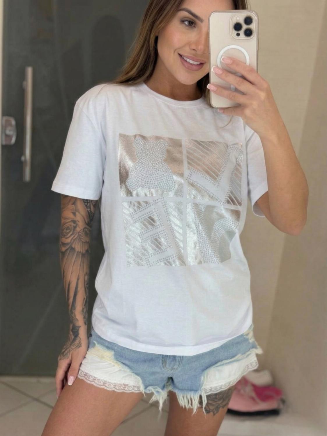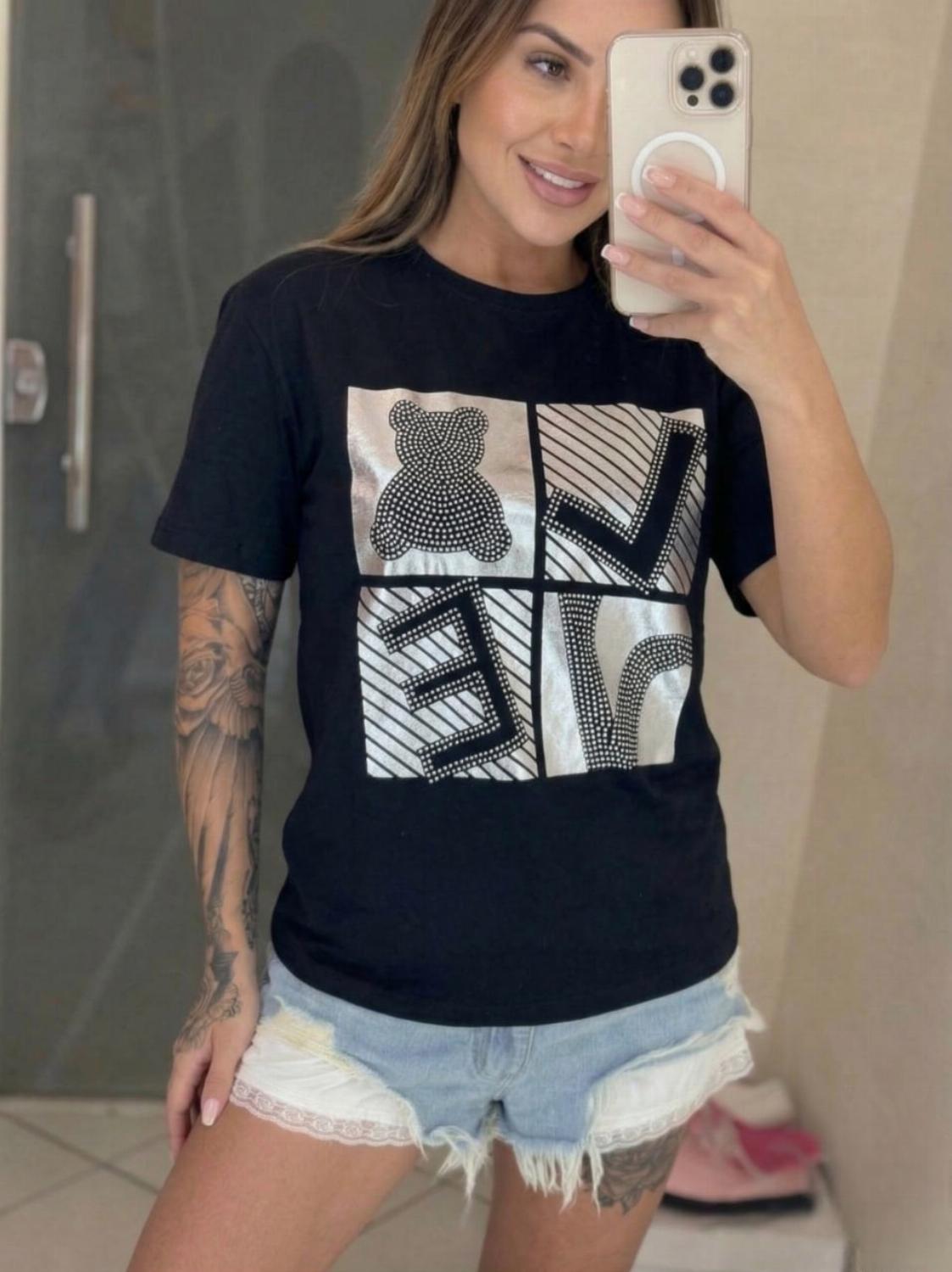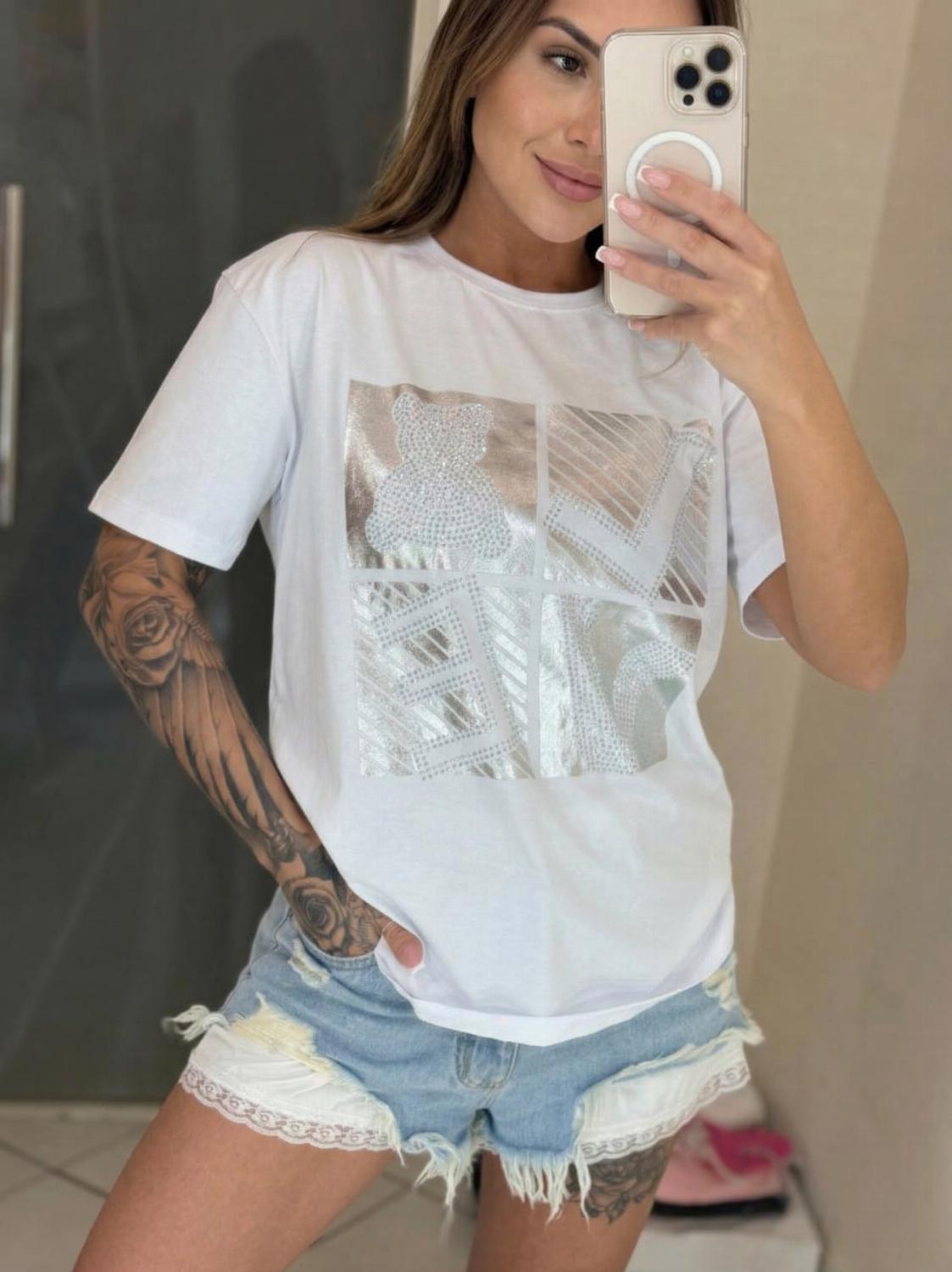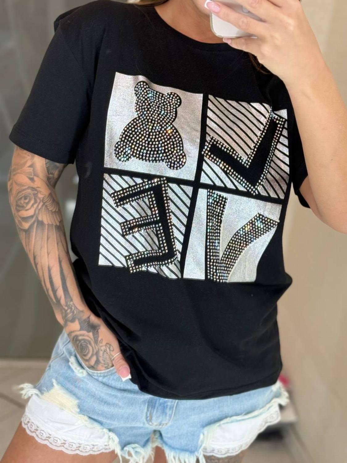 Шукаєш щось особливе для свого гардероба? Ця футболка створена, щоб притягувати погляди! Стильний принт у вигляді чотирьох квадратів, що утворюють слово LOVE з милим ведмедиком, декорований сяючими стразами, які неймовірно переливаються на сонці.