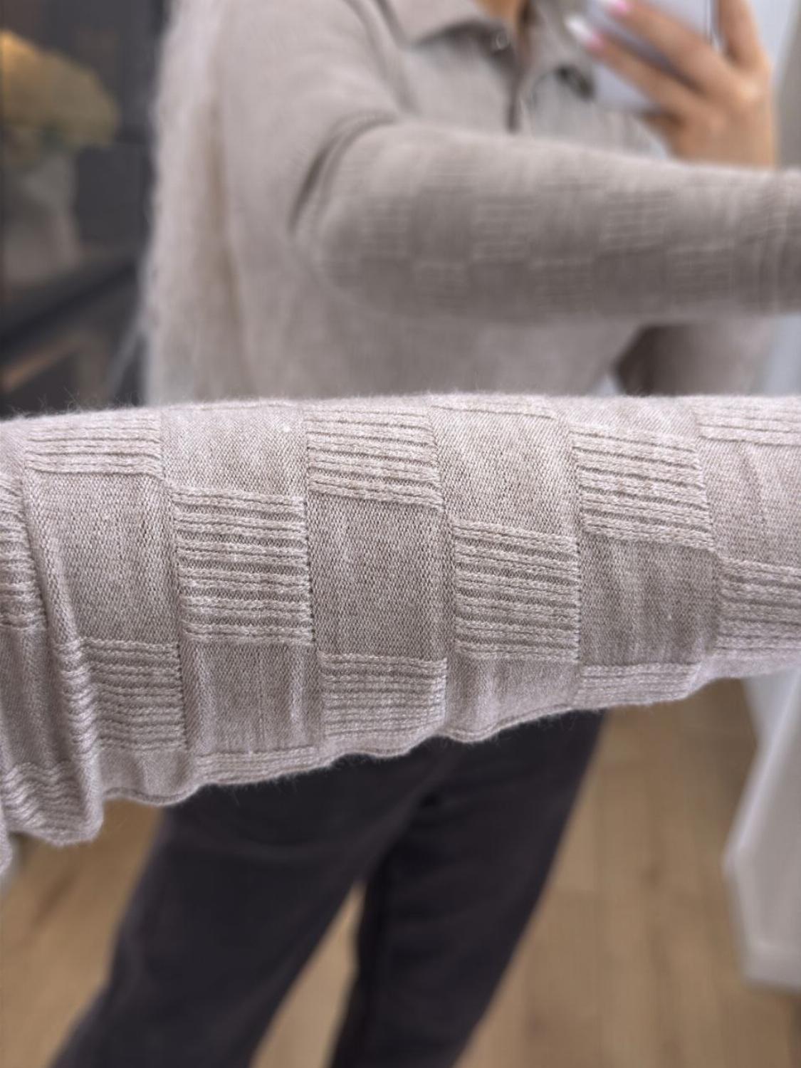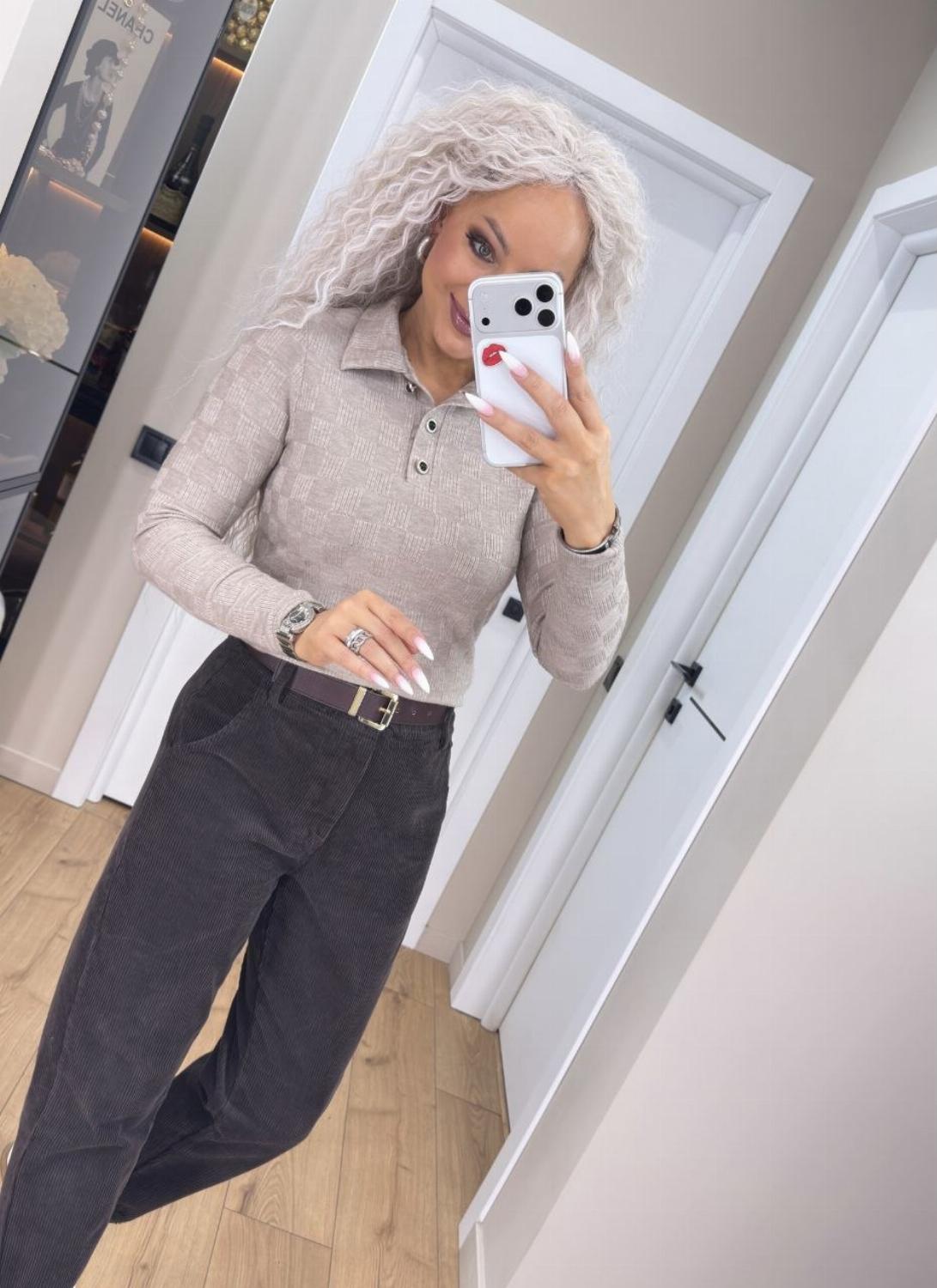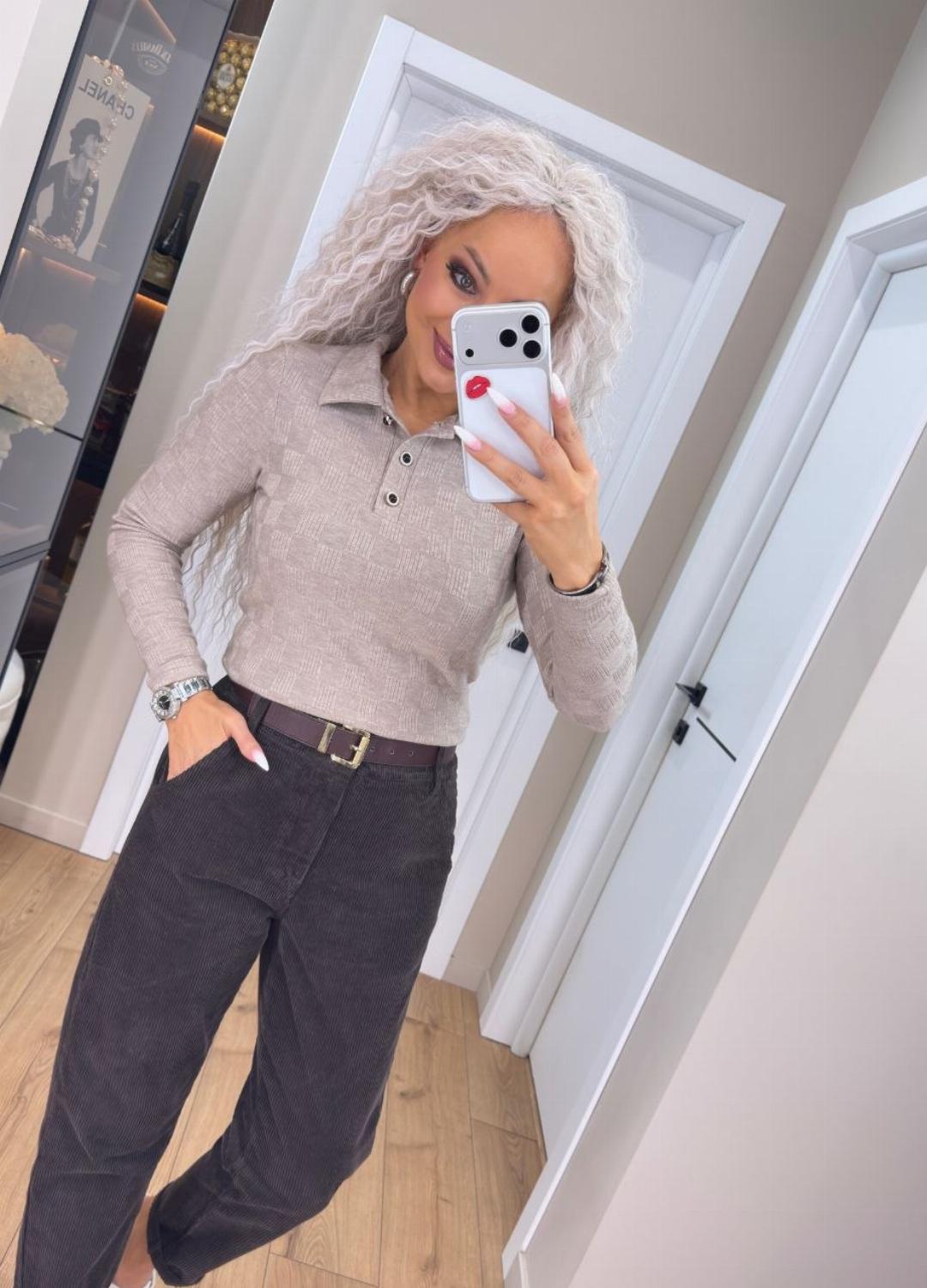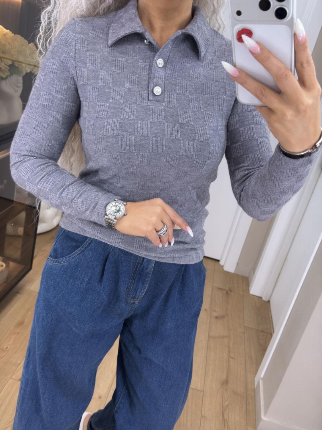 Кофта поло на ґудзиках — база, в якій затишно. Виготовлена з трикотажу ангори щільної структури: матеріал м’який, приємний до тіла, добре тягнеться і при цьому не деформується. Це той варіант, що робить образ простим, але продуманим.