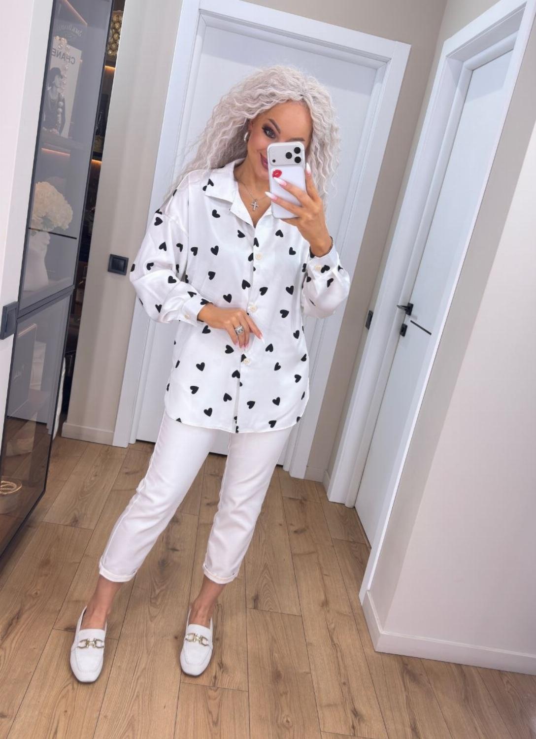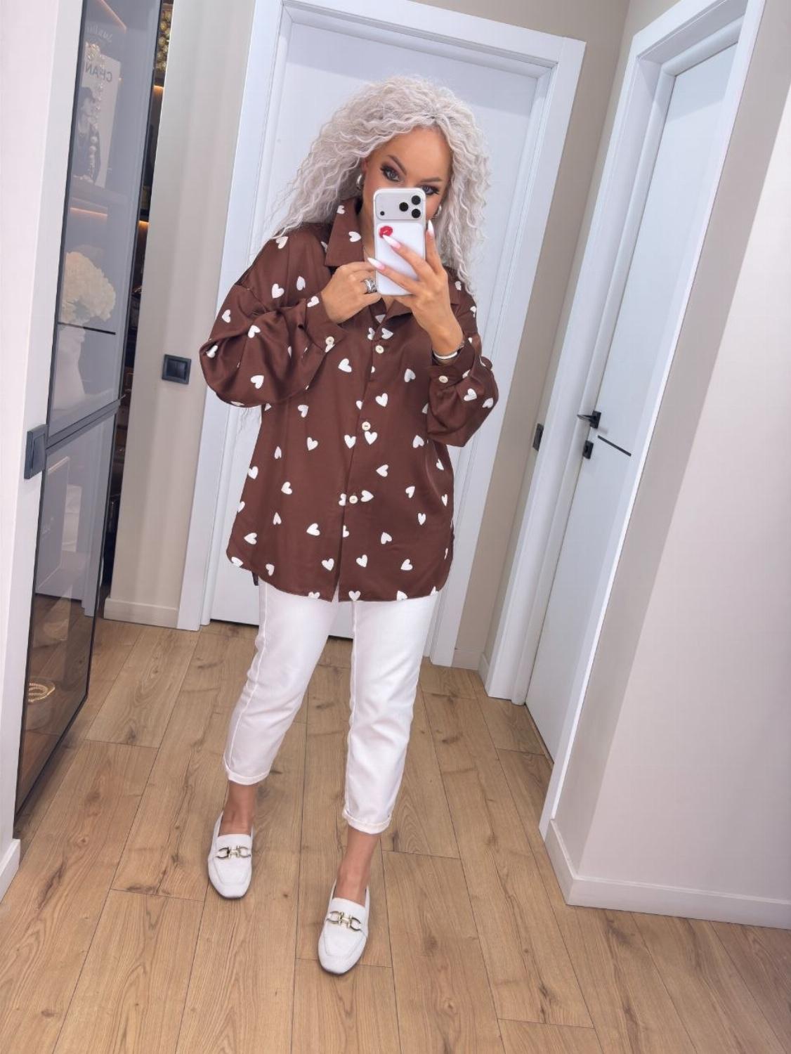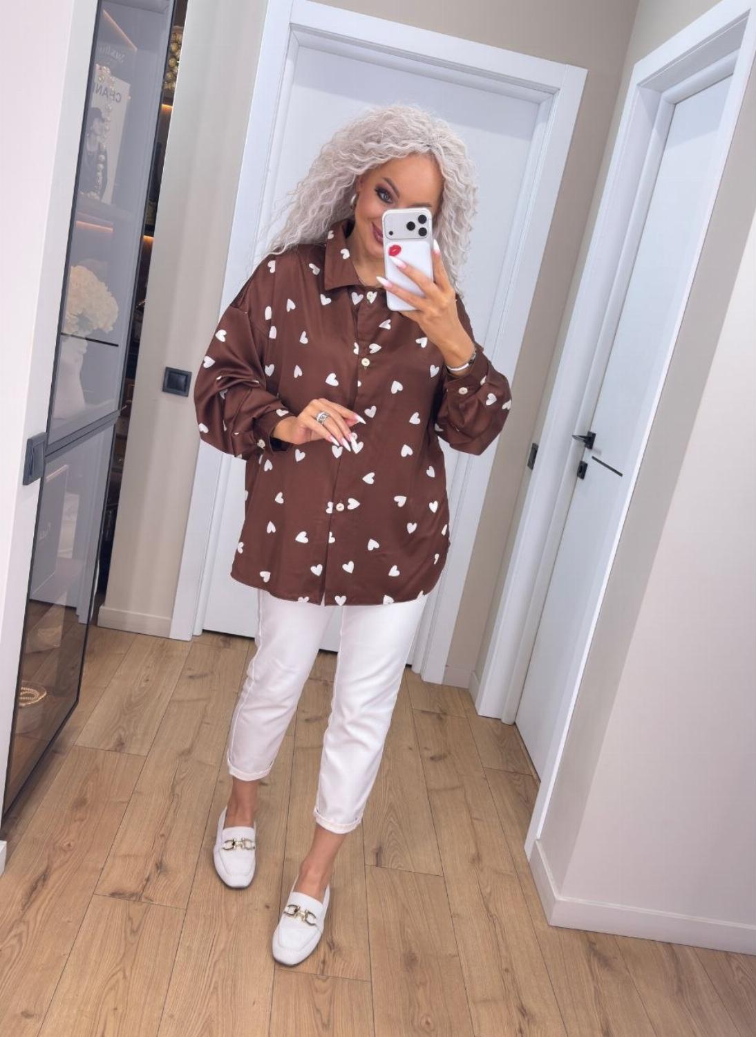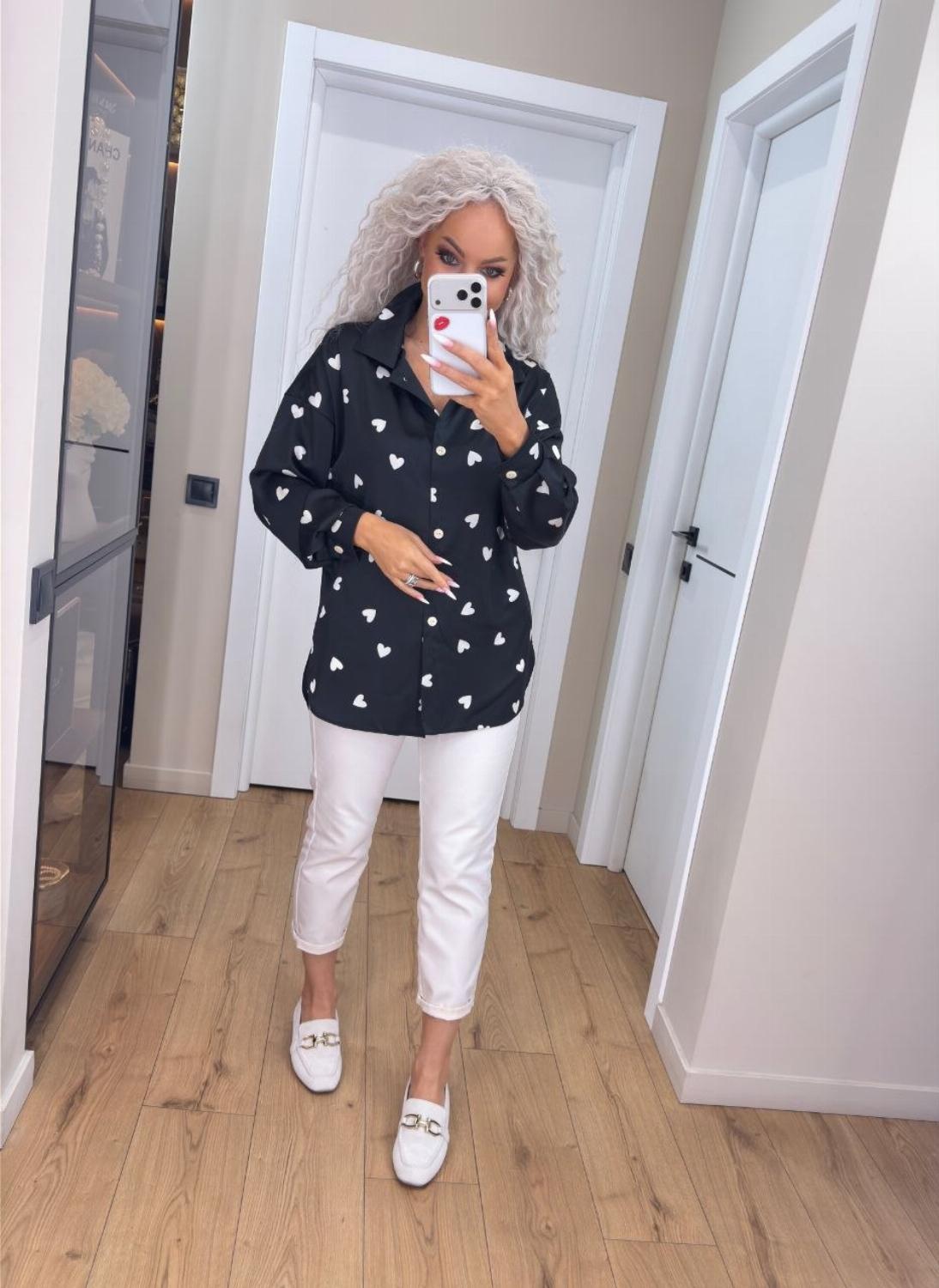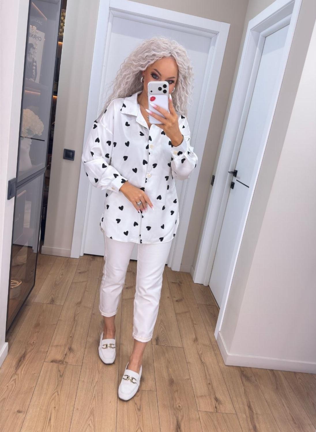 Дизайн: Грайливий принт у сердечко додає образу романтичності, а класичний крой дозволяє поєднувати блузу як з джинсами, так і з елегантними брюками.