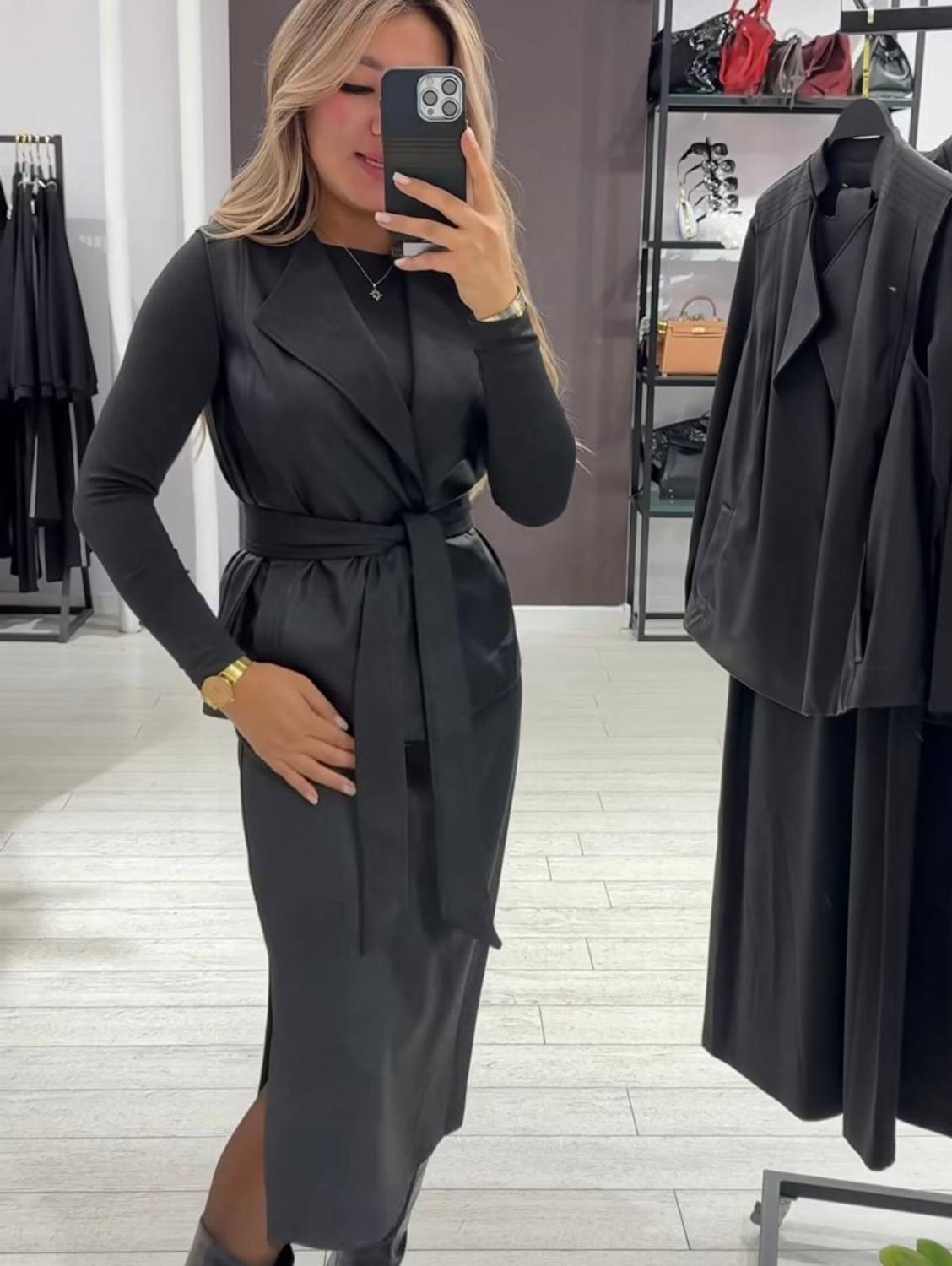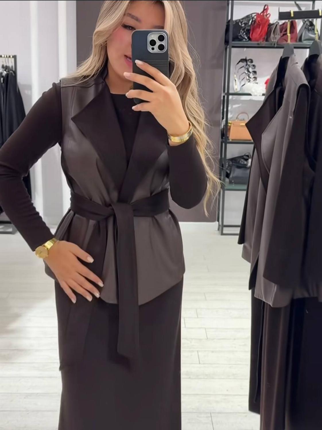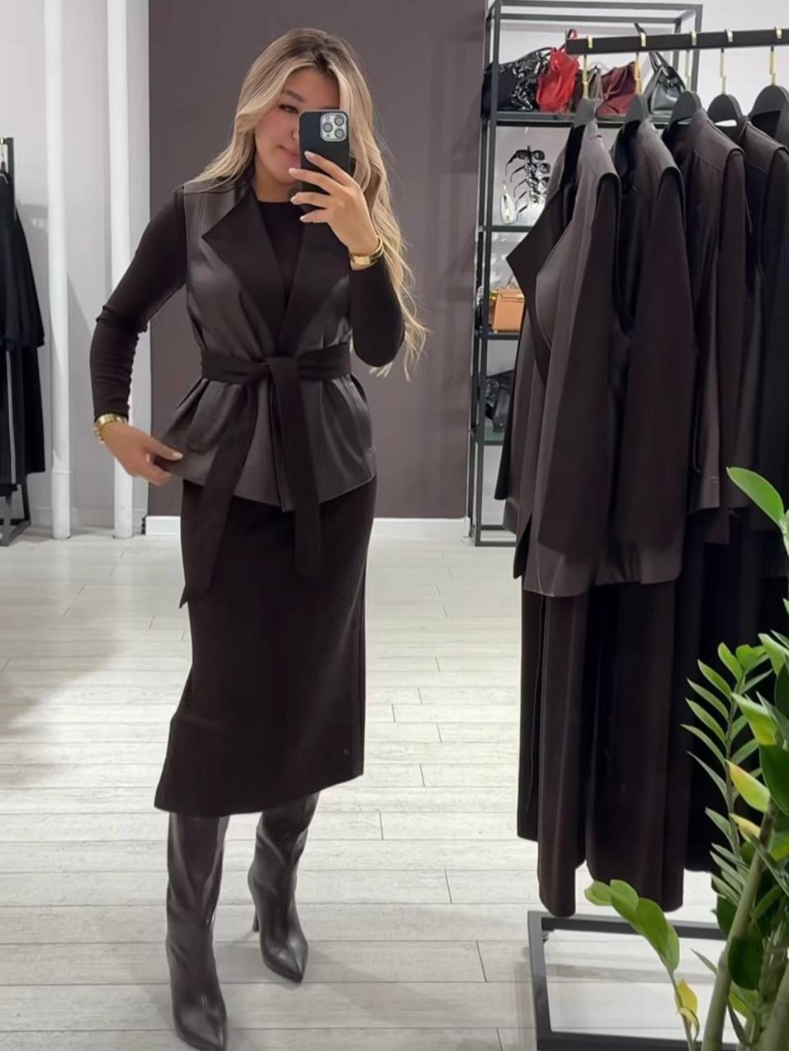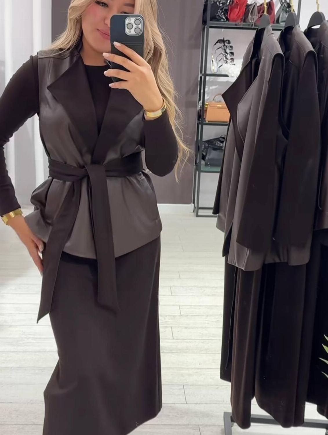 • Жилет — преміальна екокожа (акуратний крій, пояс для акценту на талії)
