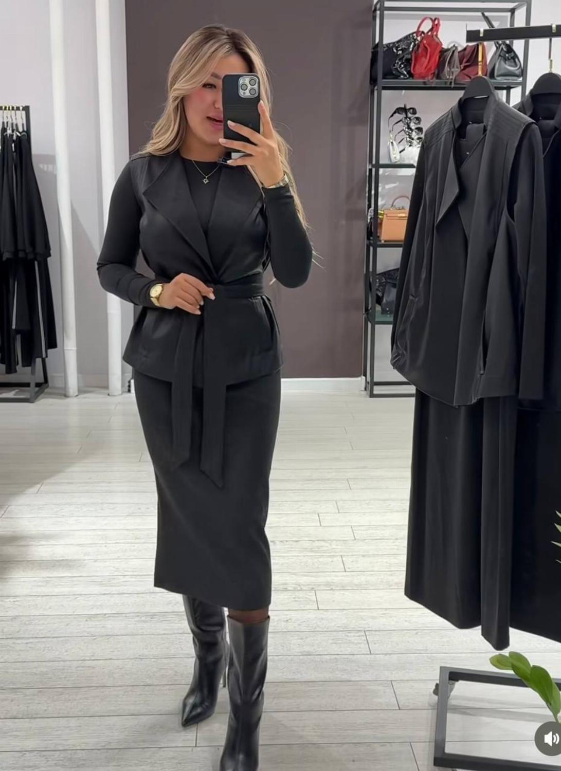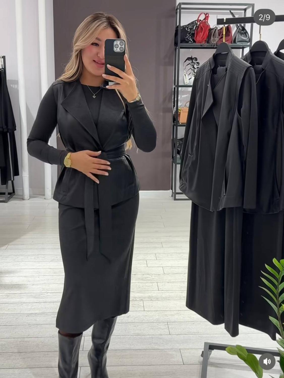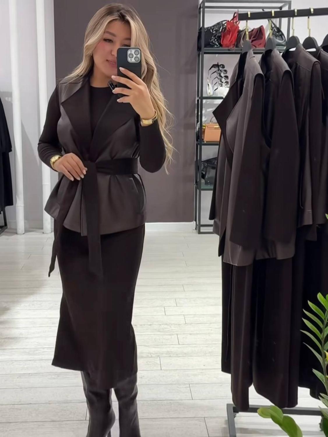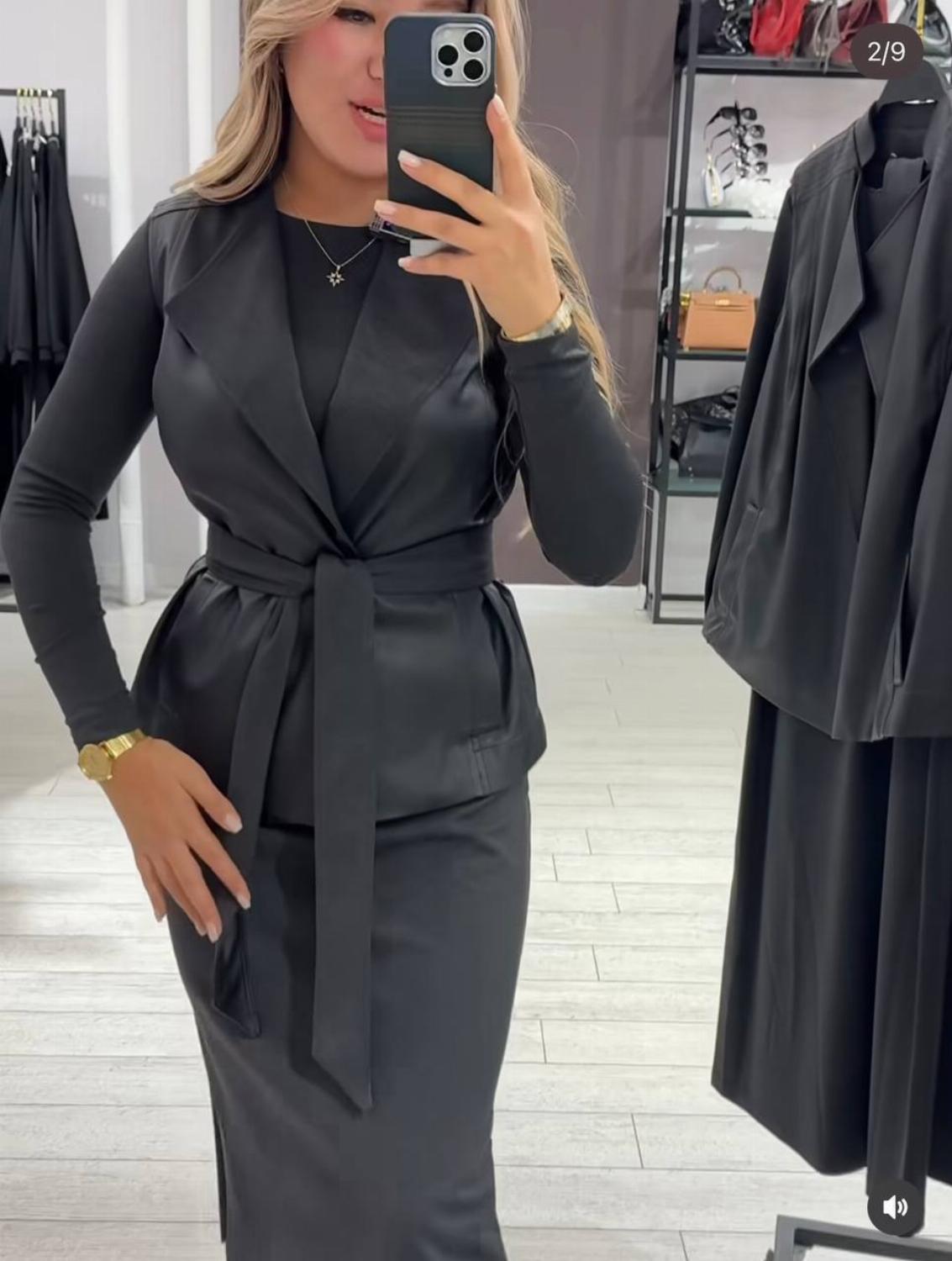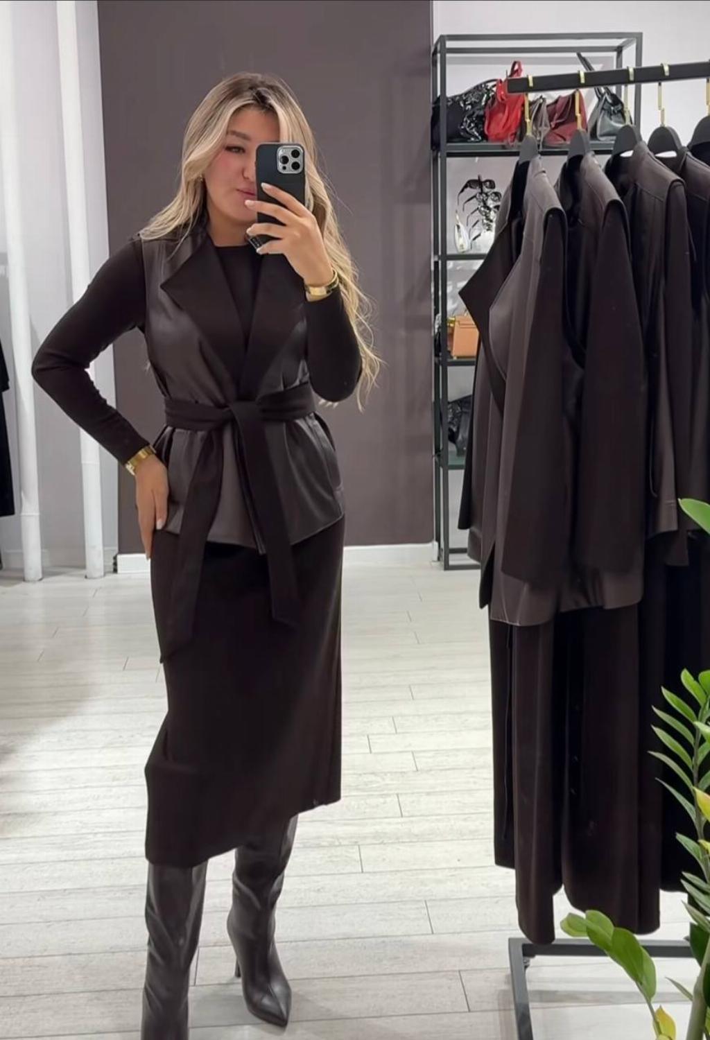 • Жилет — преміальна екокожа (акуратний крій, пояс для акценту на талії)