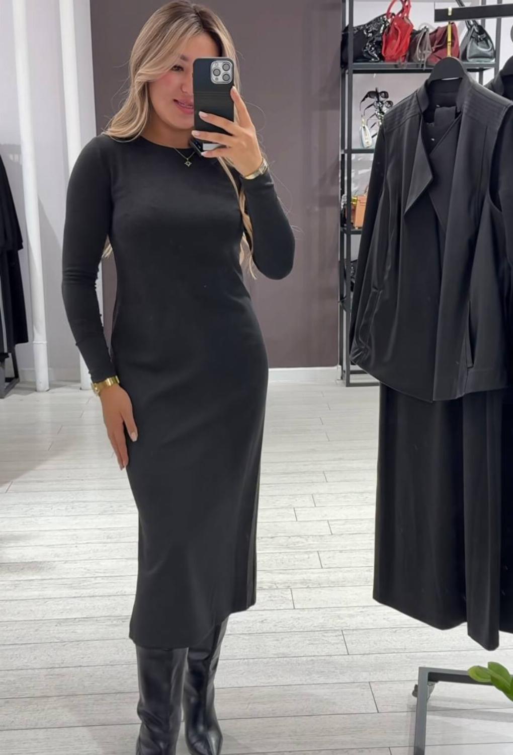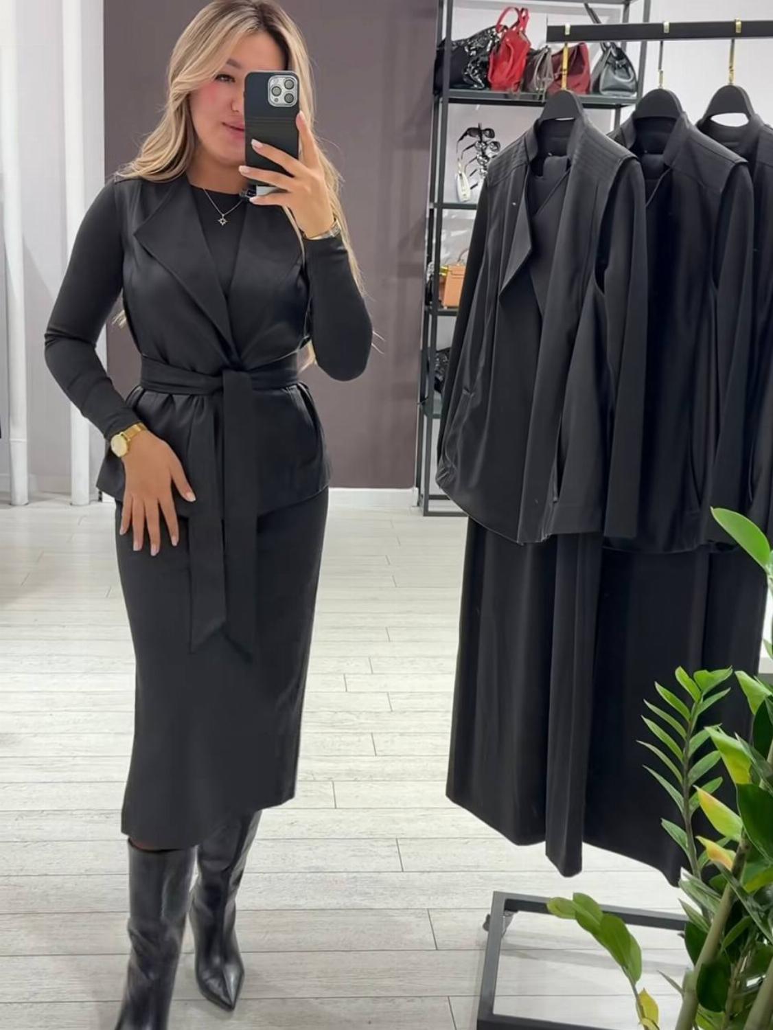 Стильний та жіночний костюм, створений для тих, хто цінує комфорт і сучасну елегантність. Комплект складається з теплої трикотажної сукні на байці та трендового жилета з екокожі — ідеальне поєднання затишку й вишуканості.
