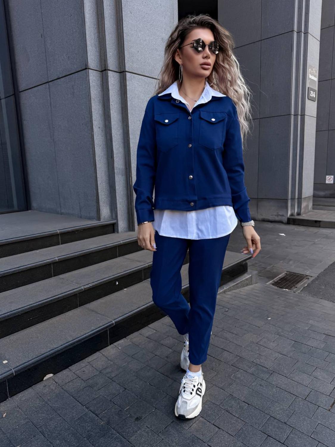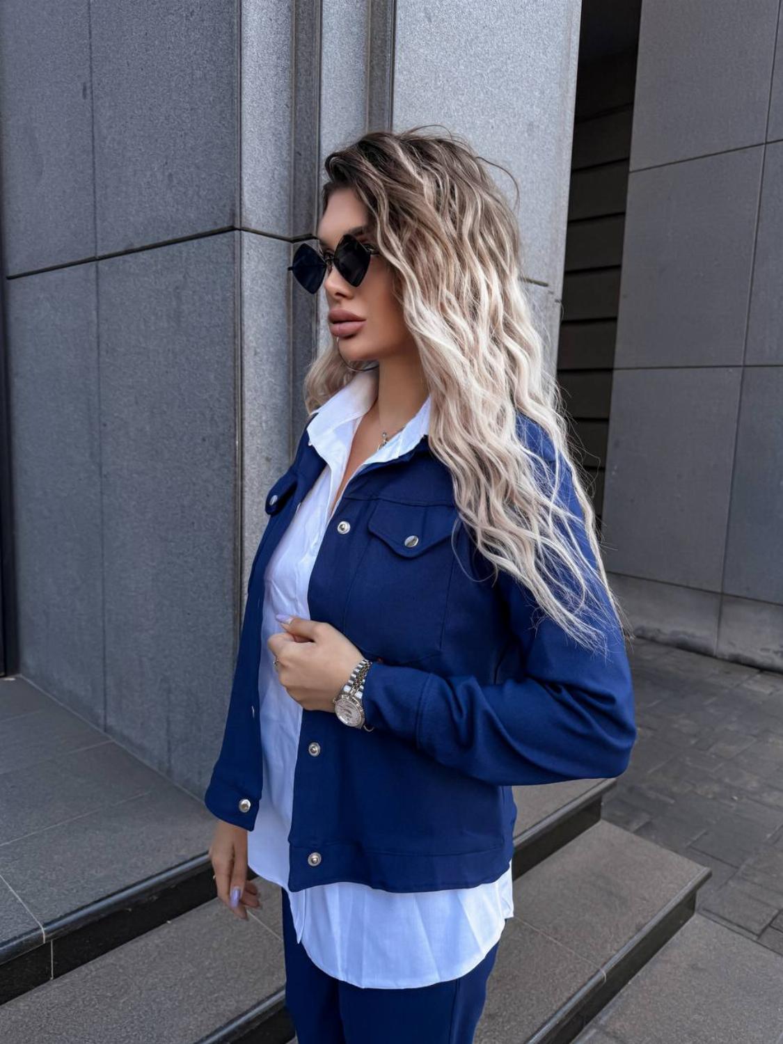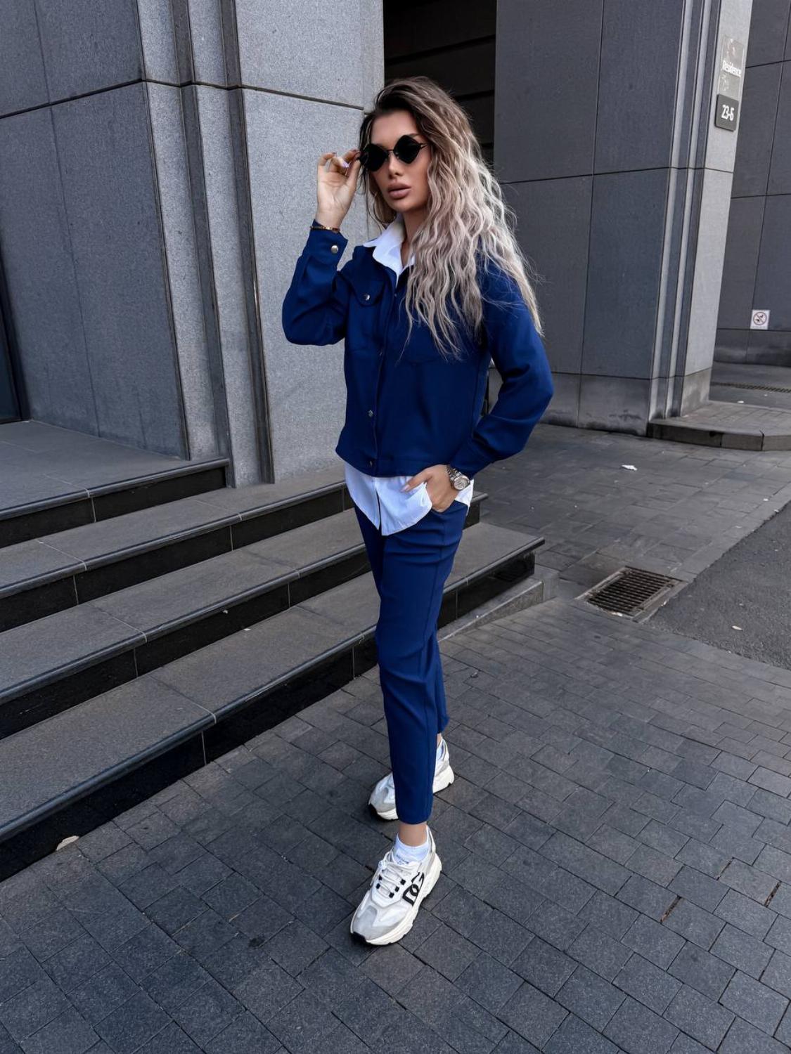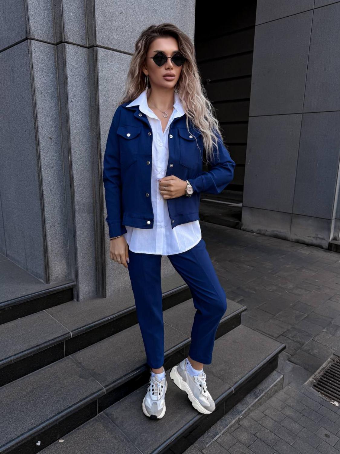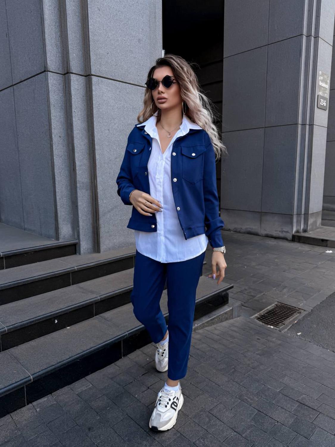 Стильний жіночий джинсовий брючний костюм-трійка з сорочкою «New York» - це вдале поєднання спортивних і класичних елементів. Костюм виконаний з дорогих і якісних матеріалів, складається з трендових котонових куртки з брюками 7/8 і модної сорочки з бенгаліну. Завдяки оригінальному дизайну він ідеально підходить для виходів в стилі кежуал і смарт-кежуал. Кожен елемент костюма можна носити окремо і поєднувати з іншими речами.