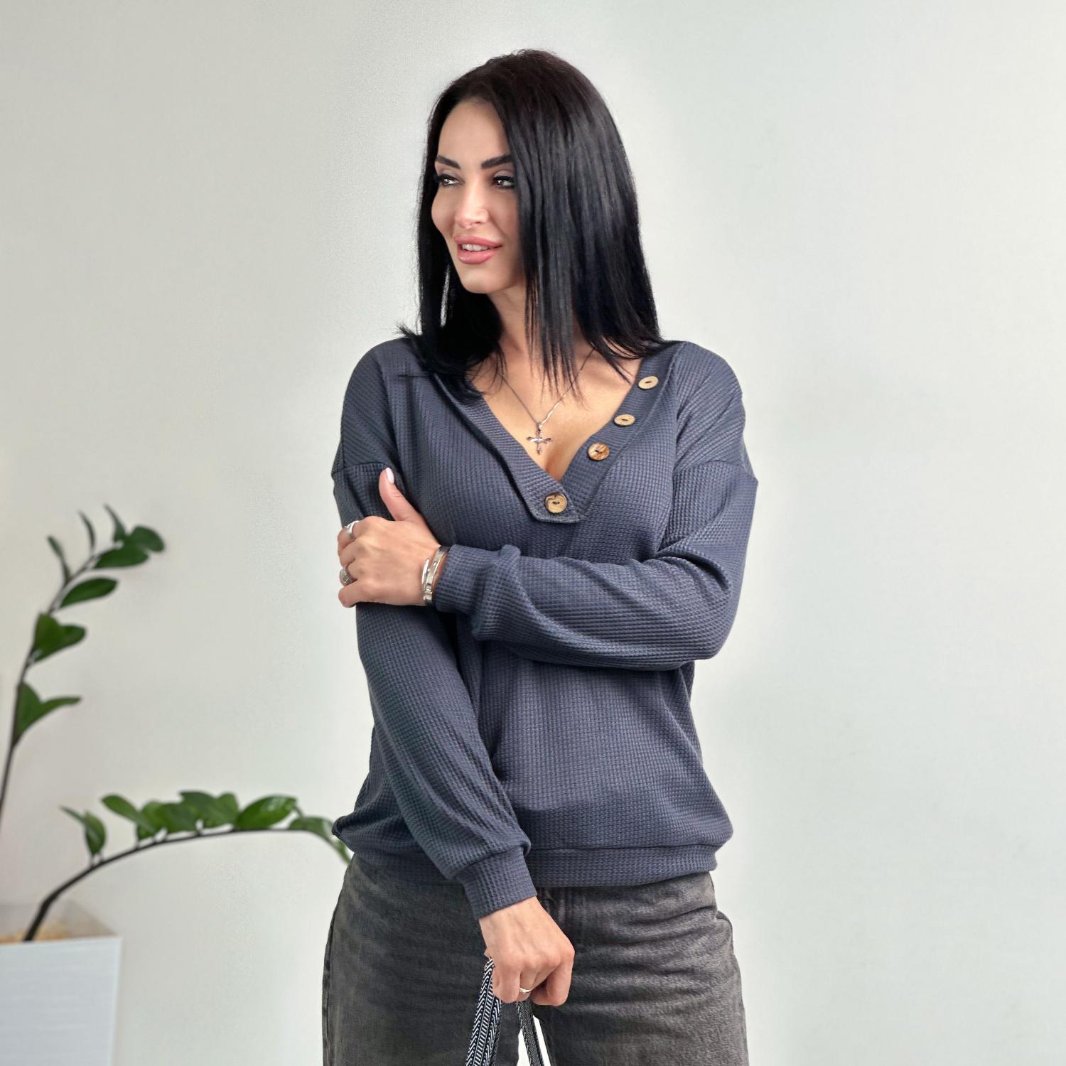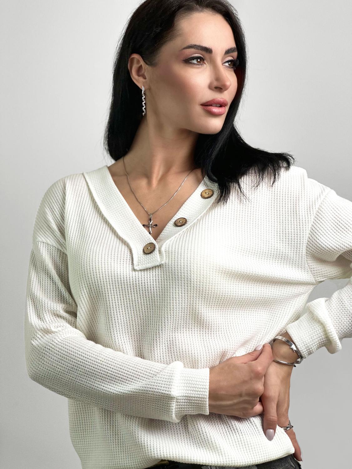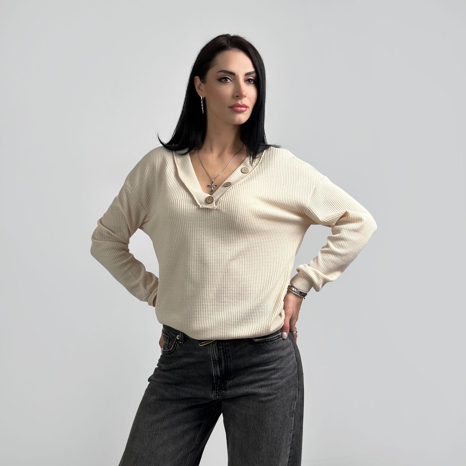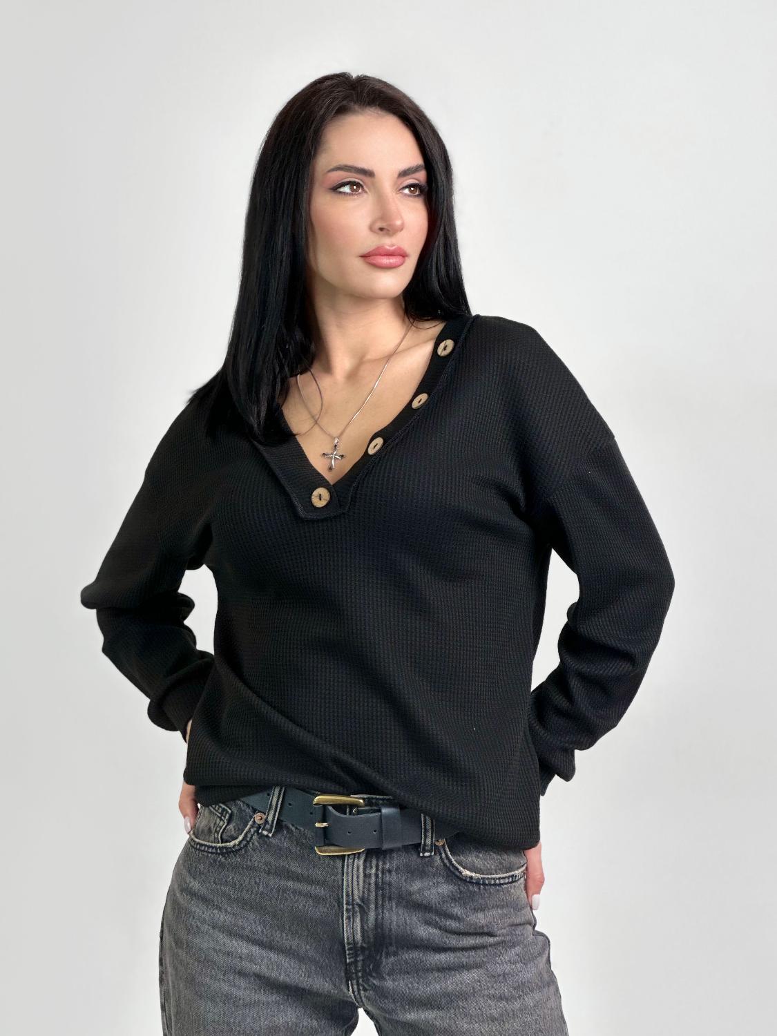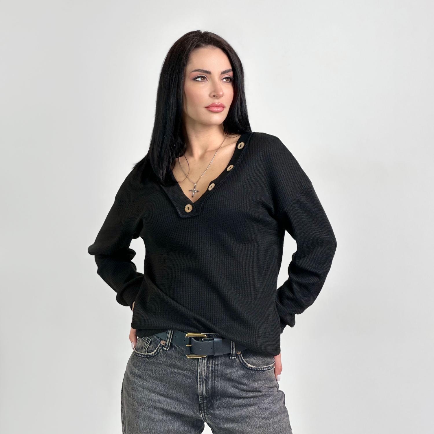 Контрастні гудзики на комірі акцентують увагу на декольте, а манжети на рукавах та по нижньому краю виробу забезпечують ідеальну посадку. Рельєфний трикотаж "вафелька" безсумнівно прикрасить будь-який образ, роблячи його більш розкішним і незабутнім.