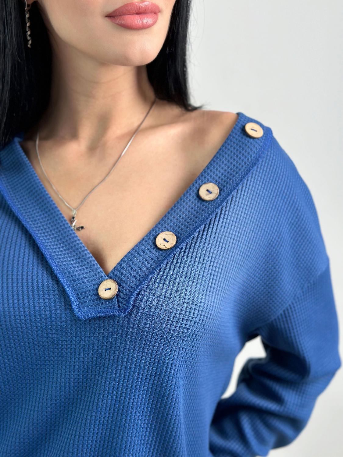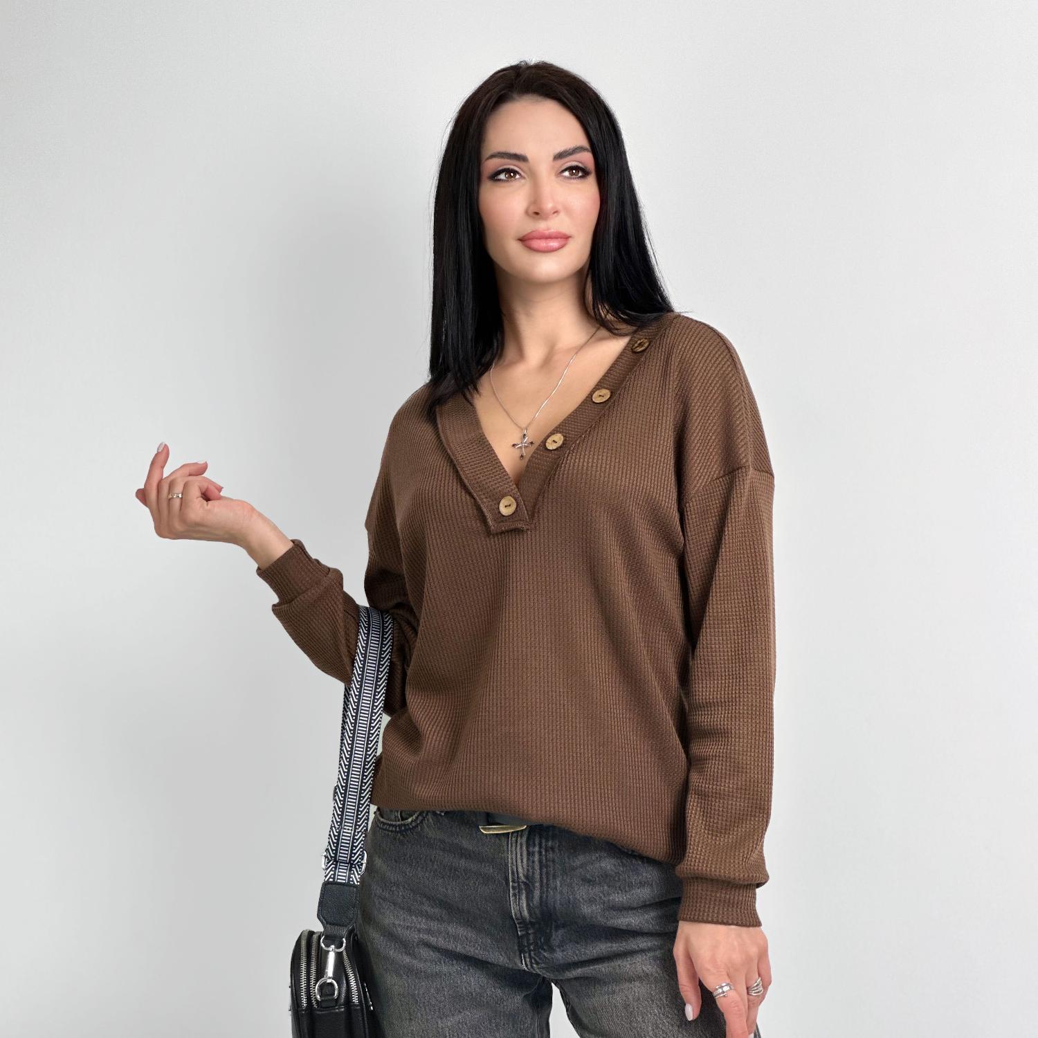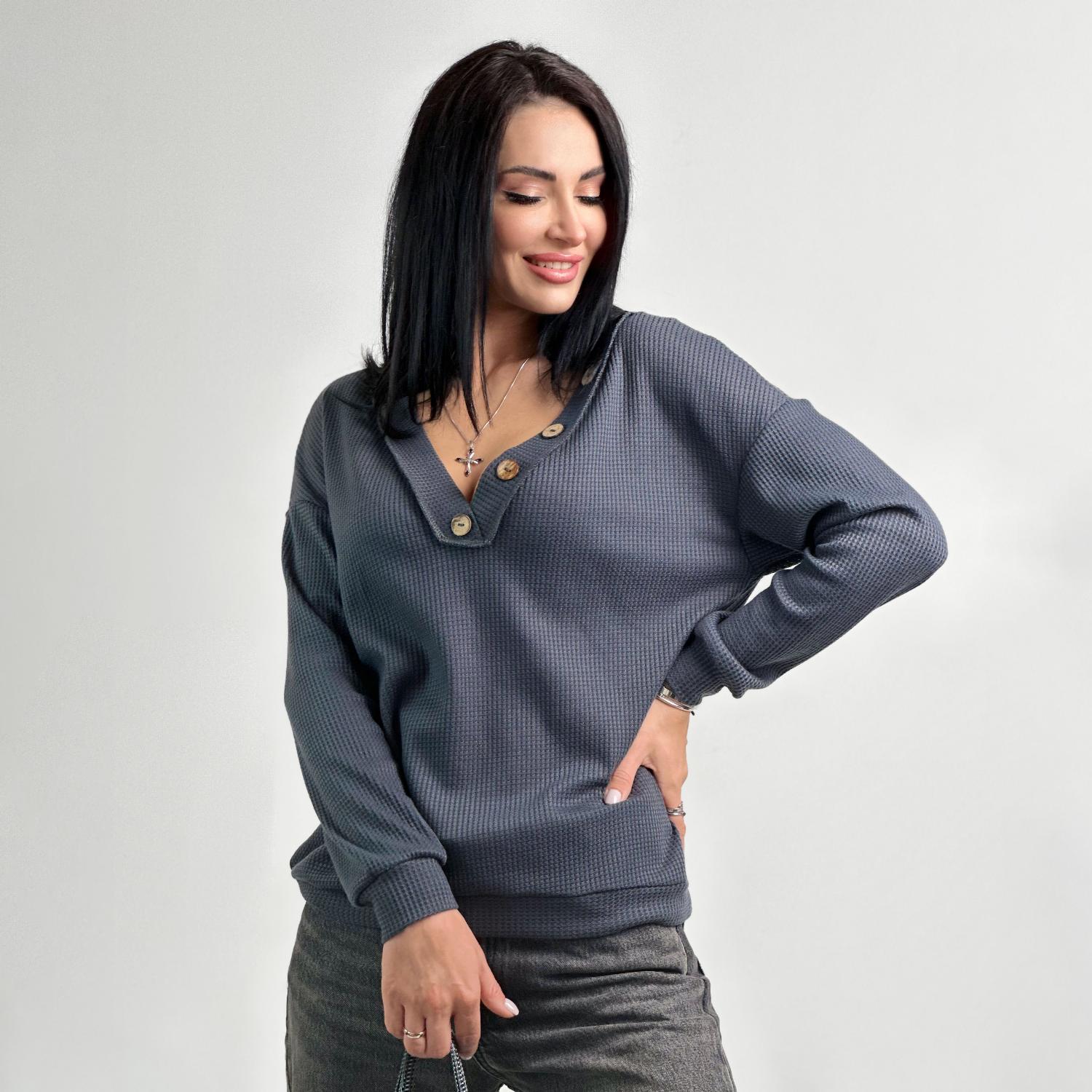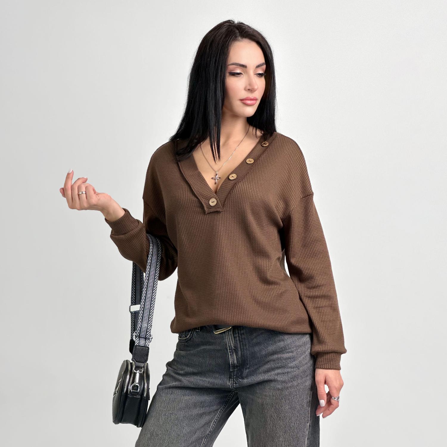 Контрастні гудзики на комірі акцентують увагу на декольте, а манжети на рукавах та по нижньому краю виробу забезпечують ідеальну посадку. Рельєфний трикотаж "вафелька" безсумнівно прикрасить будь-який образ, роблячи його більш розкішним і незабутнім.