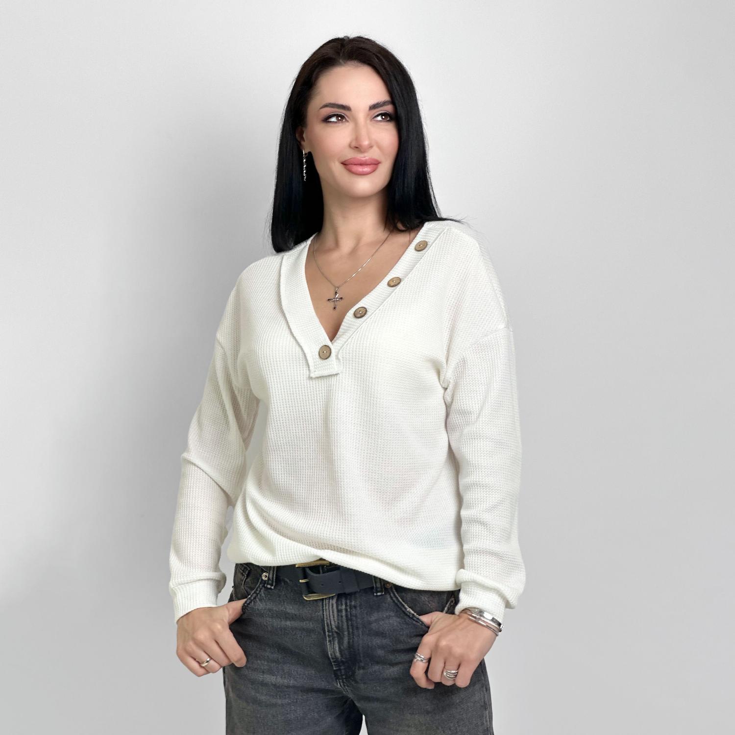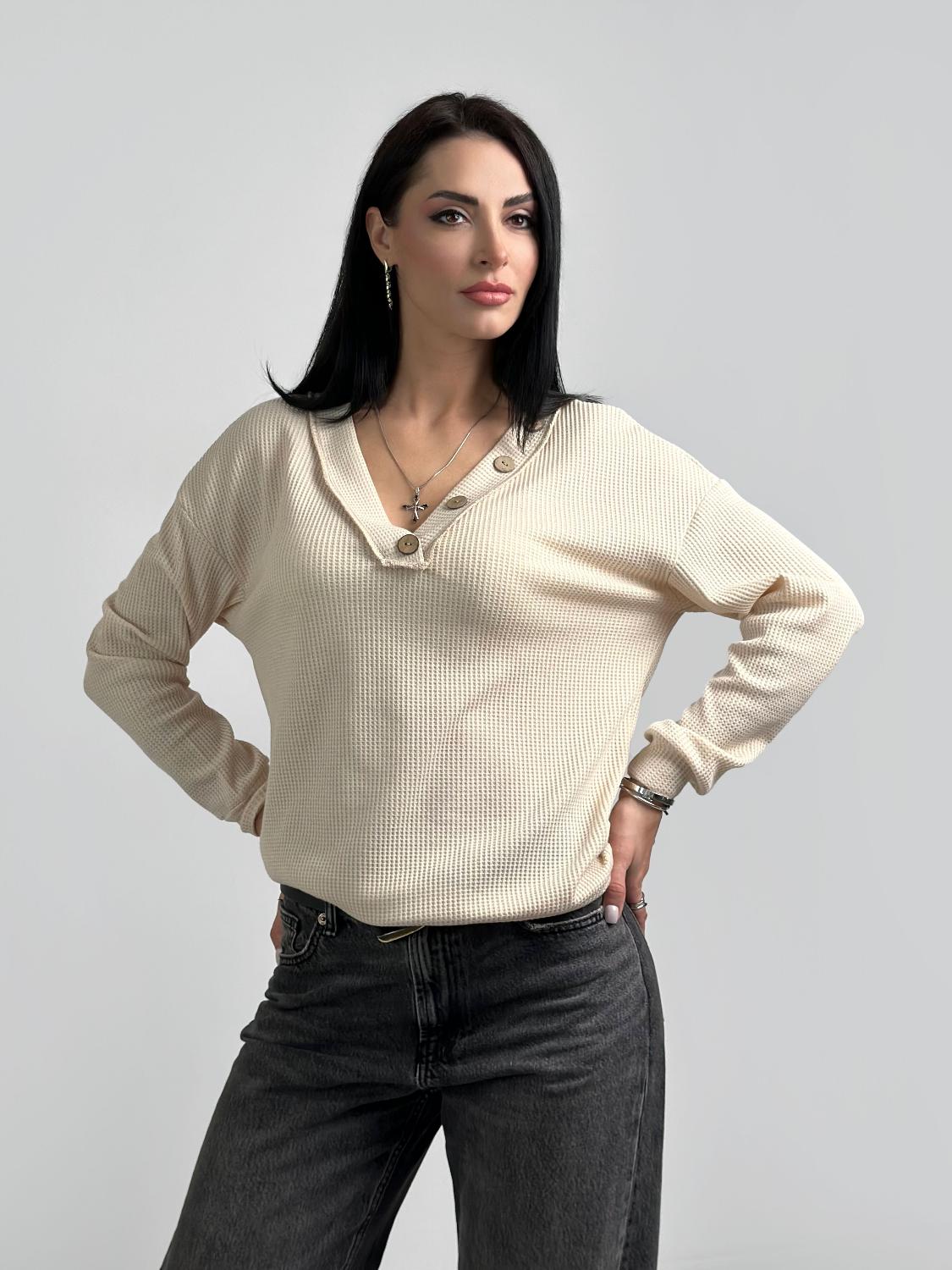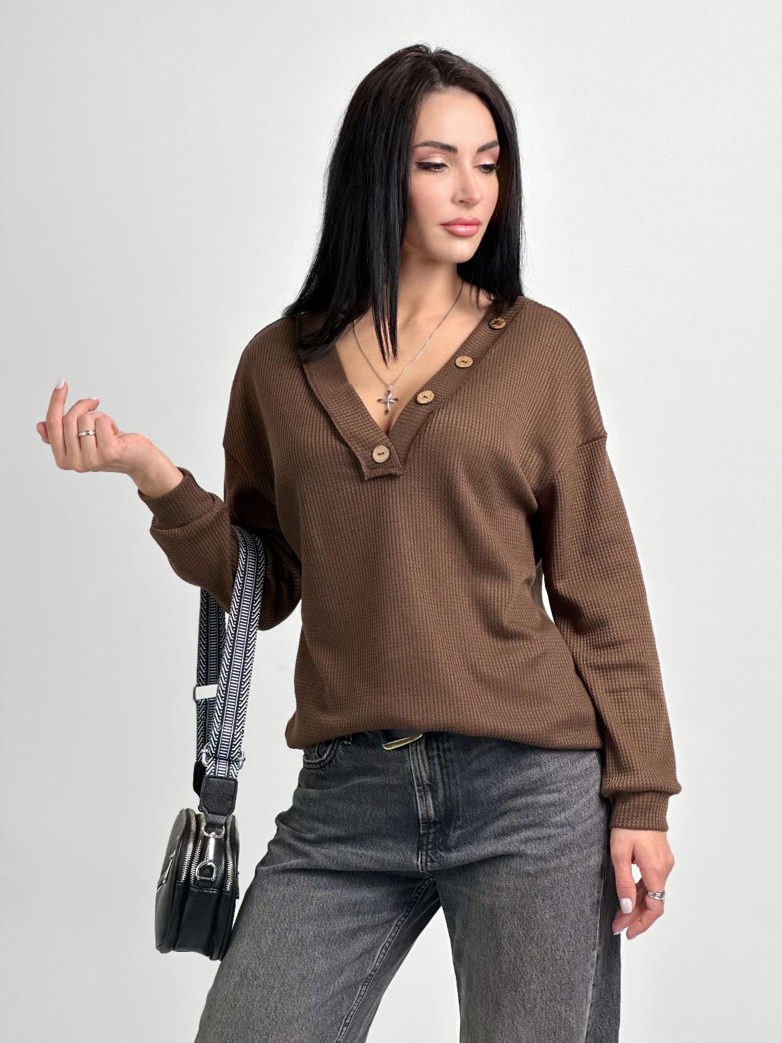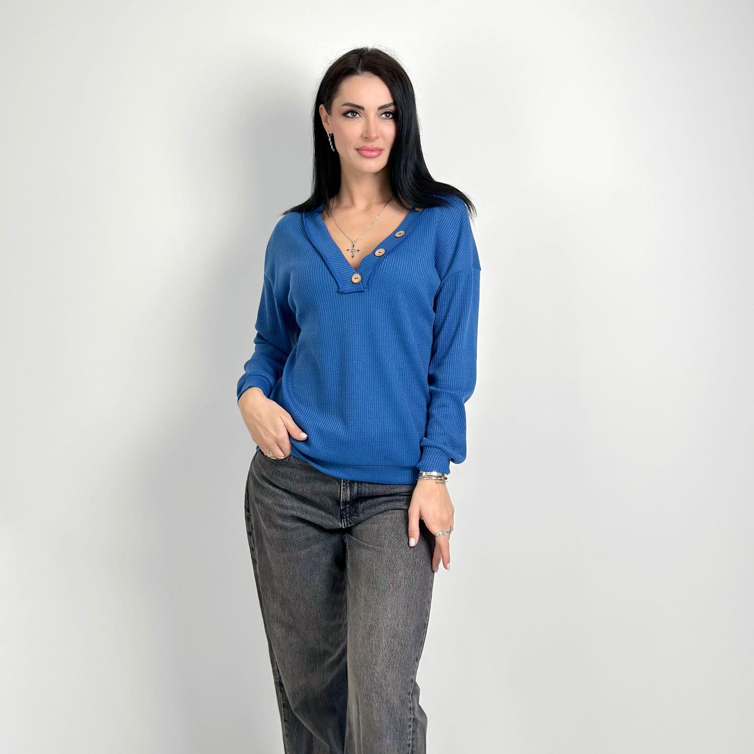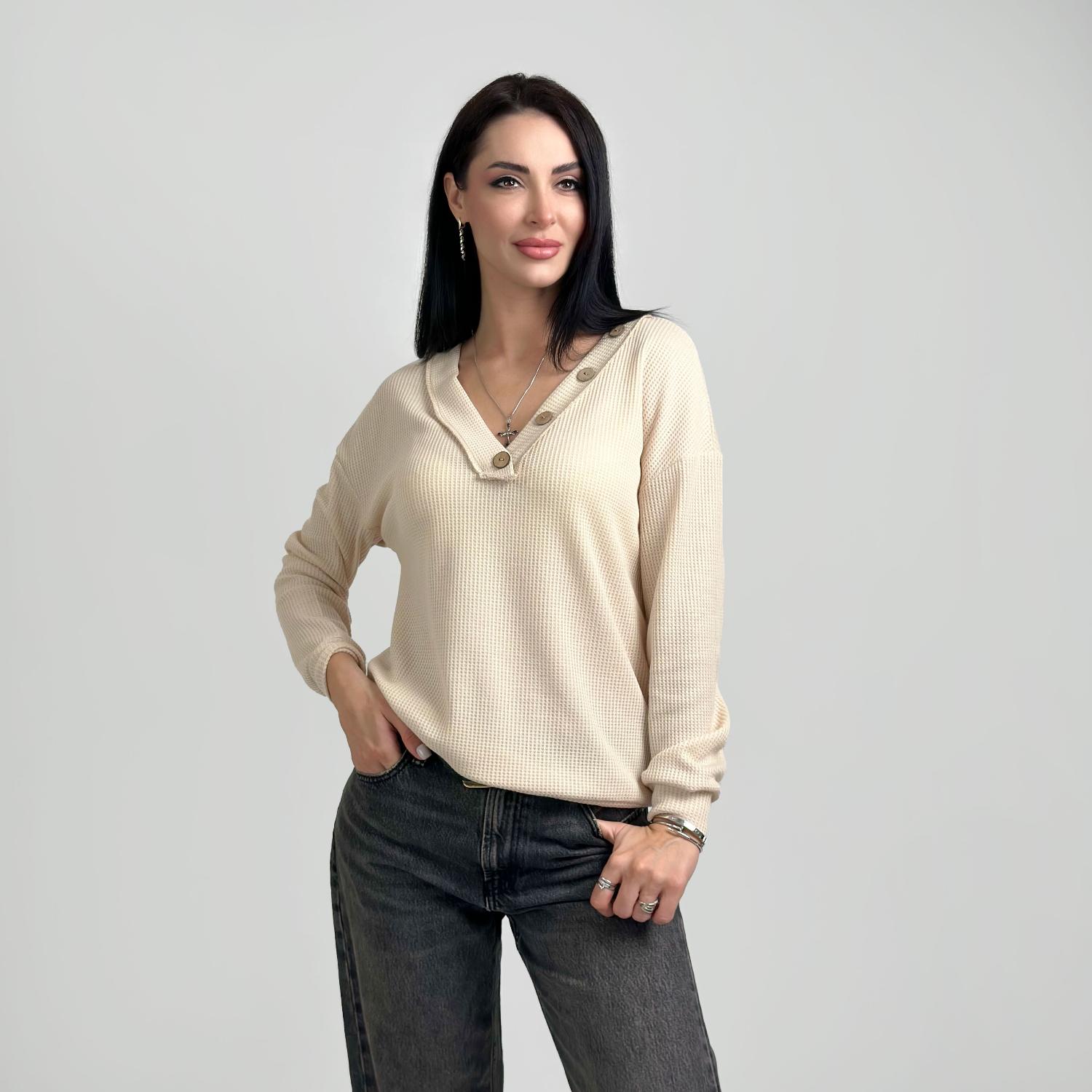Контрастні гудзики на комірі акцентують увагу на декольте, а манжети на рукавах та по нижньому краю виробу забезпечують ідеальну посадку. Рельєфний трикотаж "вафелька" безсумнівно прикрасить будь-який образ, роблячи його більш розкішним і незабутнім.