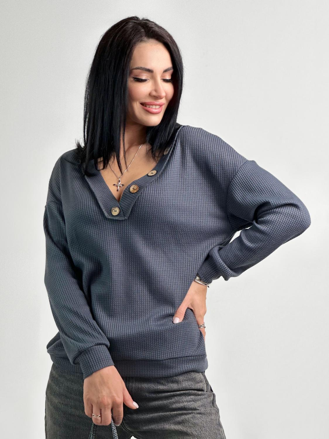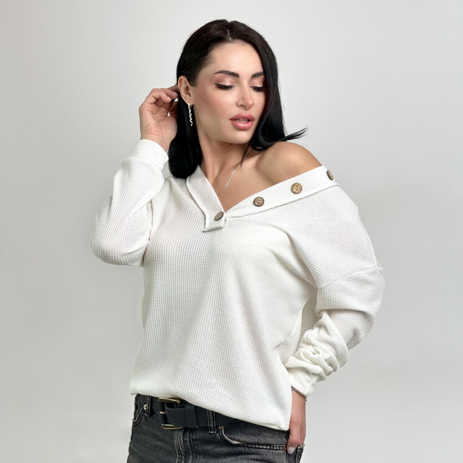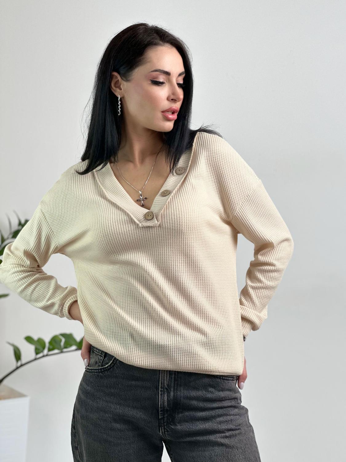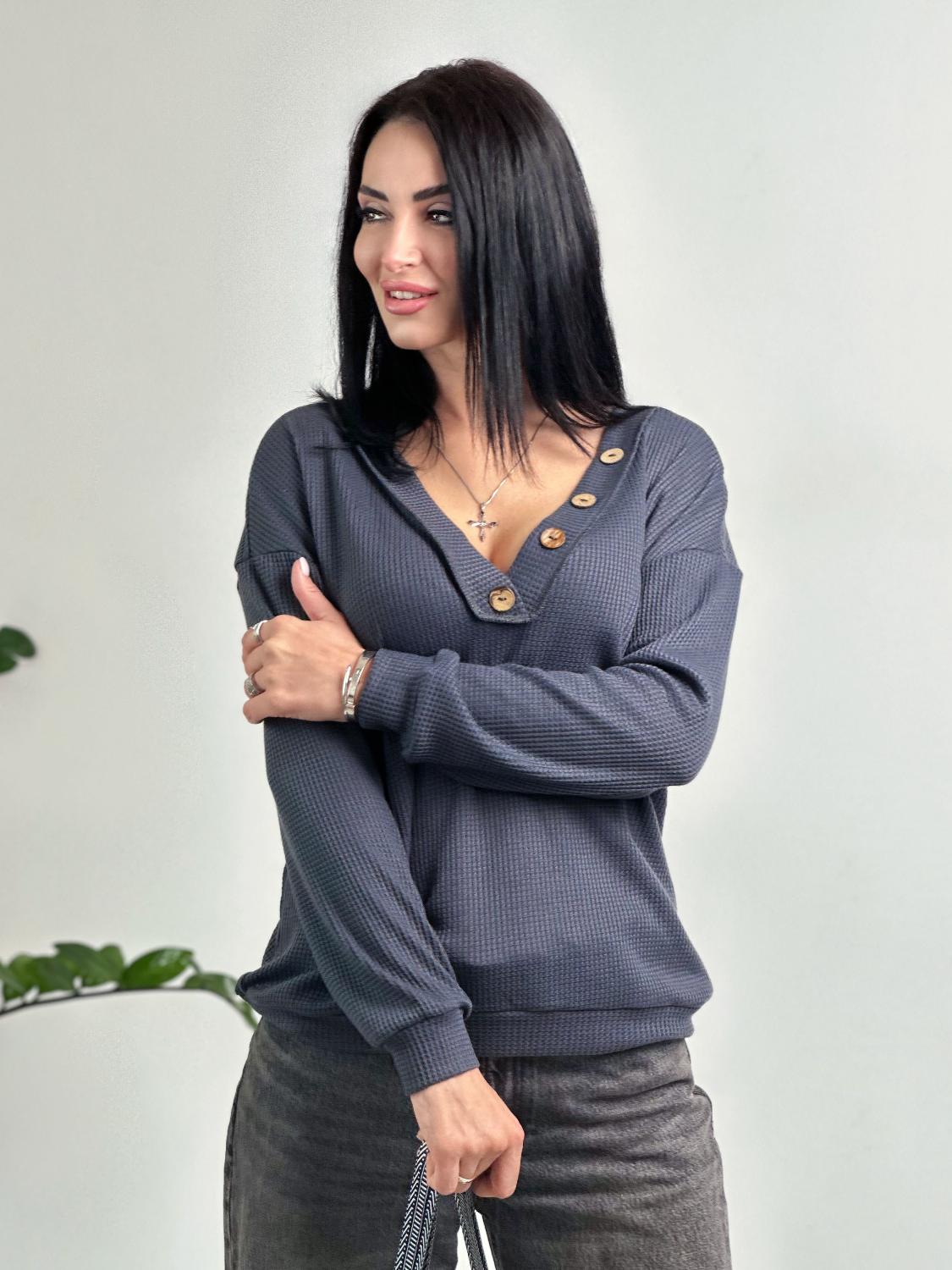 Контрастні гудзики на комірі акцентують увагу на декольте, а манжети на рукавах та по нижньому краю виробу забезпечують ідеальну посадку. Рельєфний трикотаж "вафелька" безсумнівно прикрасить будь-який образ, роблячи його більш розкішним і незабутнім.