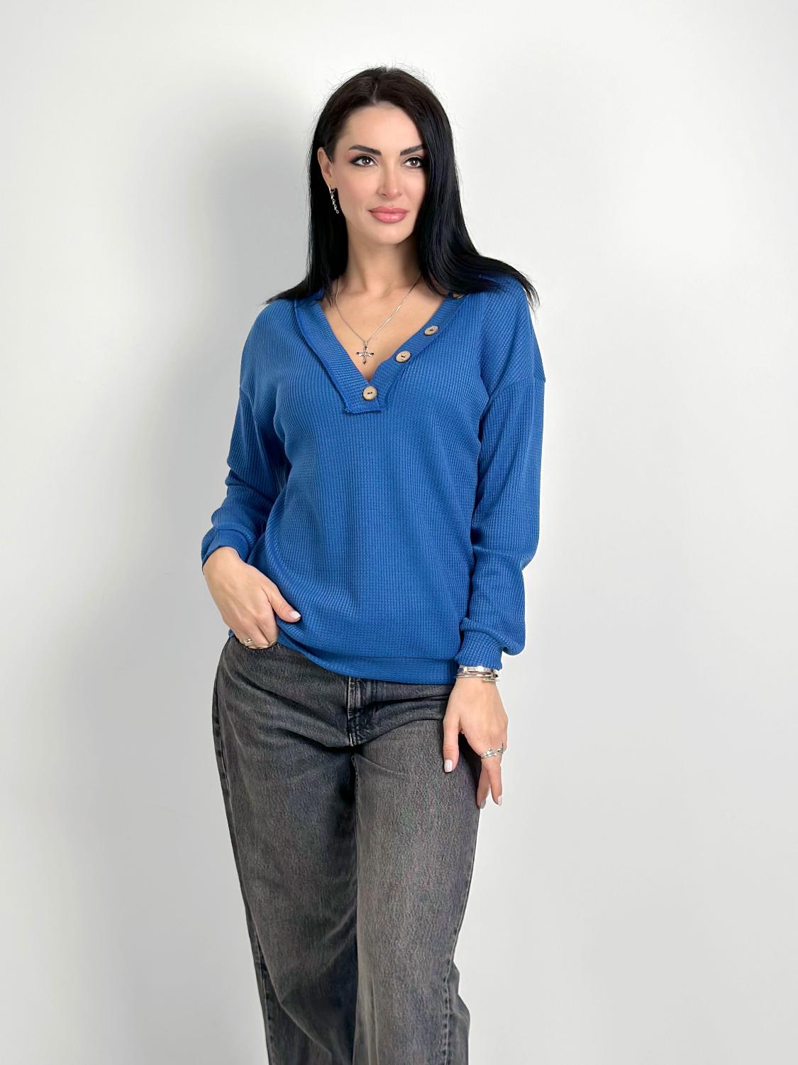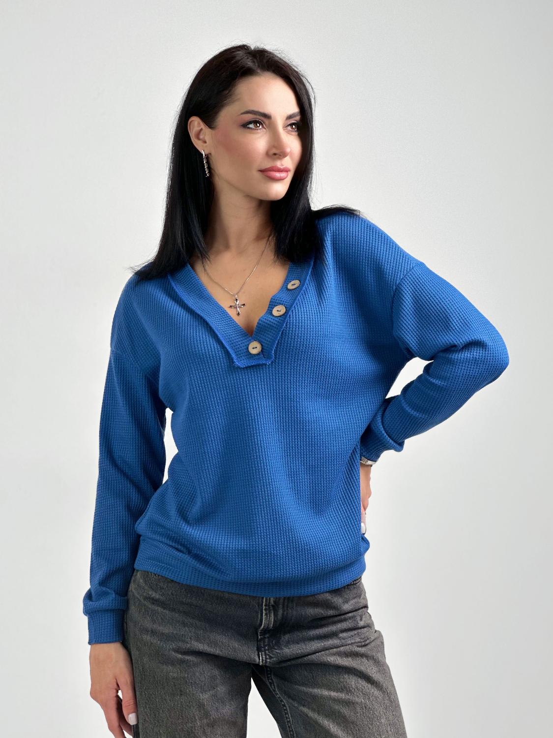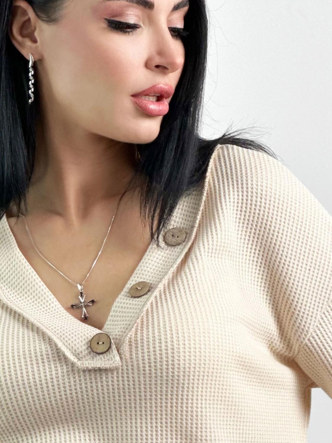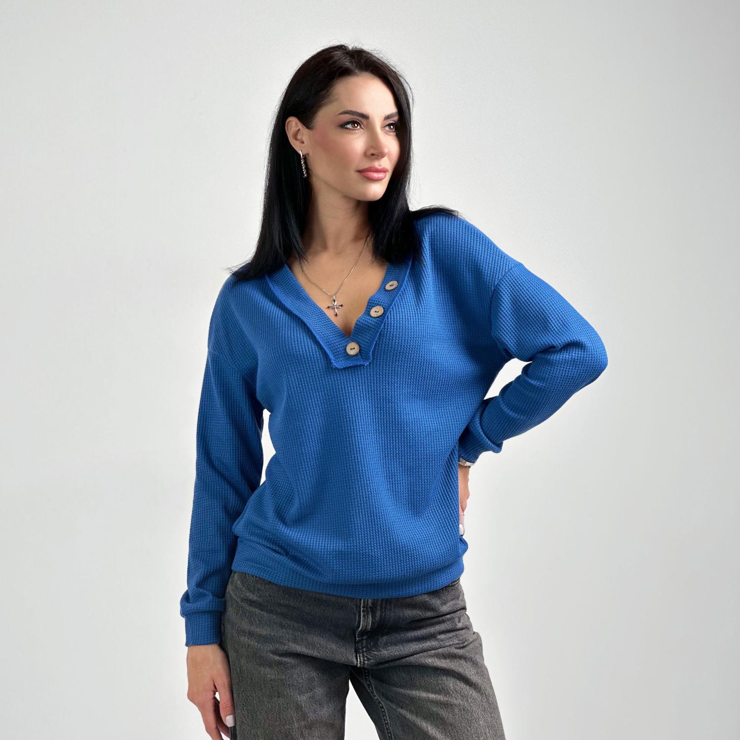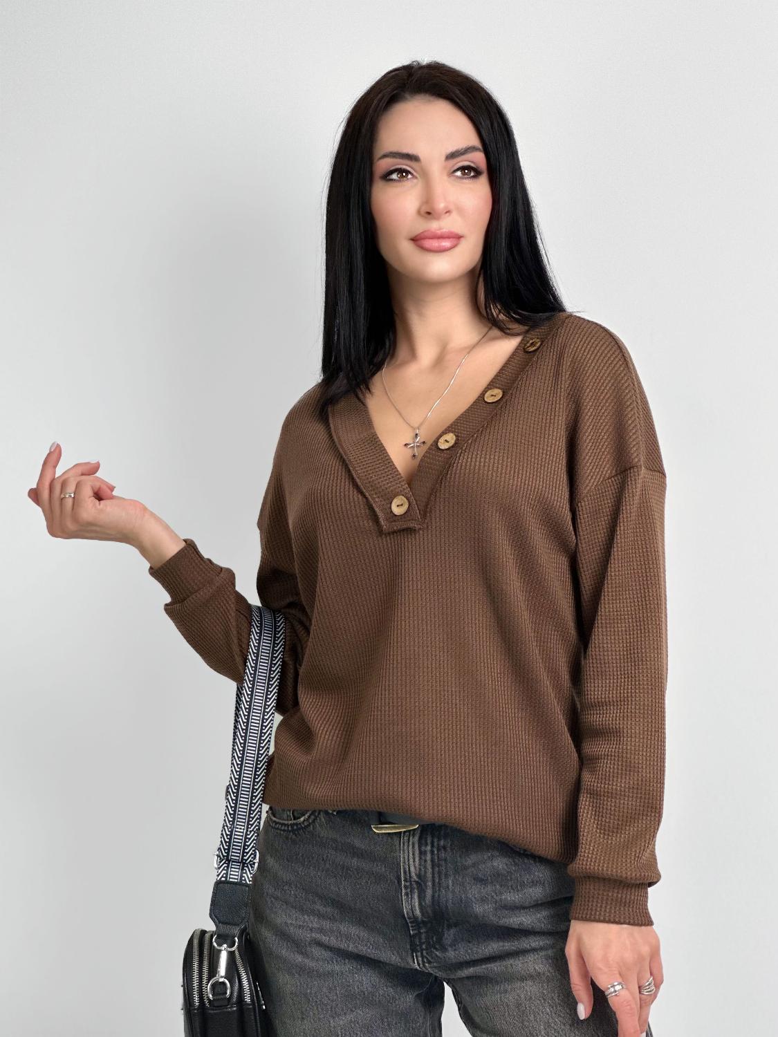 Контрастні гудзики на комірі акцентують увагу на декольте, а манжети на рукавах та по нижньому краю виробу забезпечують ідеальну посадку. Рельєфний трикотаж "вафелька" безсумнівно прикрасить будь-який образ, роблячи його більш розкішним і незабутнім.