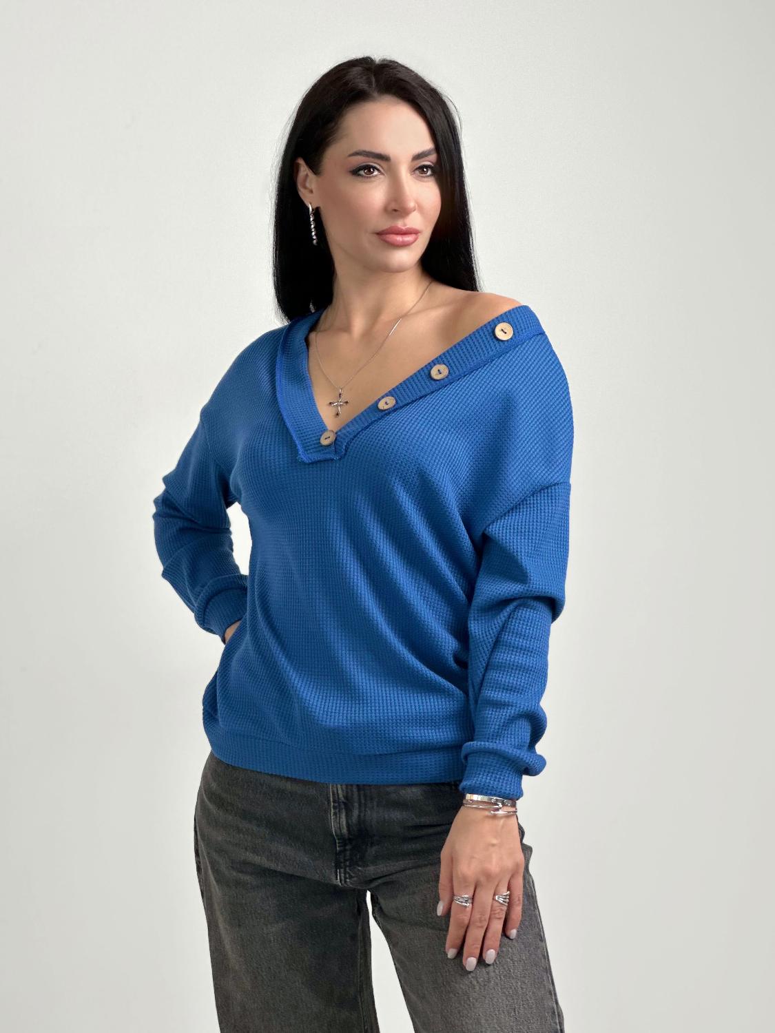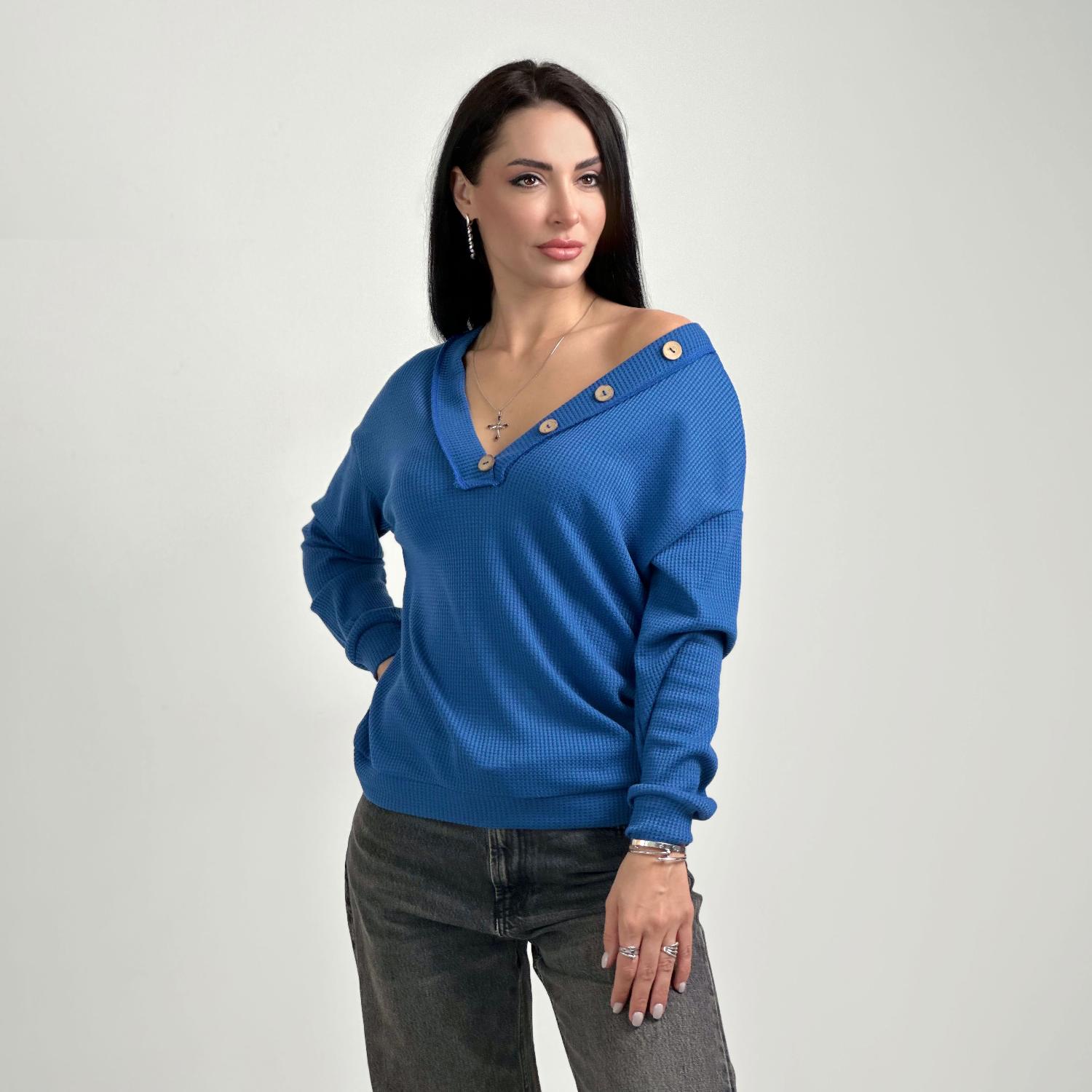 Дизайн пуловера – це вільний крій, спущені плечі та V-подібний виріз, що додає виробу стилю та комфорту.