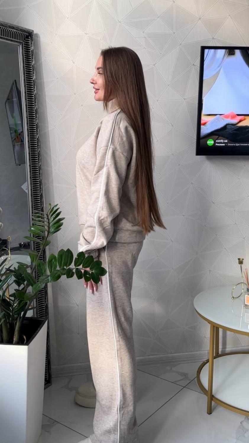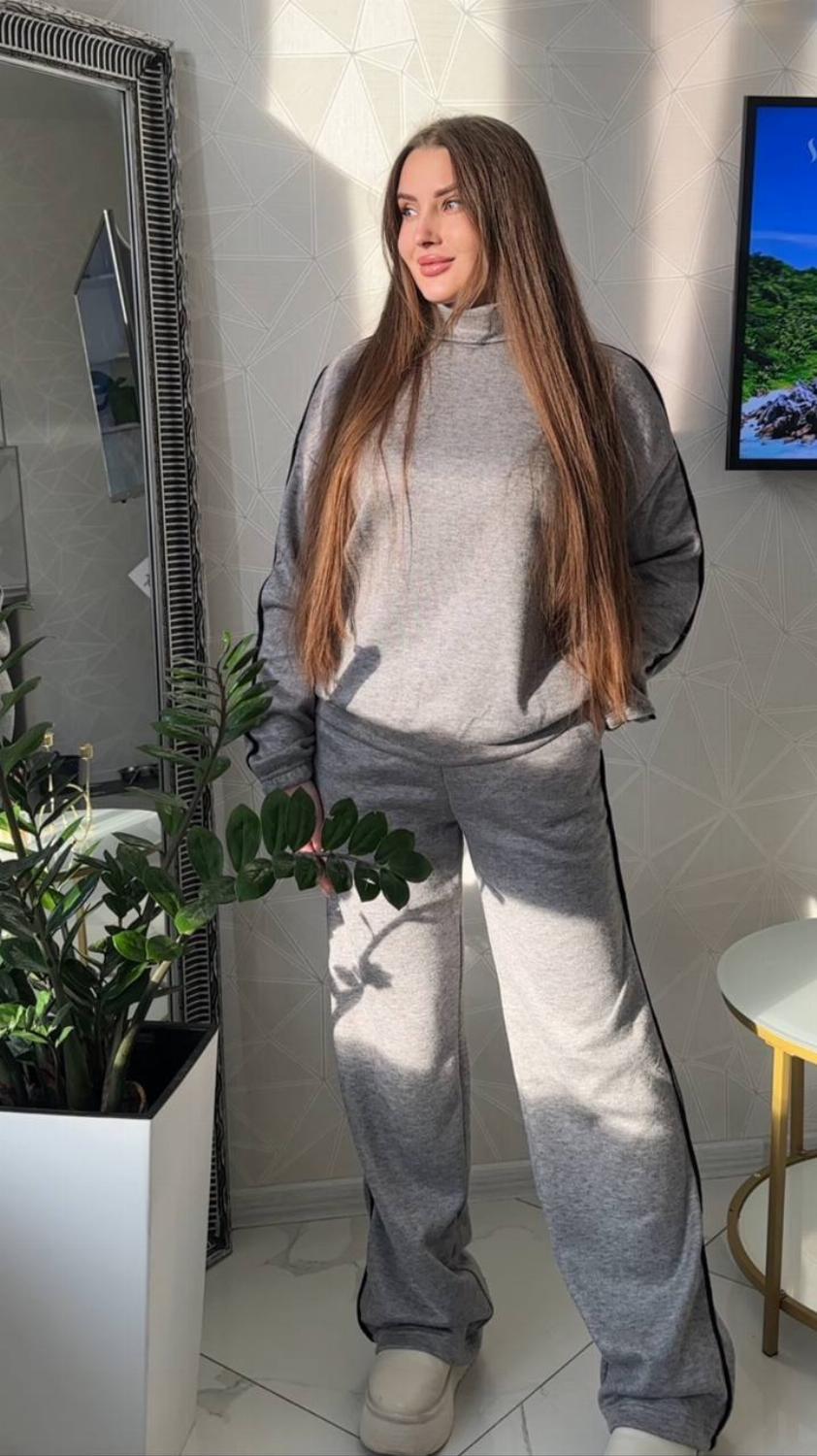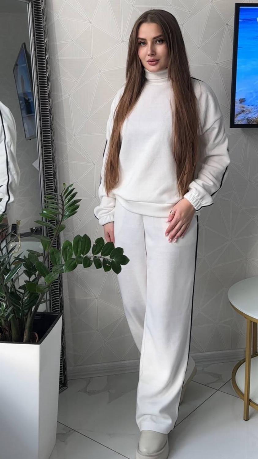 Зручний костюм Daffy виконаний з якісної та приємної тканини - ангора класу люкс. Виглядає дуже стильно, добре зберігає зовнішній вигляд навіть після численних прань. Така тканина відрізняється особливою ніжністю, хорошою зносостійкістю і гіпоалергенними властивостями. Костюм зі штанами можна носити хоч кожен день, а також його легко поєднувати окремо і з іншими речами. Змінюйте свій образ швидко та без зусиль.