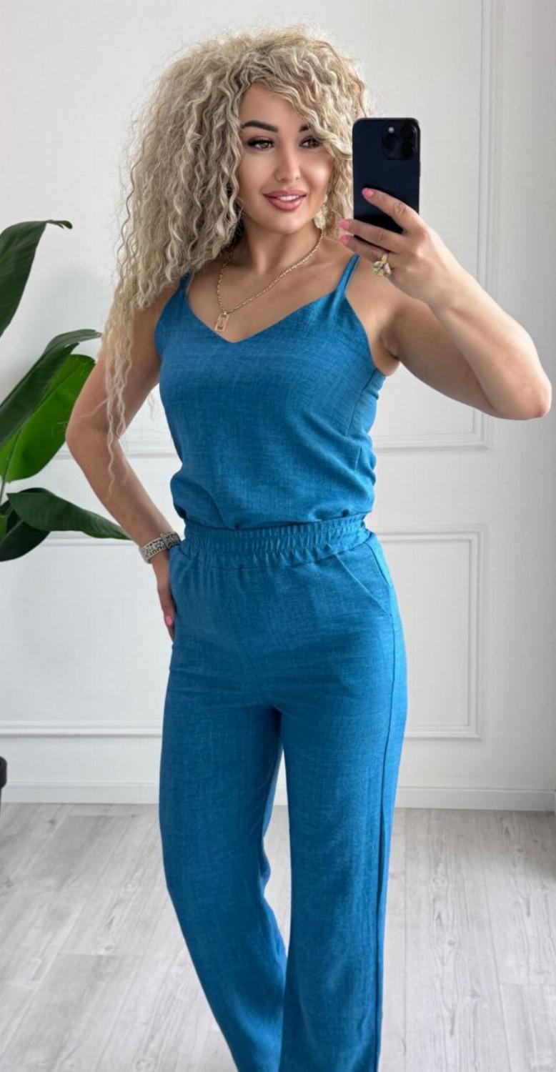 Низ: вільні прямі штани з високою посадкою та зручними кишенями — підкреслюють фігуру та забезпечують комфорт на кожен день.