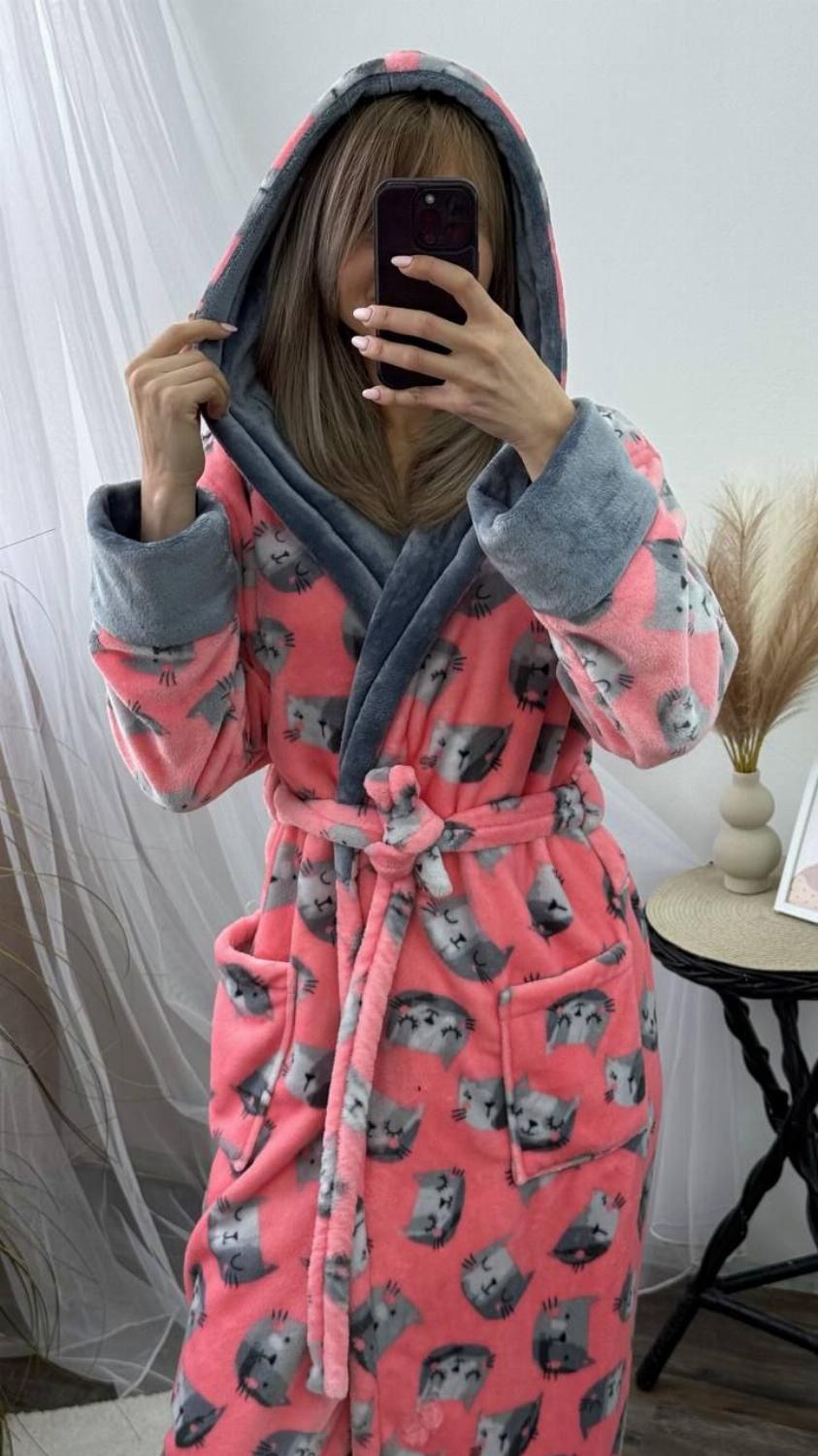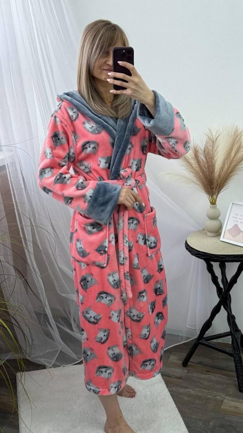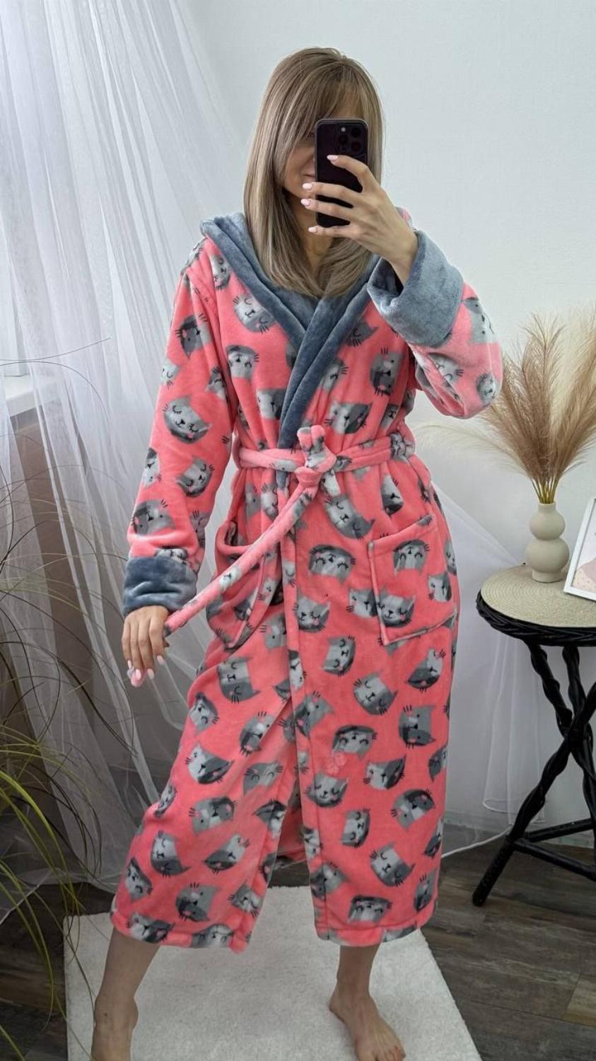 Довгий жіночий плюшевий халатик на запах з котиками "Адора"