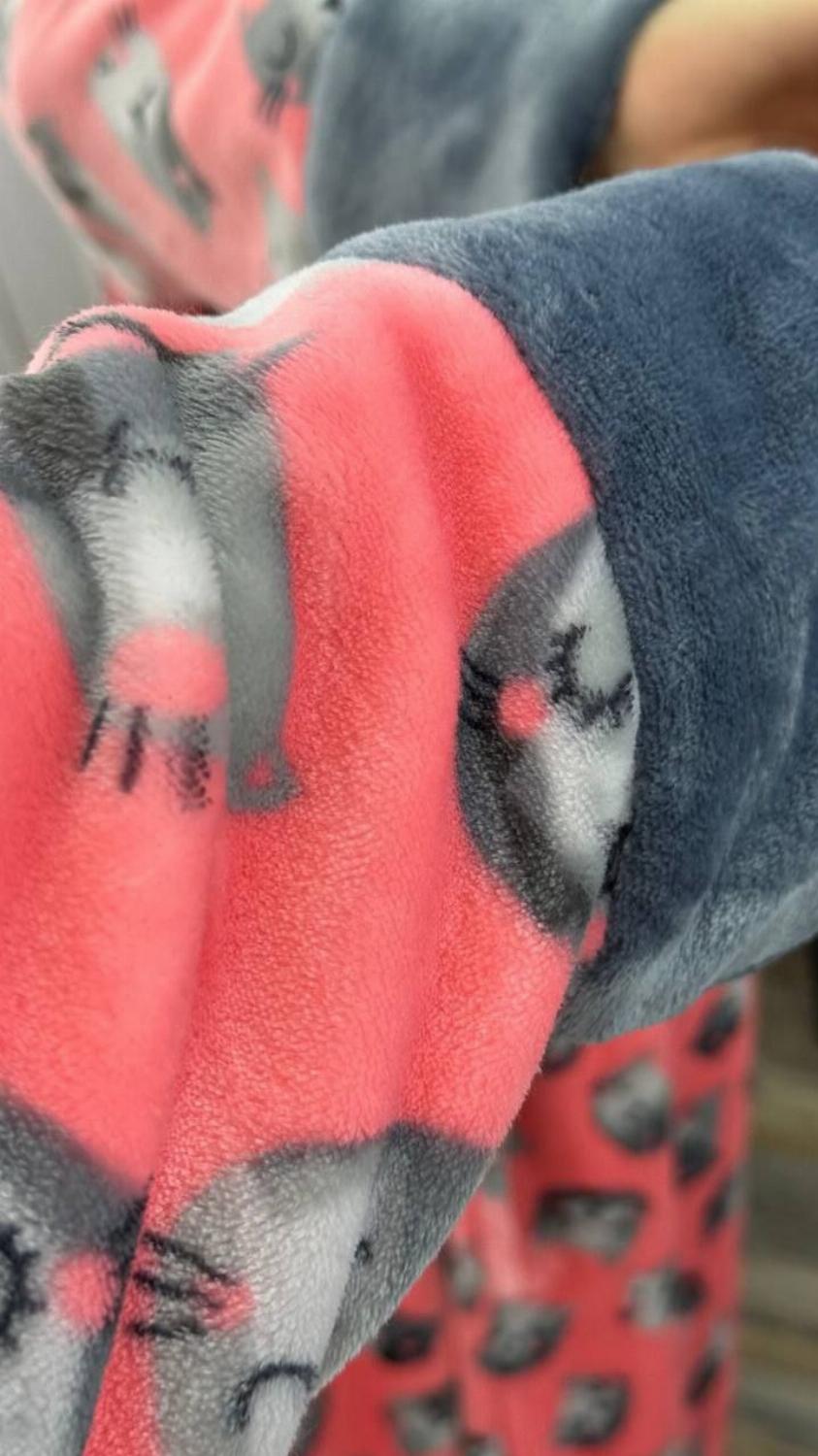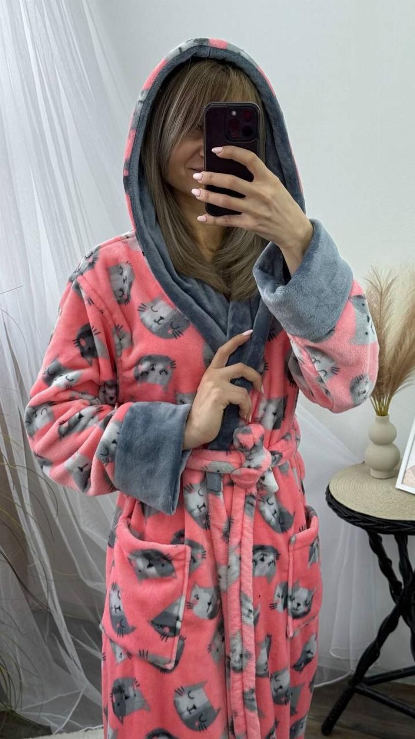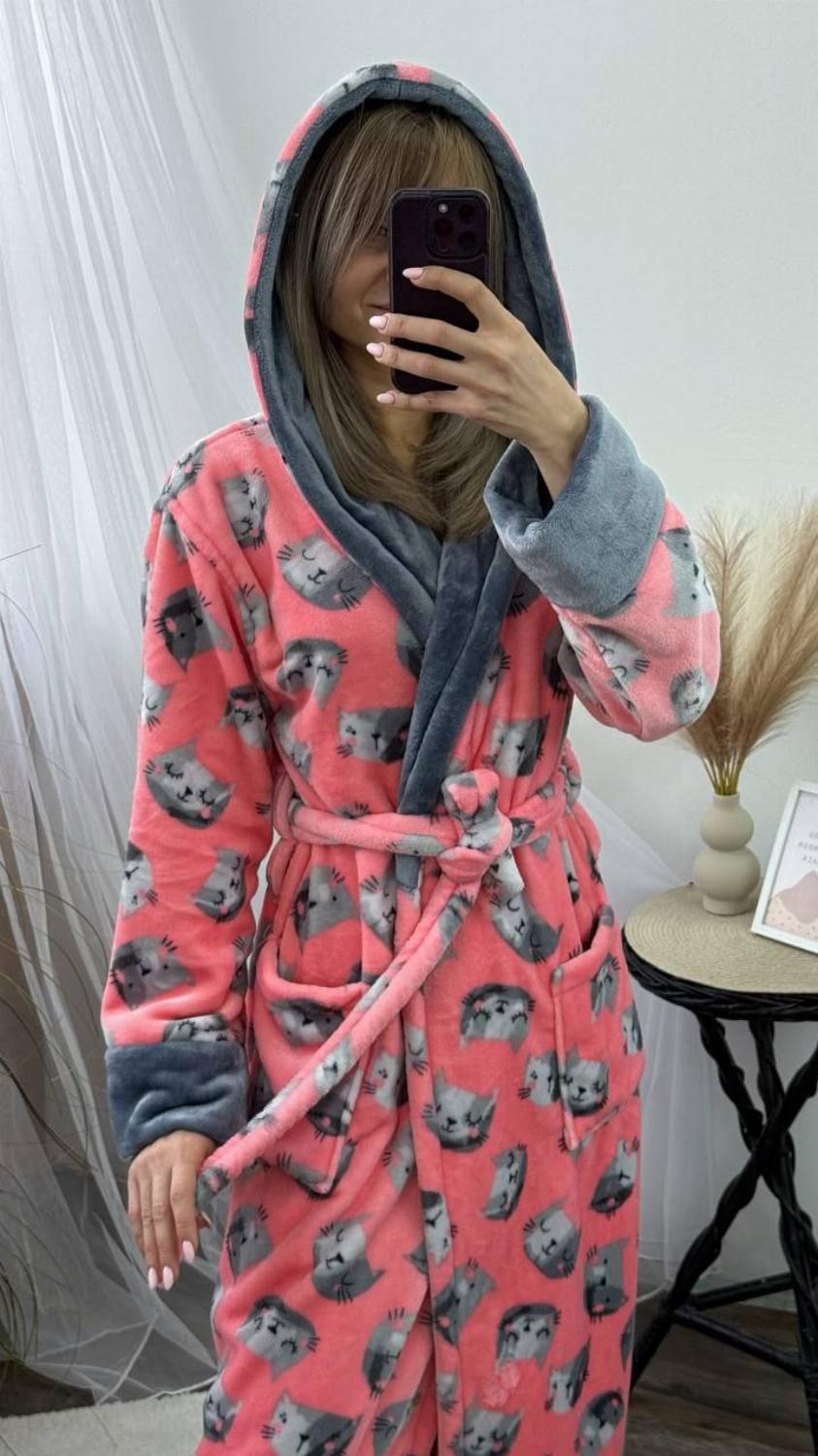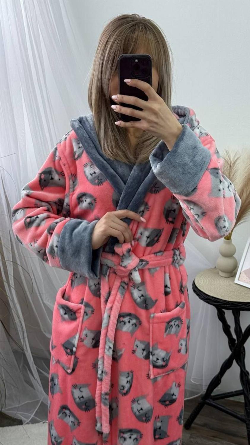 Довгий жіночий плюшевий халатик на запах з котиками "Адора"