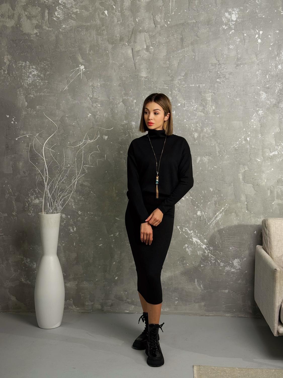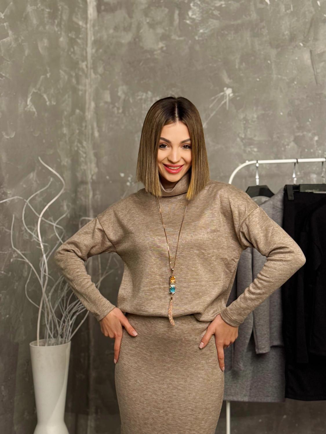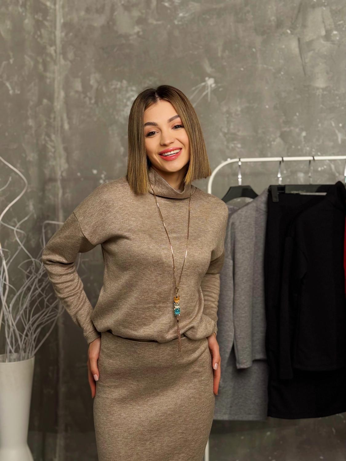 Актуальна новинка – жіночий ангоровий костюм "Valion". Стильний комплект-двійка складається зі спідниці та гольфу. Кофта з високим коміром вільно сідає по фігурі та добре захищає від холоду. Облягаюча спідниця міді підкреслює жіночний силует, але не сковує рухів. Низ костюма має високу посадку та м'який пояс на резинці.