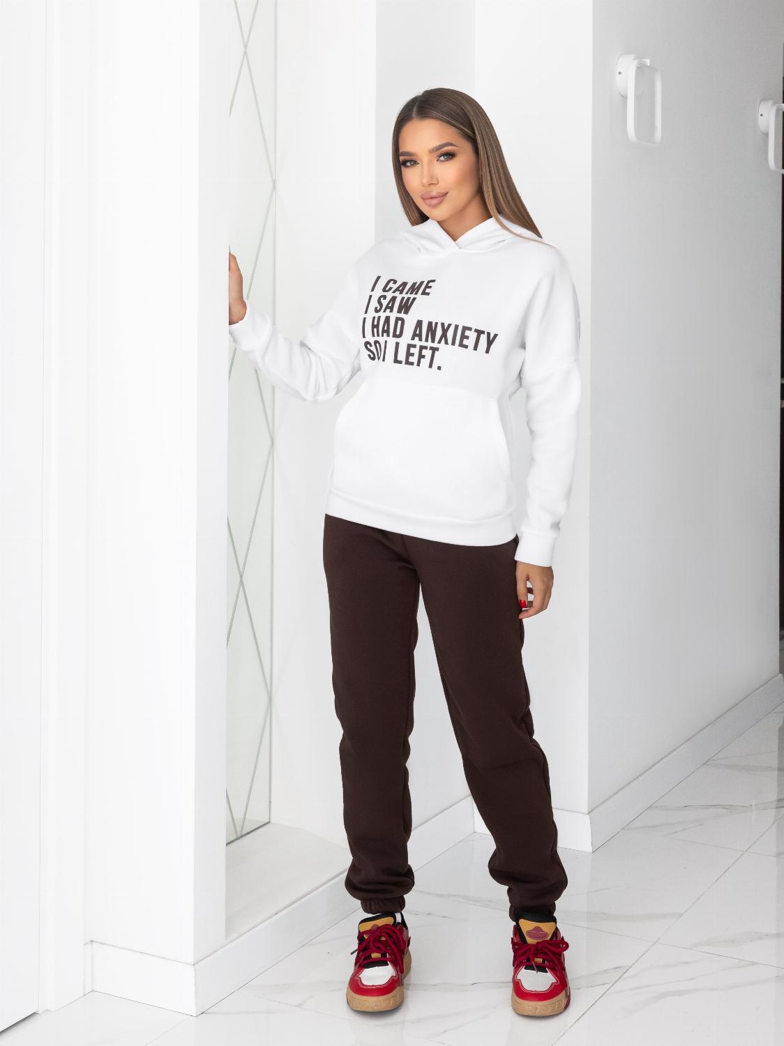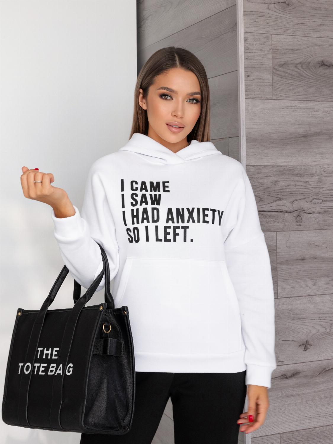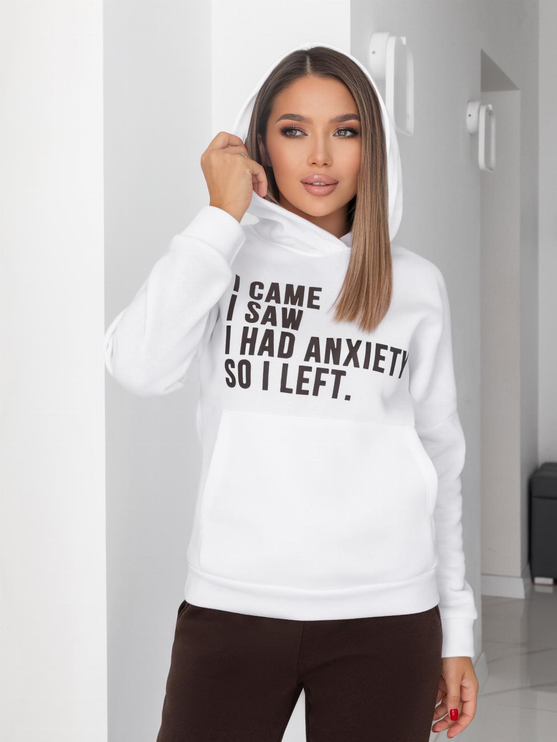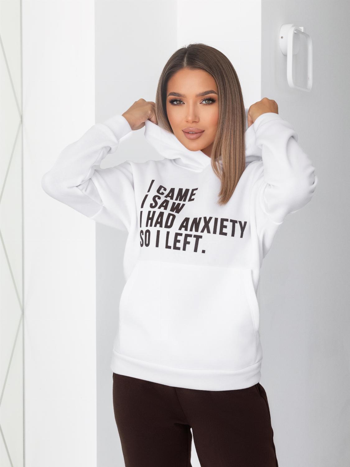 - Кофта виконана у форматі худі з об’ємним капюшоном та кишенею «кенгуру», яка додає не тільки зручності, а й стильності образу. Декорований сучасним принтом-написом, що підкреслює індивідуальність.
