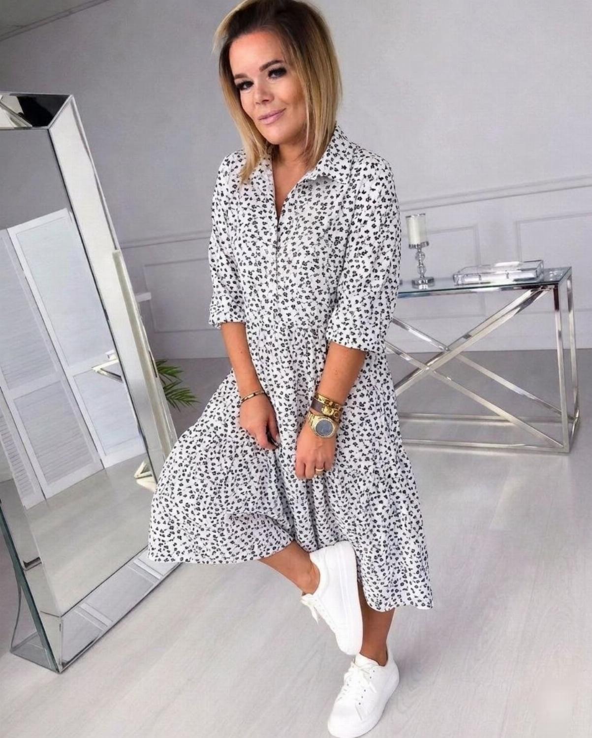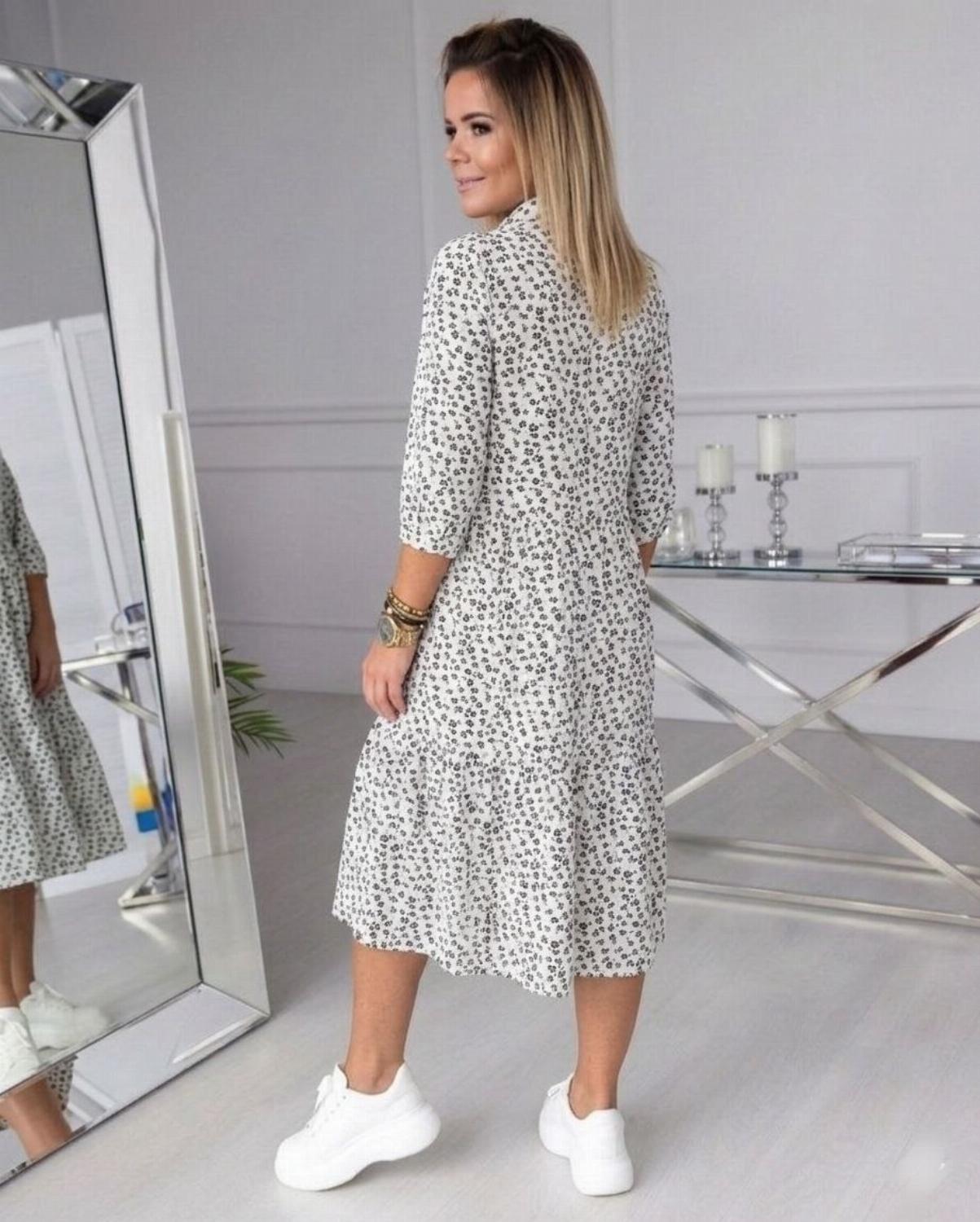 Універсальний фасон: Класичний комір та вкорочені рукави-ліхтарики роблять образ жіночним та витонченим.