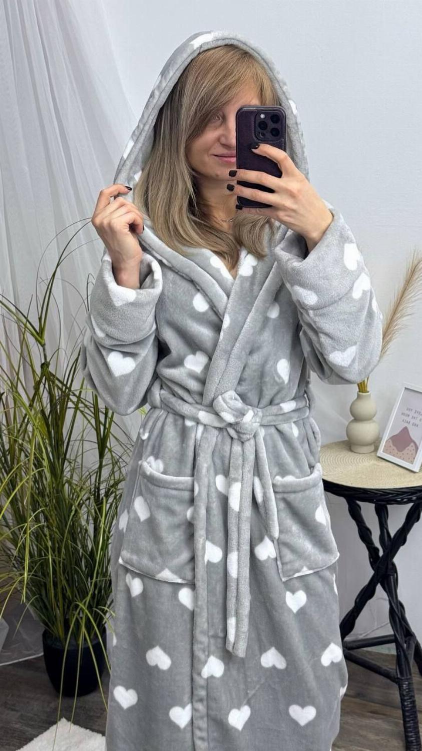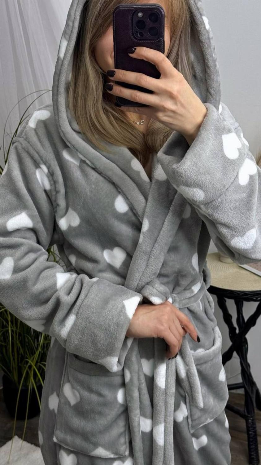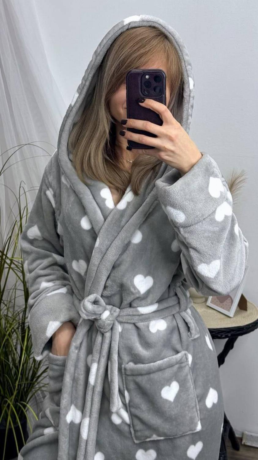 Стильний жіночий плюшевий халат з капюшоном з турецької махровості - незамінна річ в повсякденному житті. Такий халат стане в нагоді на кожен день як просто для носіння вдома, так і після ванни. Дуже м'який і приємний до тіла, зав'язується на пояс, з боків є кишені. Розмір регулюється завдяки запаху, що дозволяє моделі відмінно сидіти на дівчатах будь-якого типу фігури.