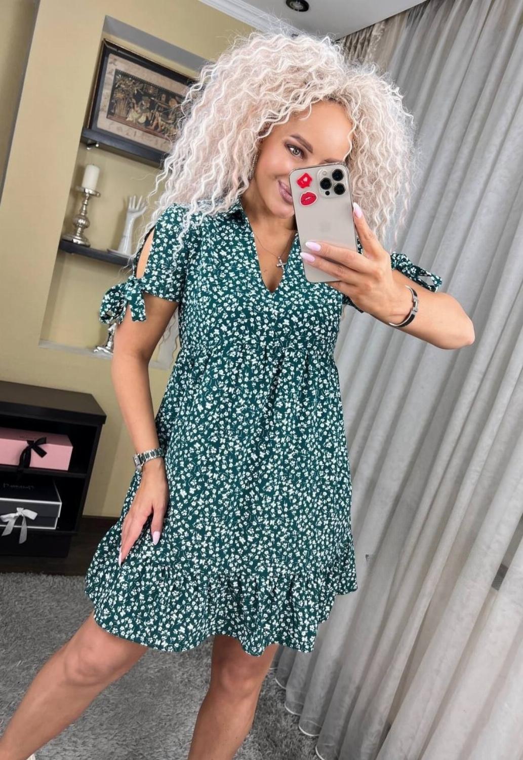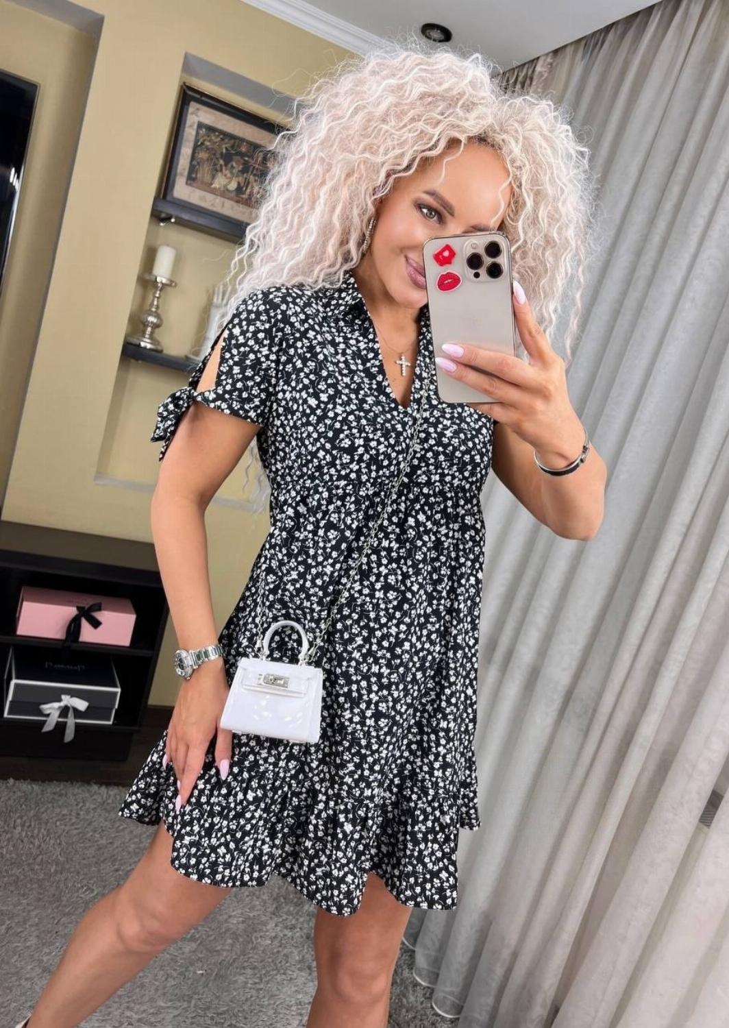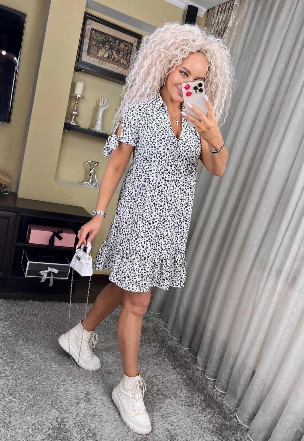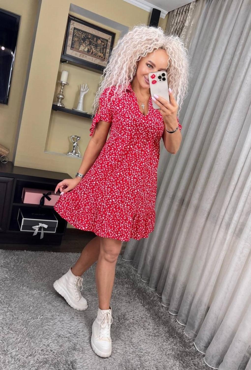 Красива літня сукня-трапеція "Адель" з квітковим принтом з софту, м'якого і приємного до тіла. Сукня вільного крою з короткими рукавами на зав'язках, класичним коміром-сорочкою, широким рюшем знизу. Сукня буде виглядати однаково стильно і гармонійно, як зі спортивним взуттям, так і з класичним на підборах.