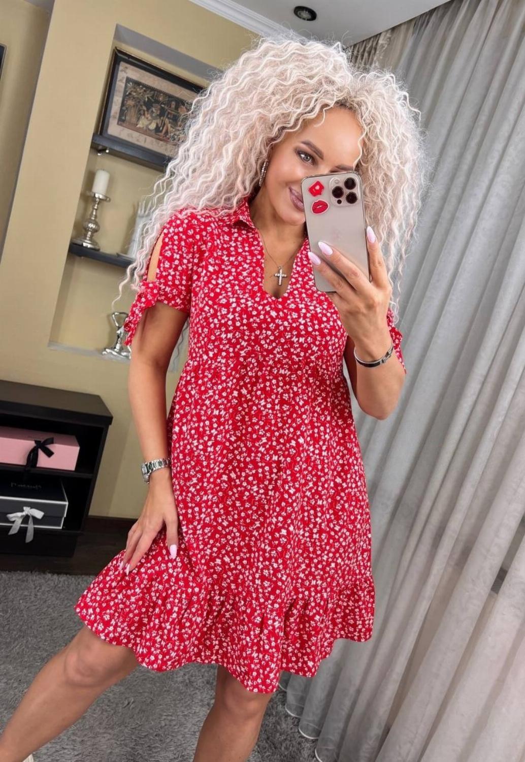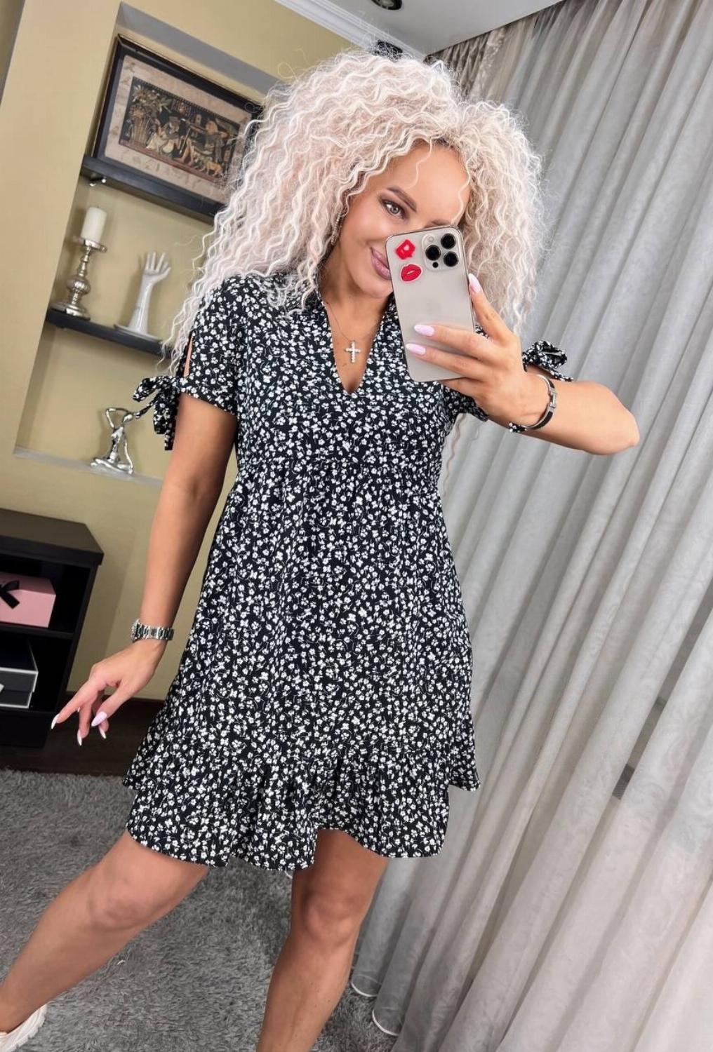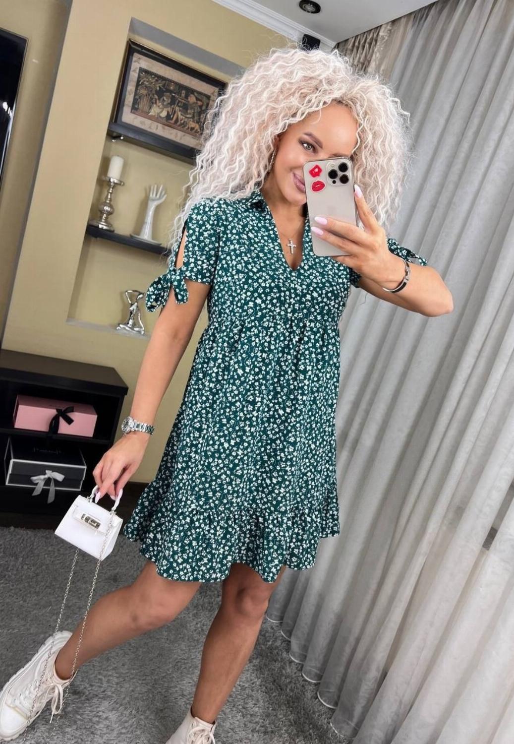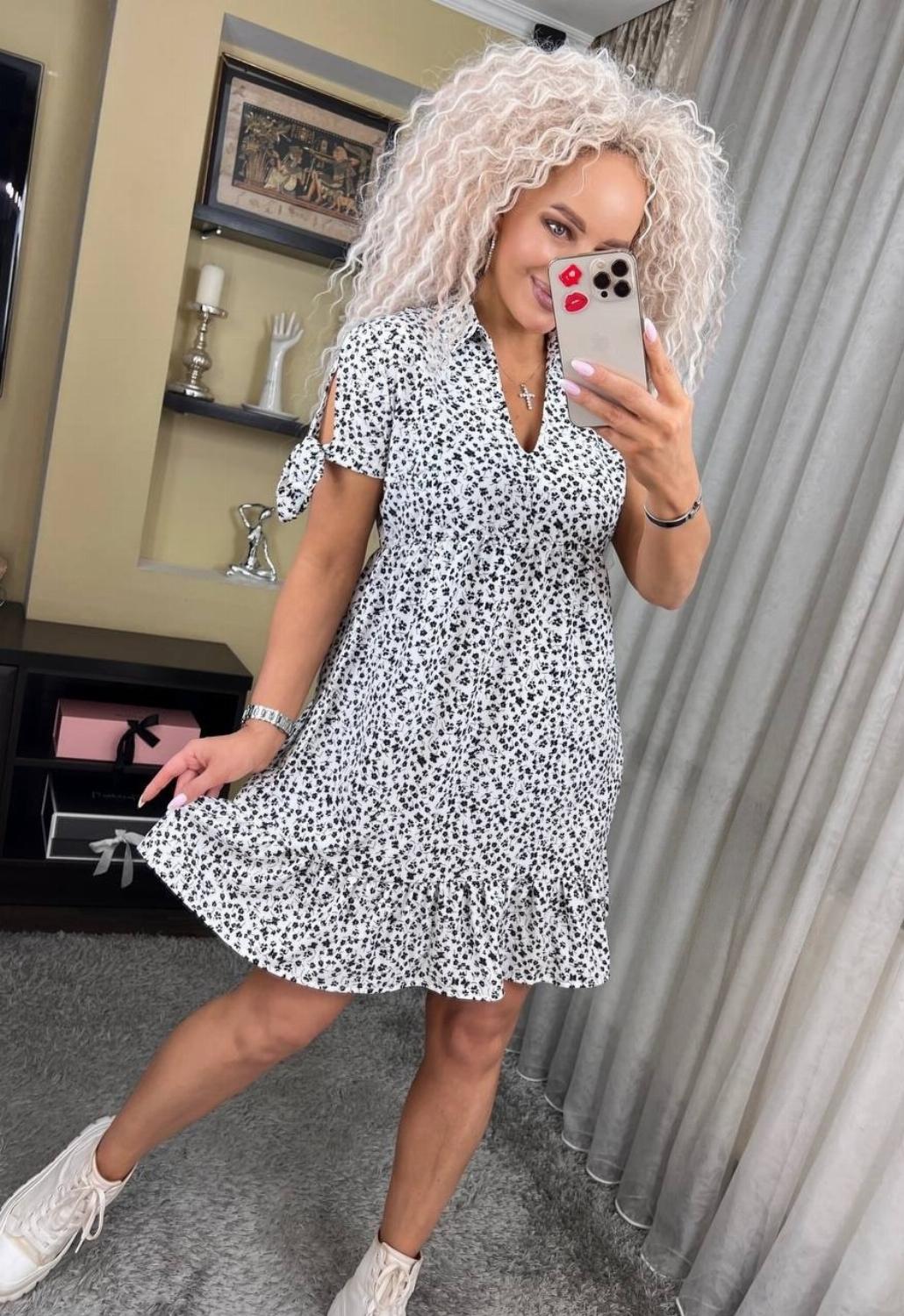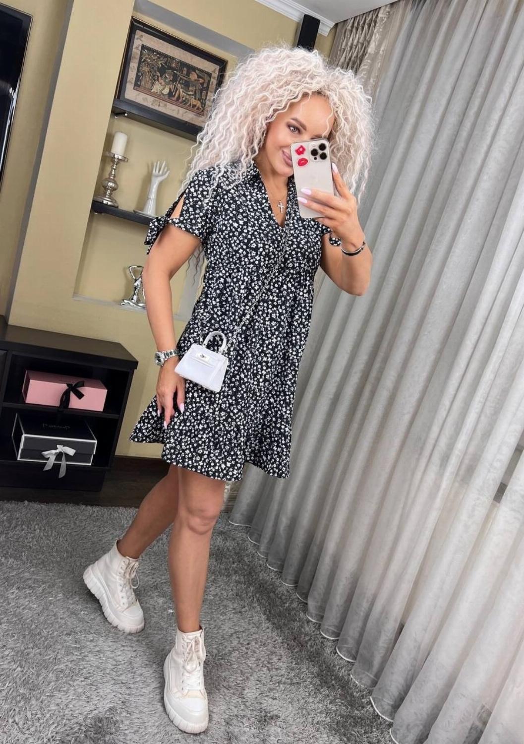 Красива літня сукня-трапеція "Адель" з квітковим принтом з софту, м'якого і приємного до тіла. Сукня вільного крою з короткими рукавами на зав'язках, класичним коміром-сорочкою, широким рюшем знизу. Сукня буде виглядати однаково стильно і гармонійно, як зі спортивним взуттям, так і з класичним на підборах.