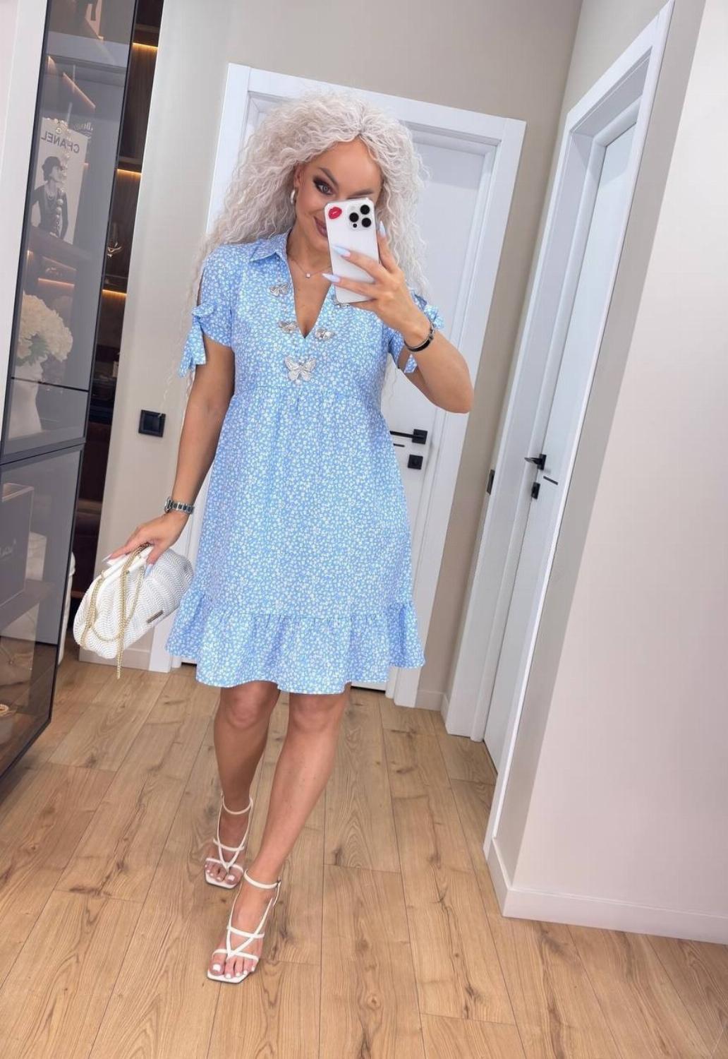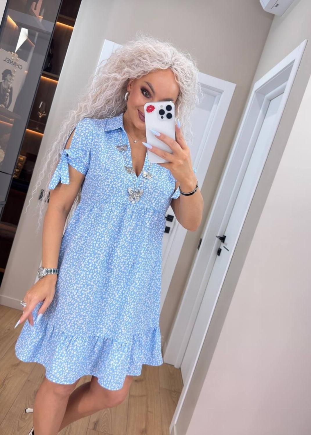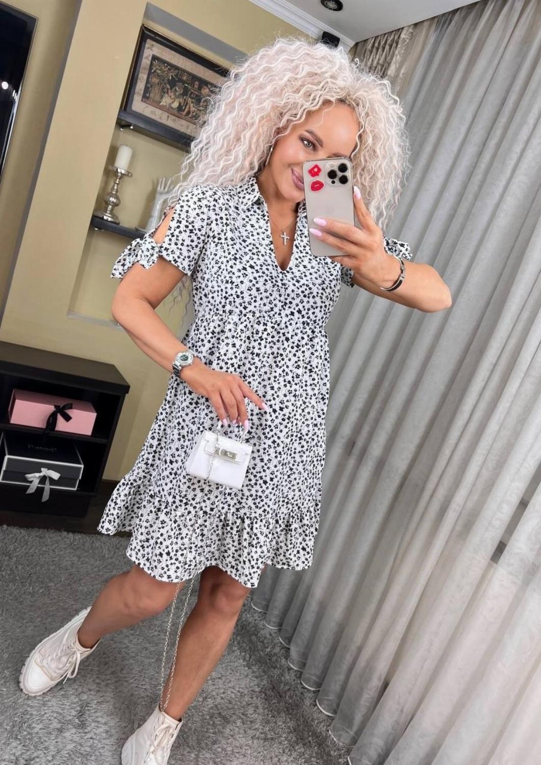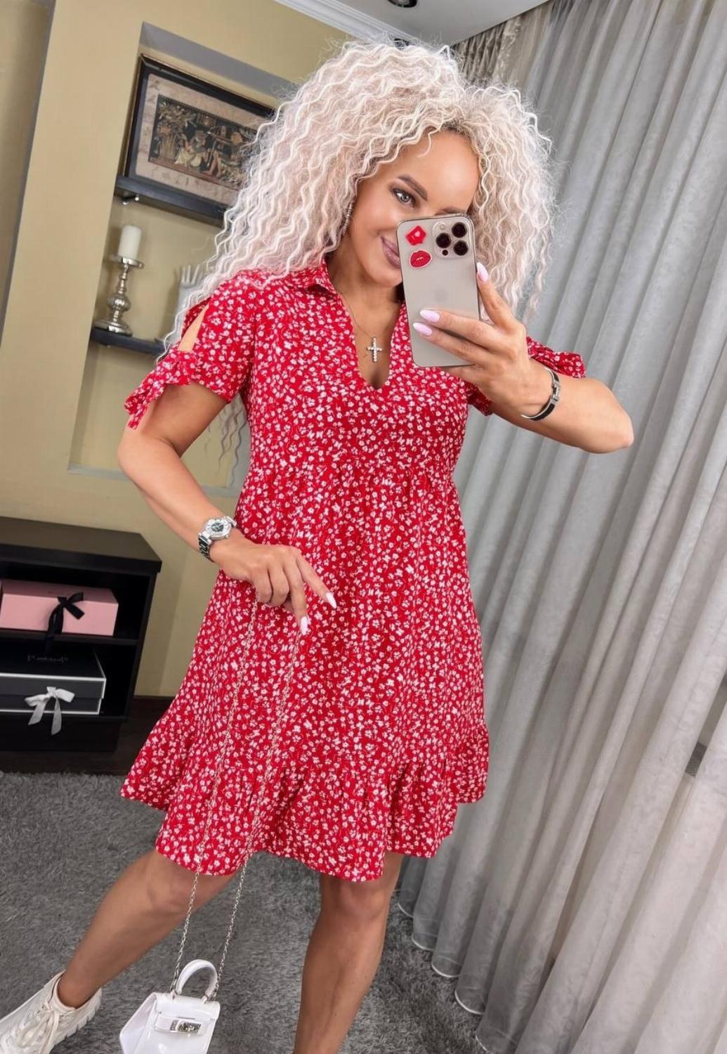 Красива літня сукня-трапеція "Адель" з квітковим принтом з софту, м'якого і приємного до тіла. Сукня вільного крою з короткими рукавами на зав'язках, класичним коміром-сорочкою, широким рюшем знизу. Сукня буде виглядати однаково стильно і гармонійно, як зі спортивним взуттям, так і з класичним на підборах.
