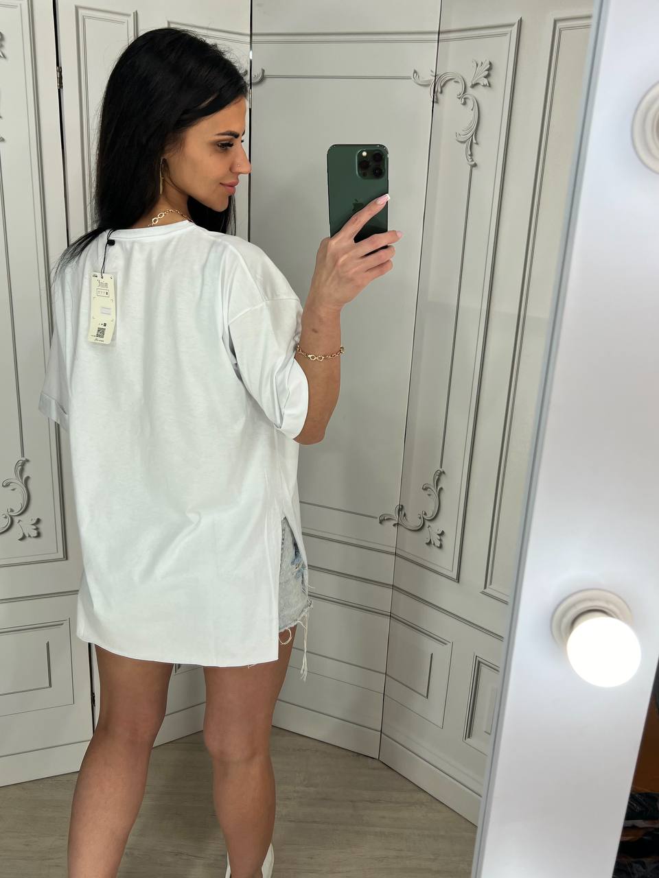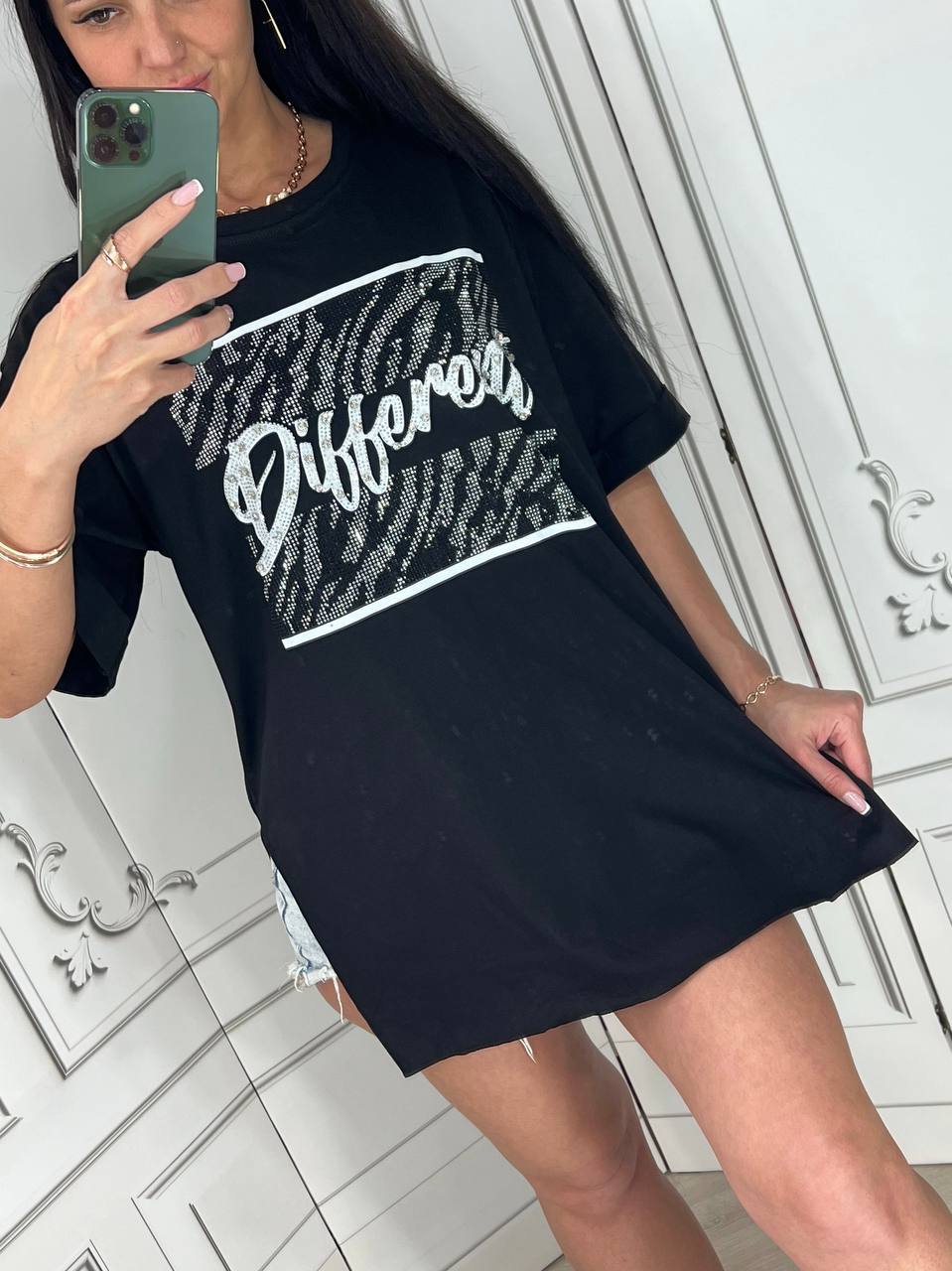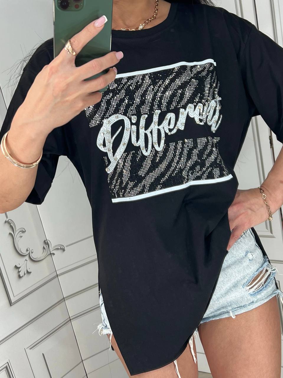 Стильна вільна жіноча футболка - туніка зі стразами та розрізами збоку "Different". Модний крій, зручний фасон та якісний турецький матеріал (коттон) – вигідно виділяють цю футболку серед інших. Вона практична та вільна; легко носиться навіть у спекотну погоду. Футболка не вигоряє і не втрачає колір при багатьох праннях, добре зберігає форму. Малюнок вишитий яскравими стразами, які дуже блищать на сонці, надають шаленої оригінальності. Відмінний варіант для літніх прогулянок.