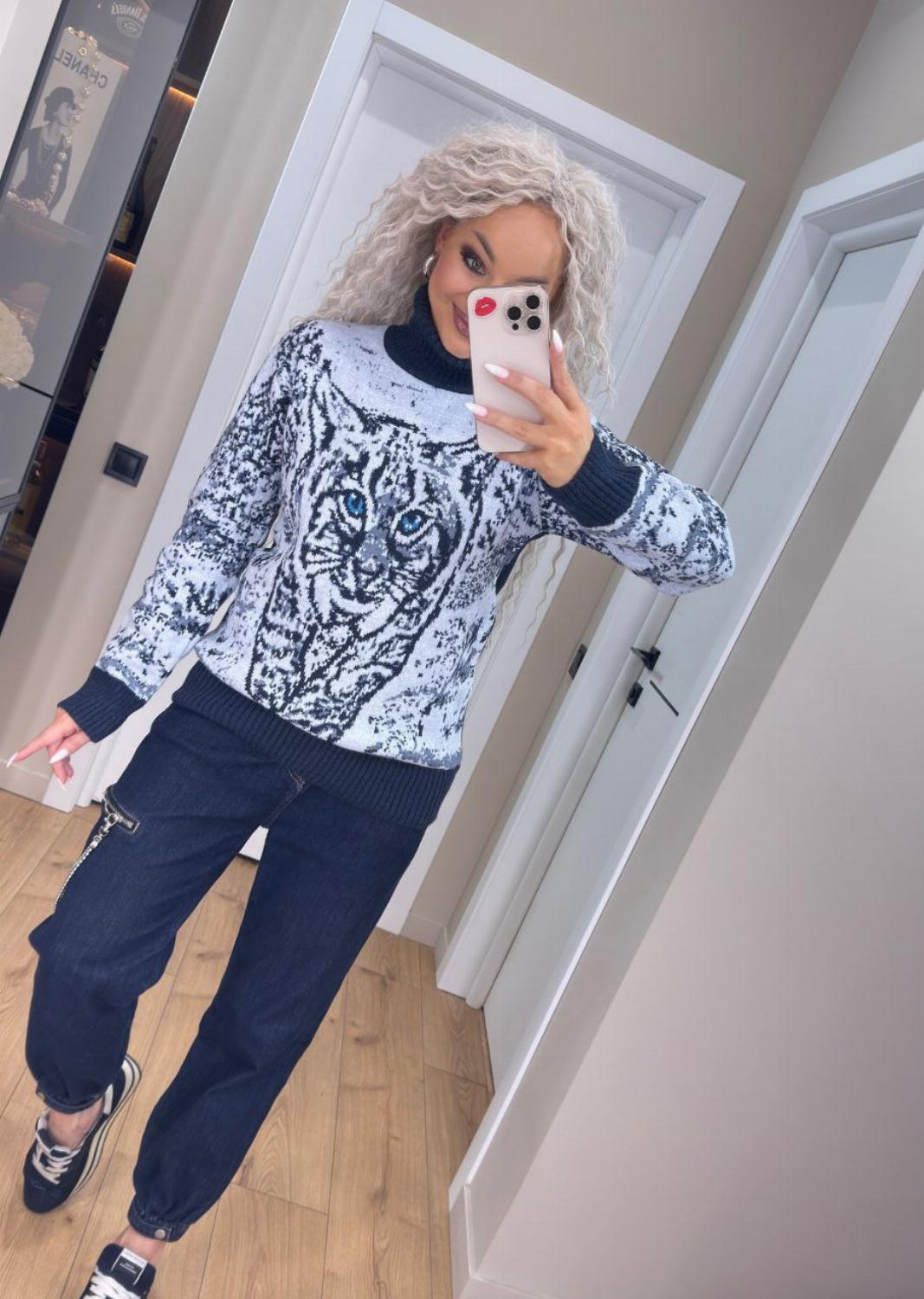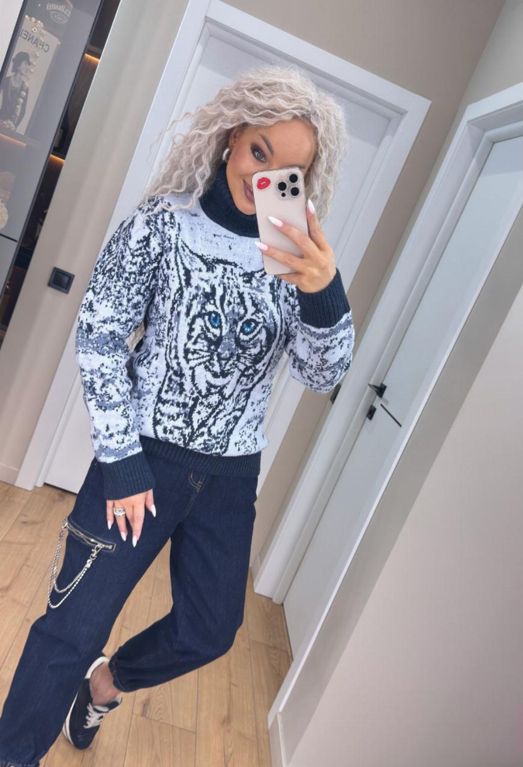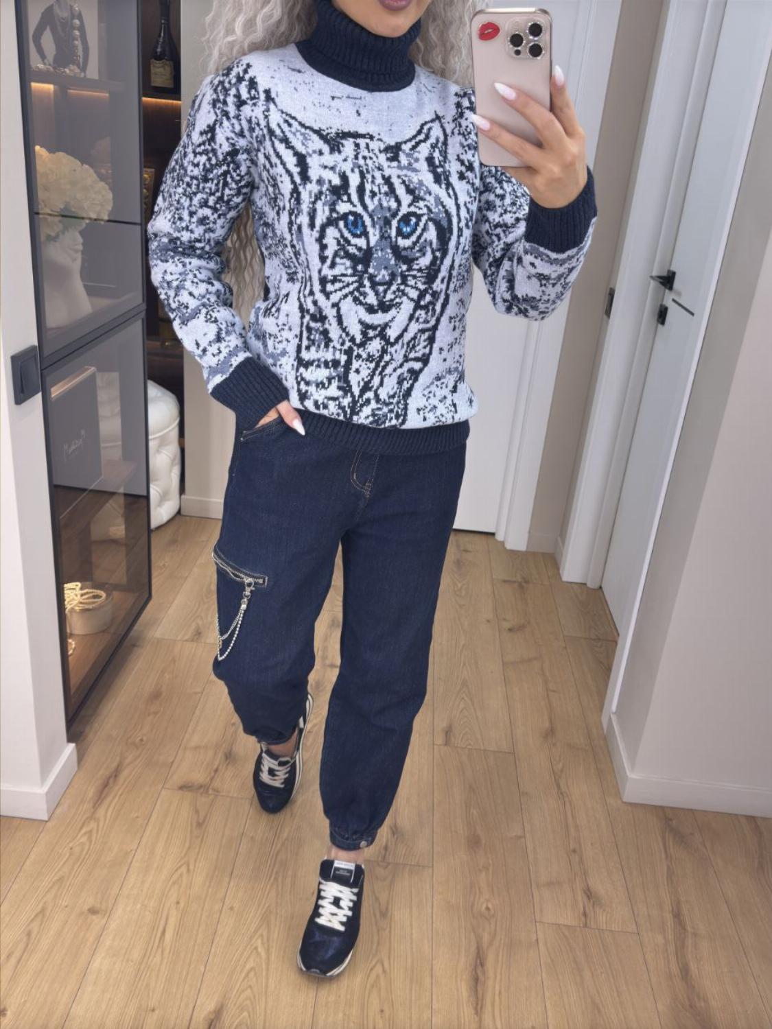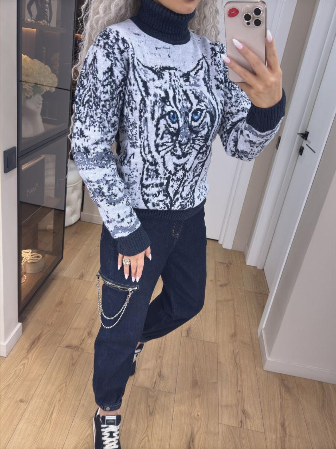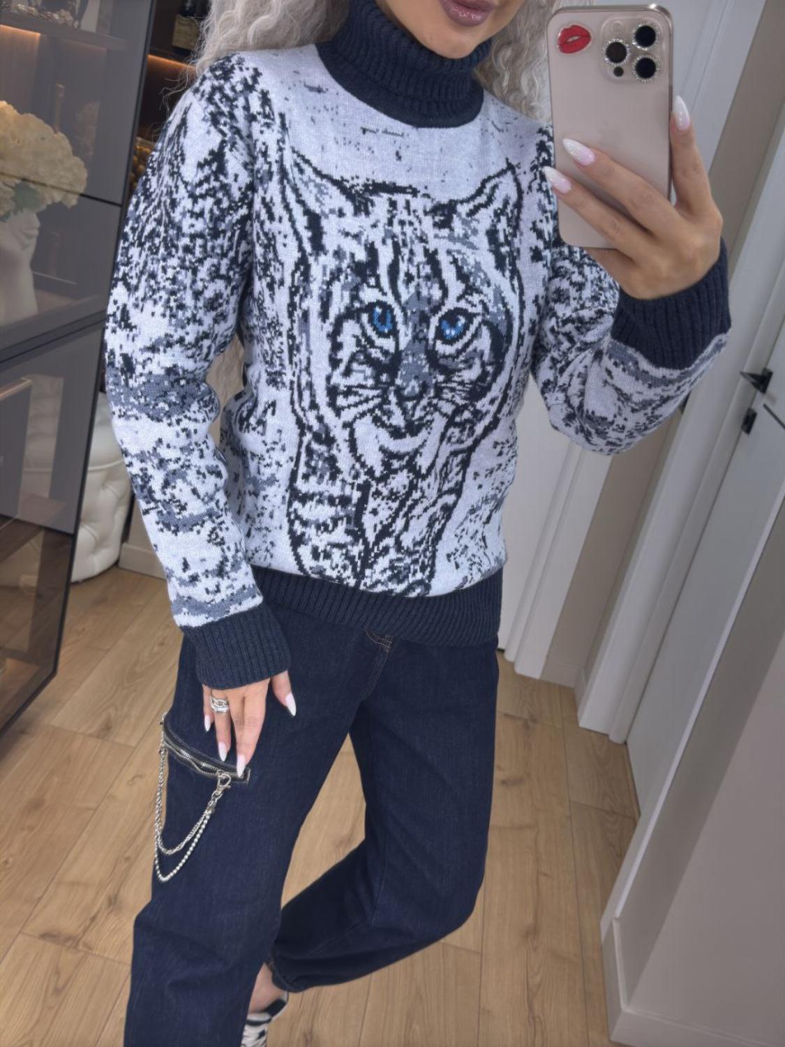 М’яка в’язка, контрастний візерунок і виразні блакитні очі снігової рисі роблять образ неповторним. Цей светр — не просто одяг, а прояв сили та індивідуальності.