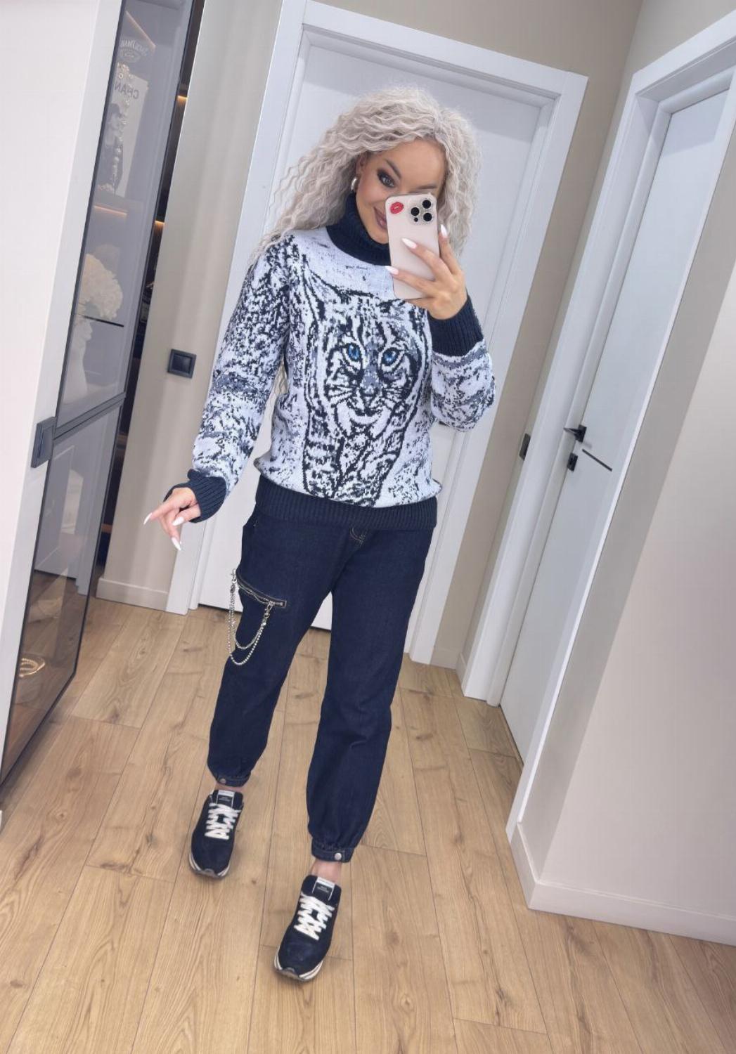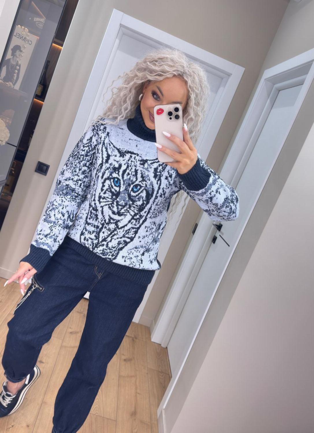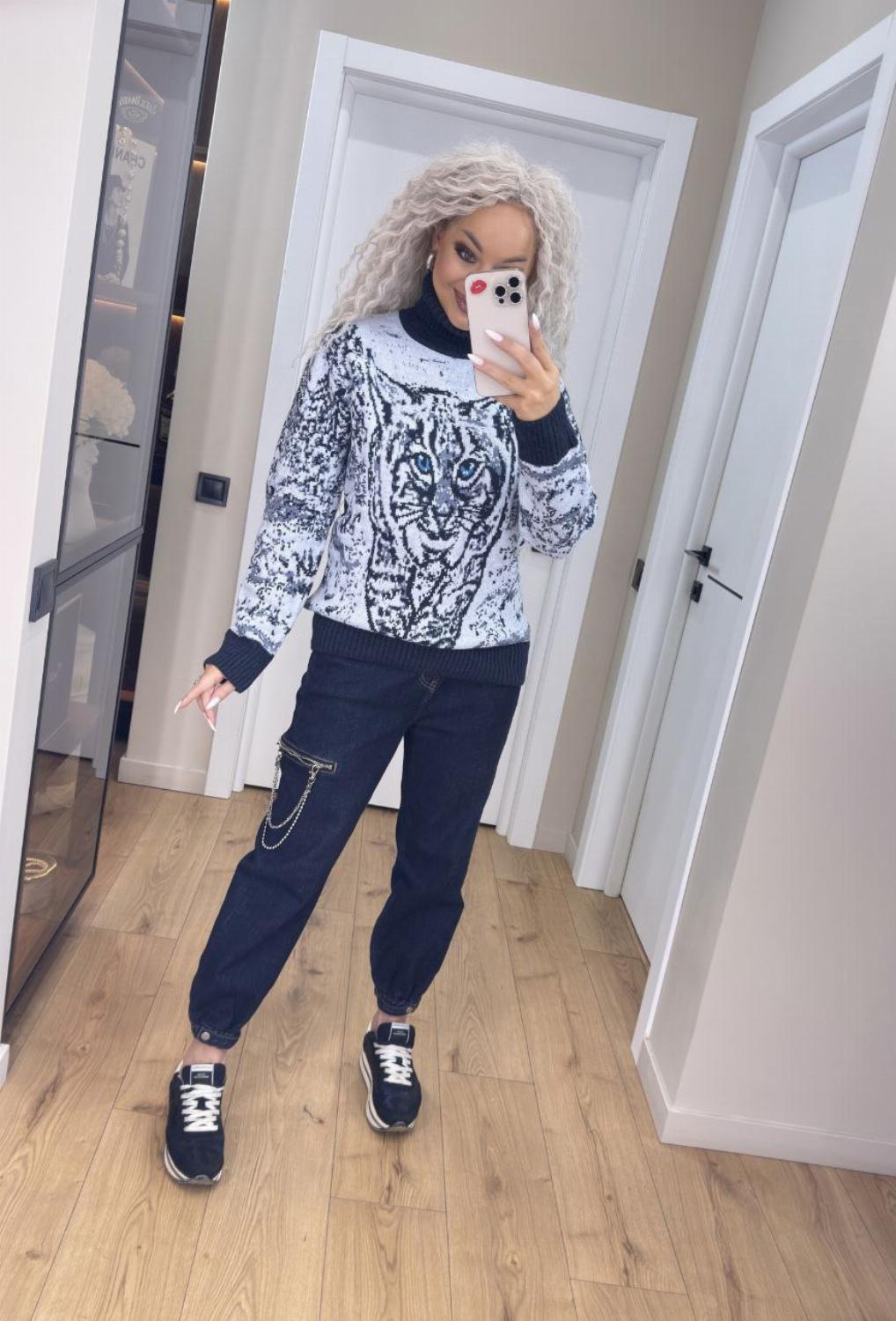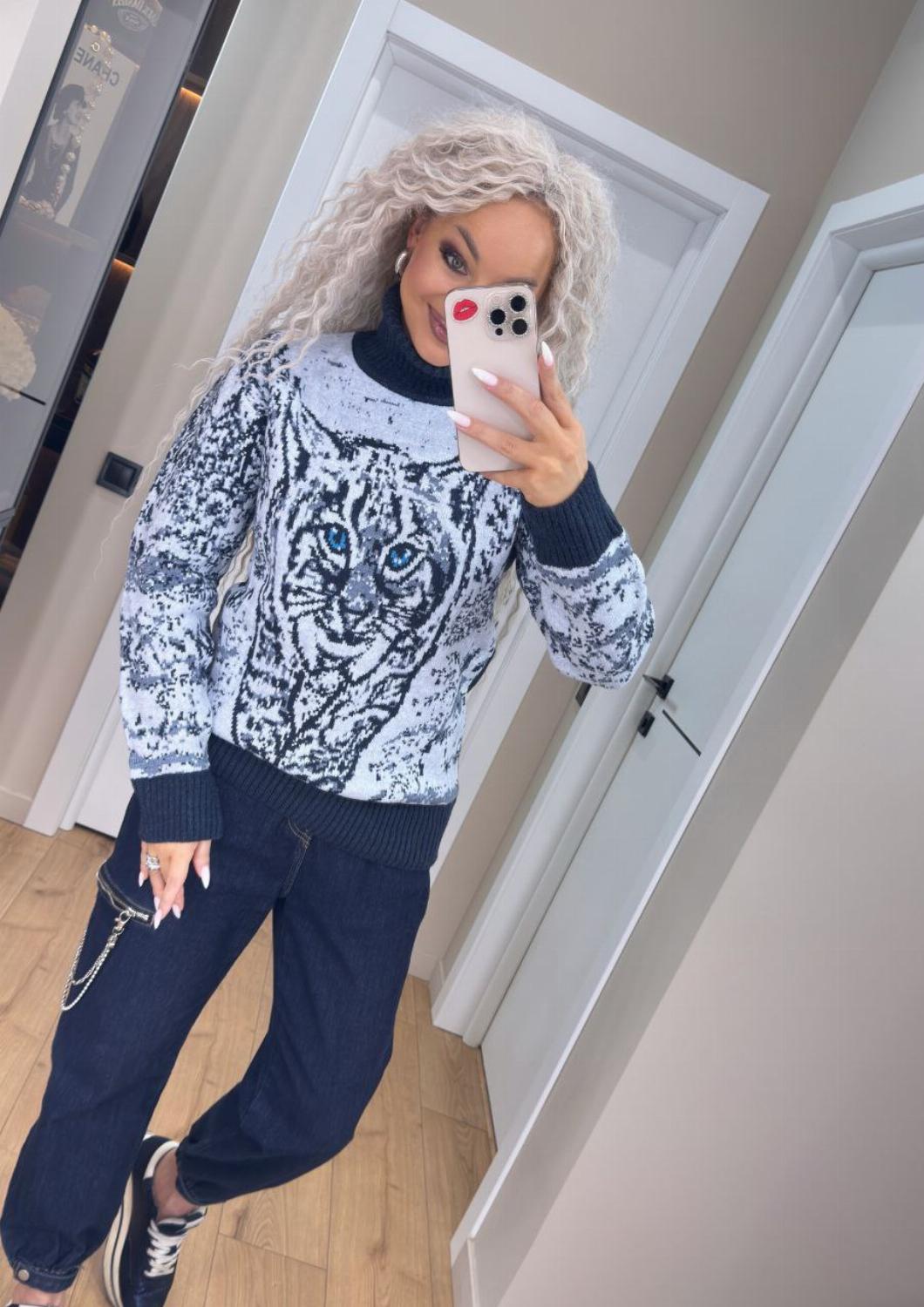 М’яка в’язка, контрастний візерунок і виразні блакитні очі снігової рисі роблять образ неповторним. Цей светр — не просто одяг, а прояв сили та індивідуальності.