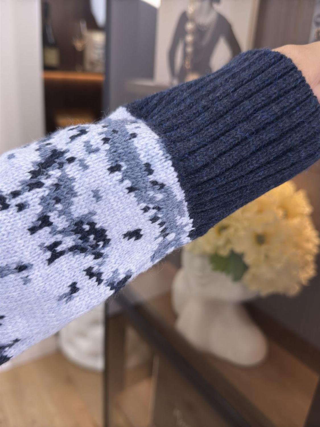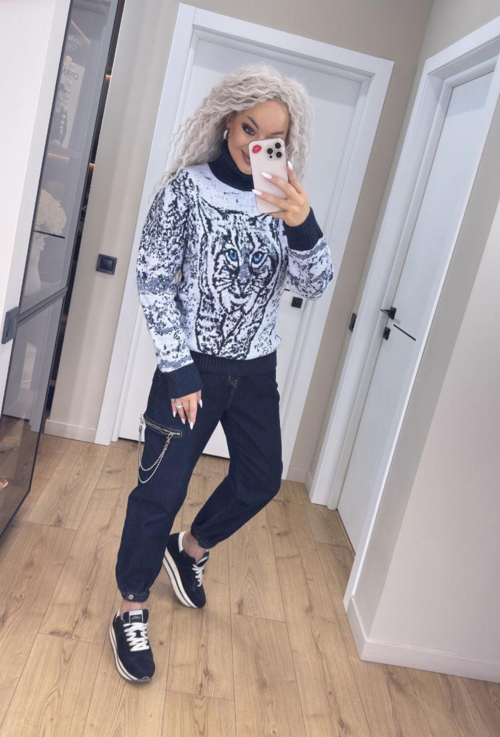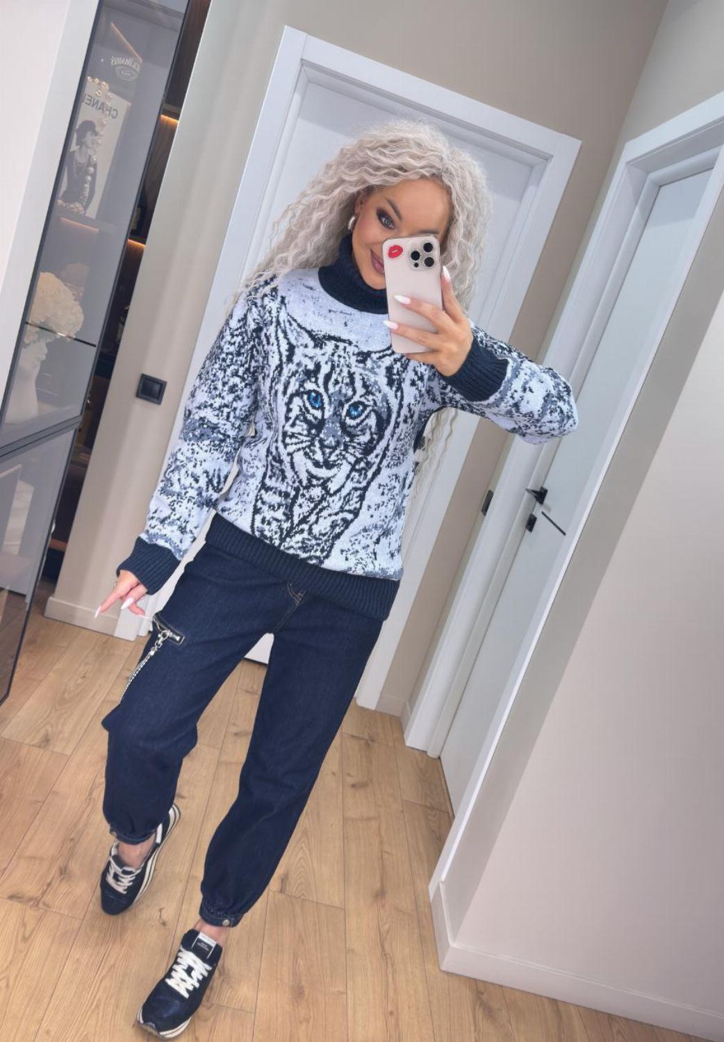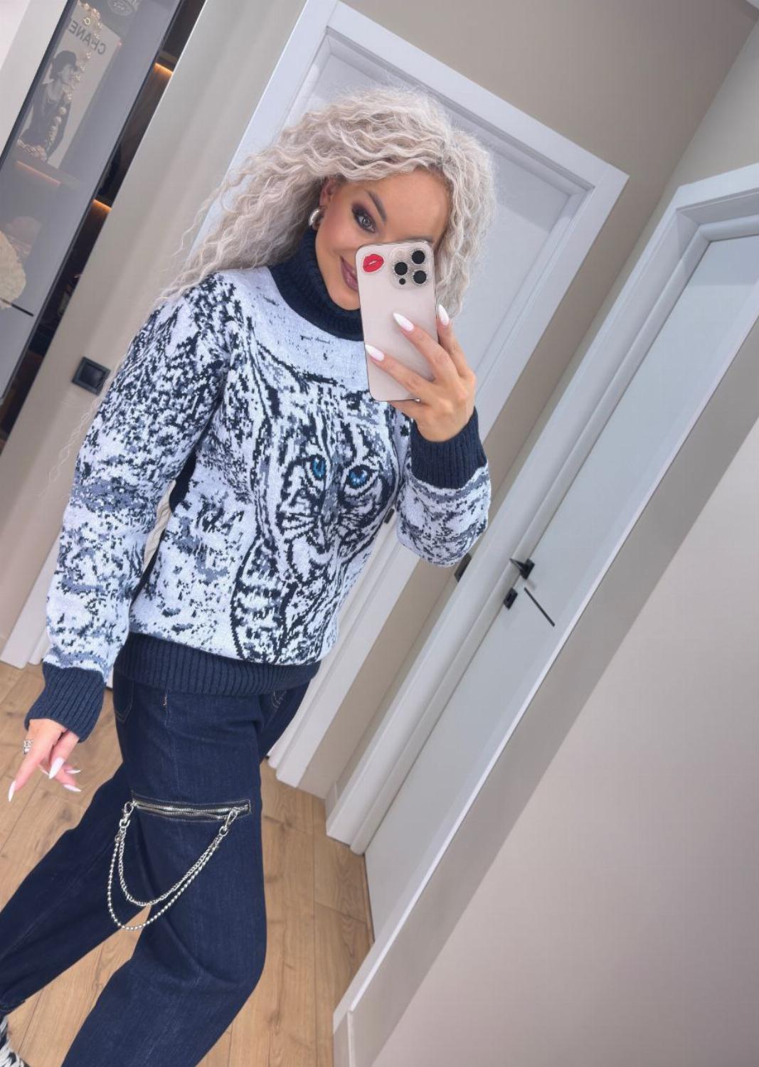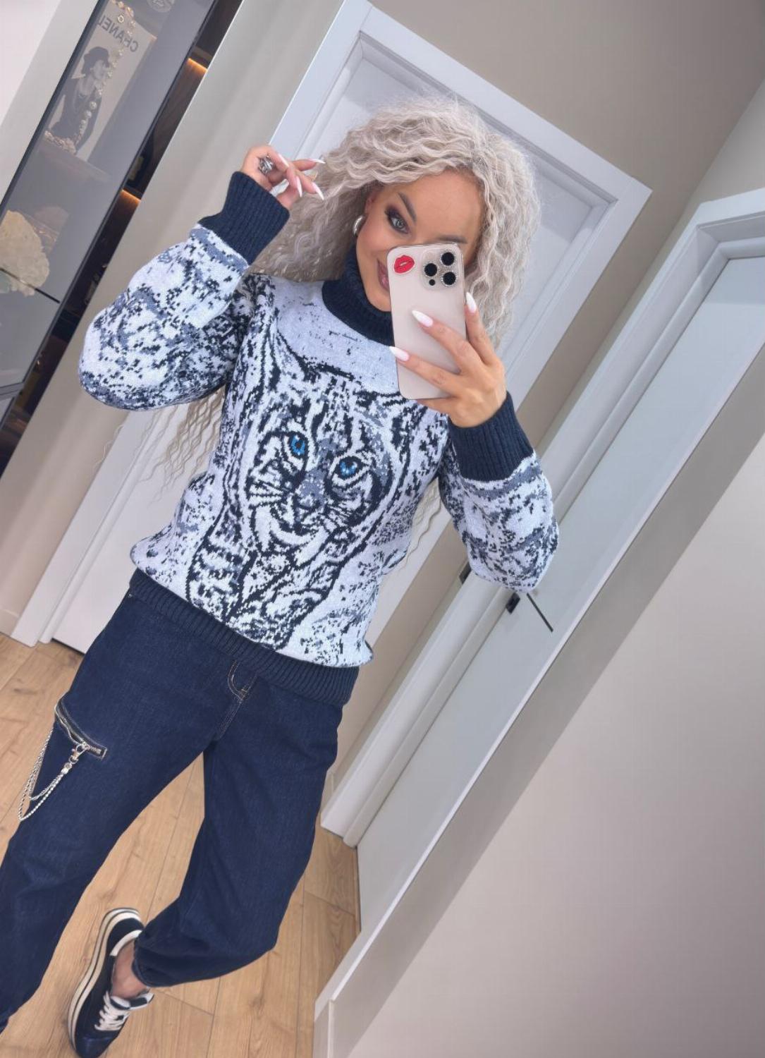 М’яка в’язка, контрастний візерунок і виразні блакитні очі снігової рисі роблять образ неповторним. Цей светр — не просто одяг, а прояв сили та індивідуальності.
