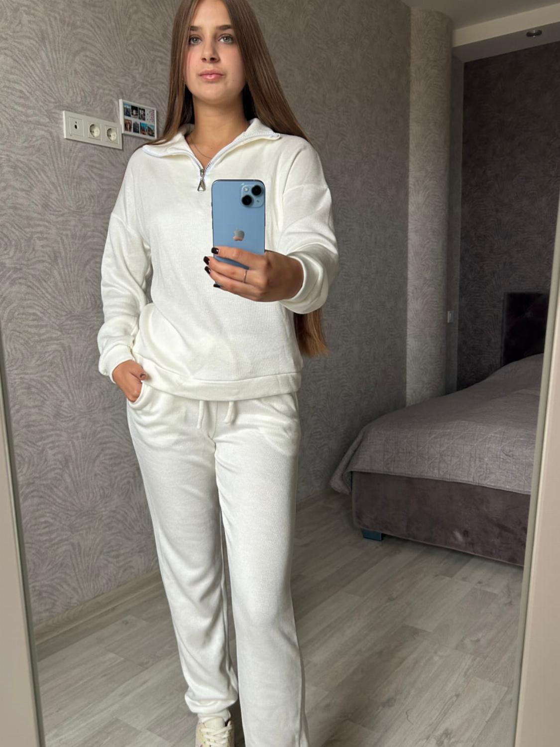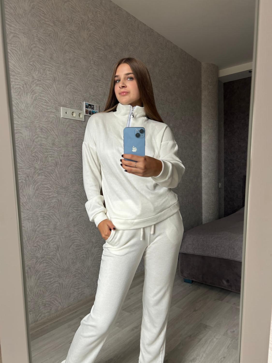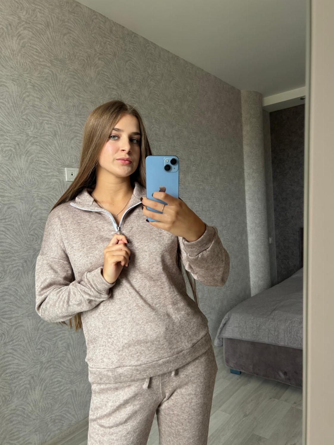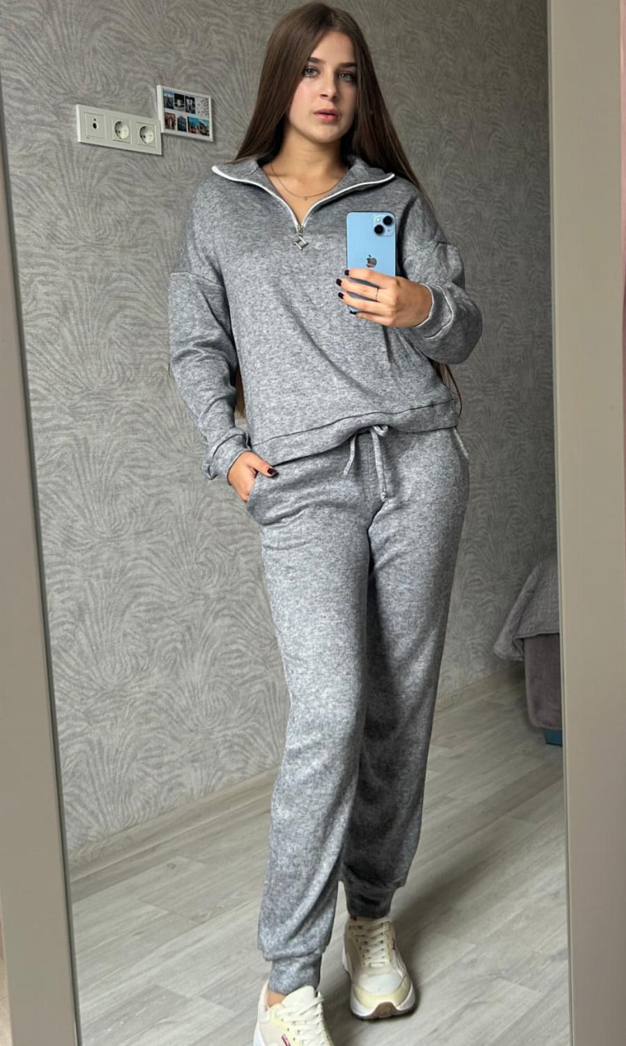 Костюм з ангори «Еладда» виконаний з приголомшливо теплої, м'якої і ніжної шерсті ангорського кролика. Виріб відмінно підкреслює фігуру, зігріває, створює благородний образ. На відміну від інших вовняних виробів, костюм з ангори дуже м'який і ніжний, не коле і не дратує шкіру, забезпечує комфорт. У такому костюмі ви будете почувати себе затишно. Костюм складається зі светра на блискавці з оригінальним коміром і брюк з високою висоткою. Всі елементи комплекту можна носити як разом, так і окремо.