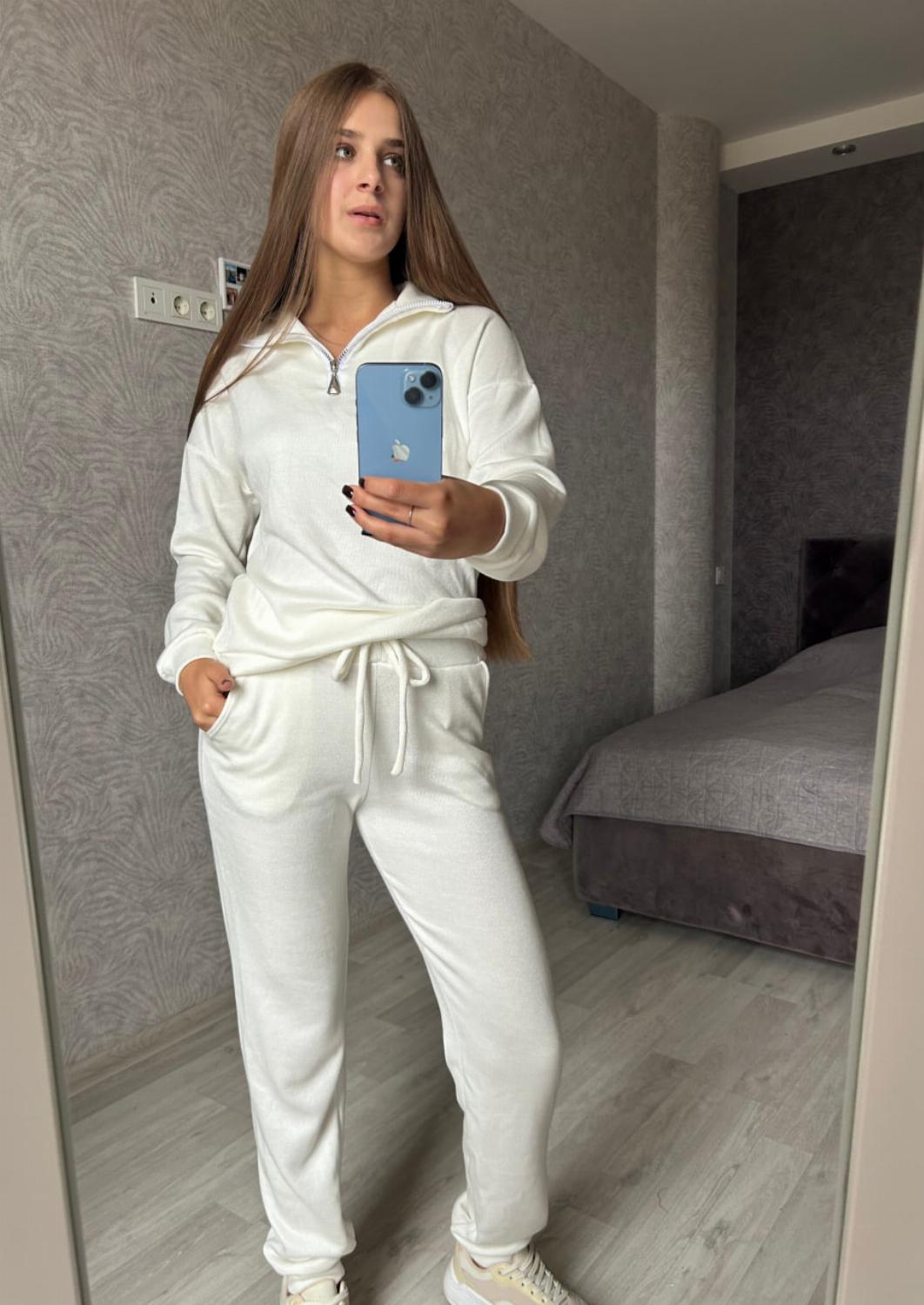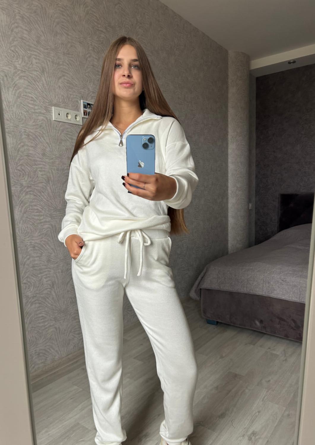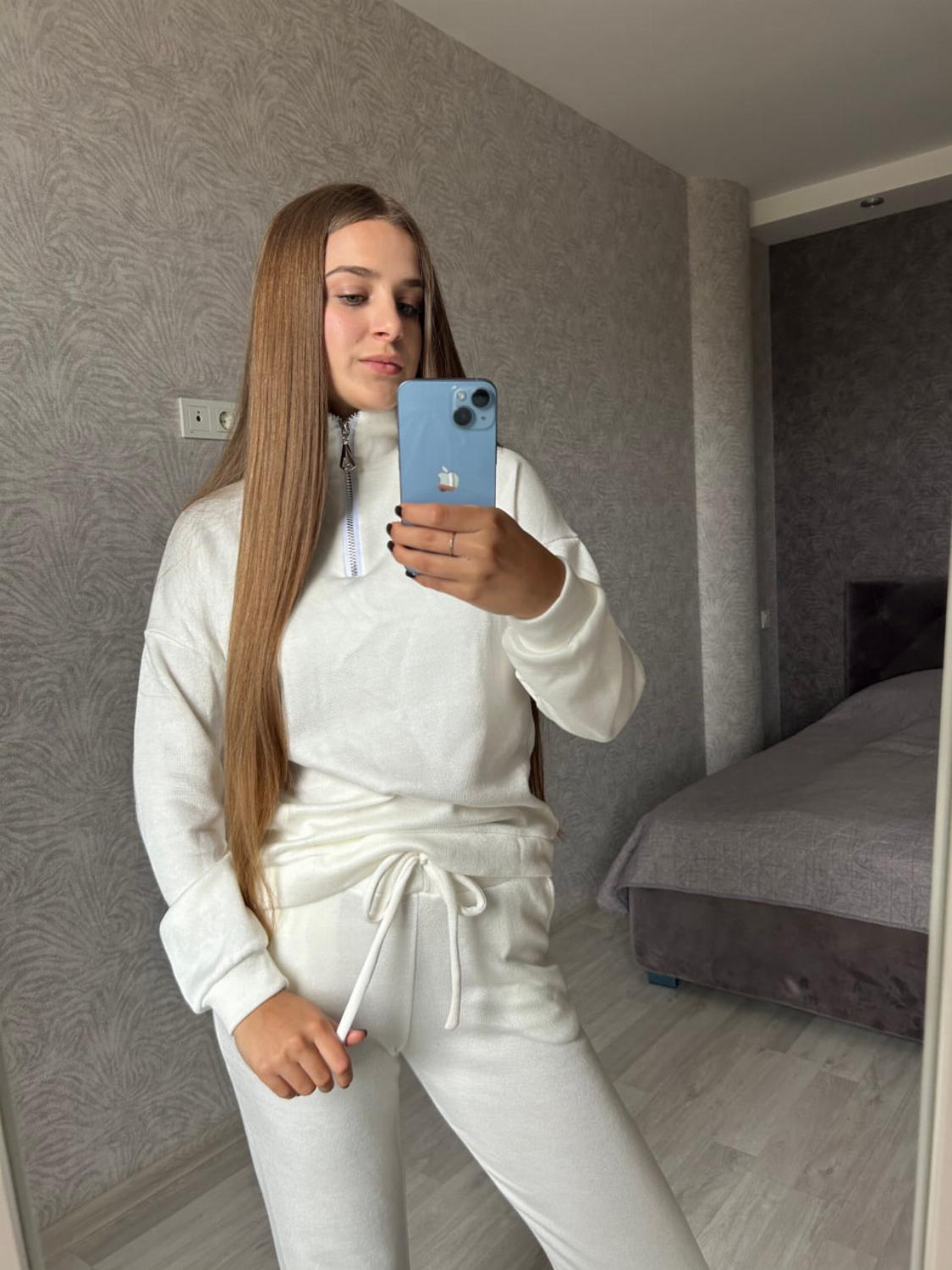 Костюм з ангори «Еладда» виконаний з приголомшливо теплої, м'якої і ніжної шерсті ангорського кролика. Виріб відмінно підкреслює фігуру, зігріває, створює благородний образ. На відміну від інших вовняних виробів, костюм з ангори дуже м'який і ніжний, не коле і не дратує шкіру, забезпечує комфорт. У такому костюмі ви будете почувати себе затишно. Костюм складається зі светра на блискавці з оригінальним коміром і брюк з високою висоткою. Всі елементи комплекту можна носити як разом, так і окремо.