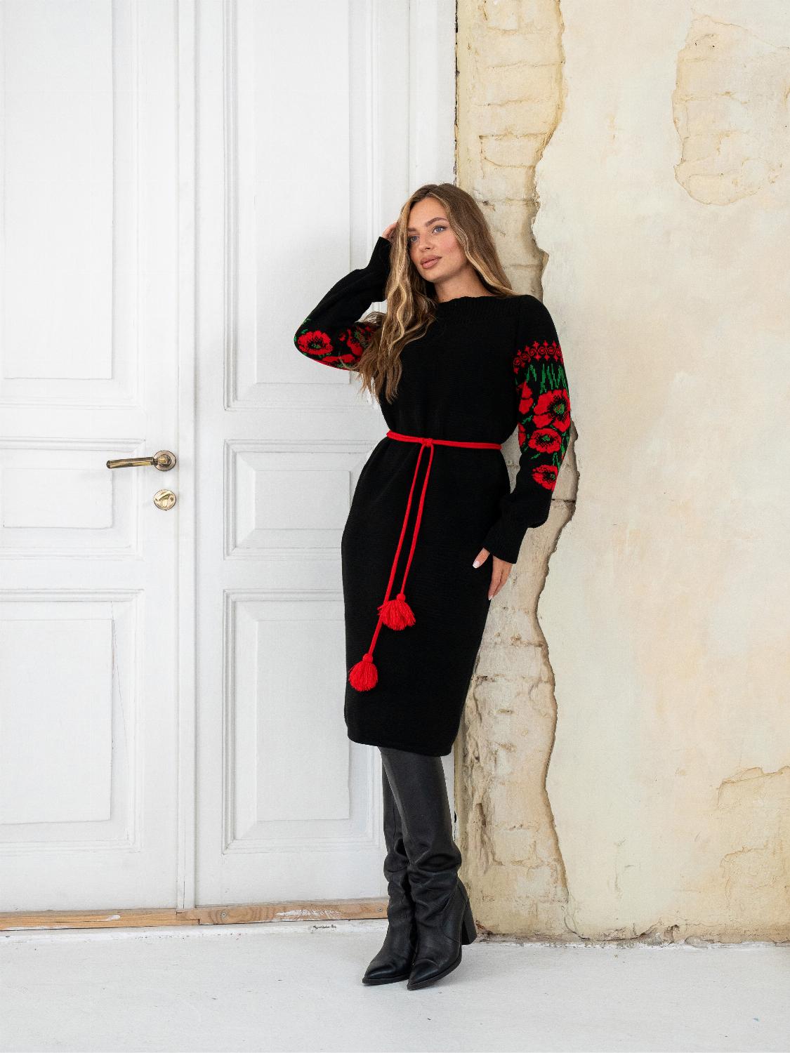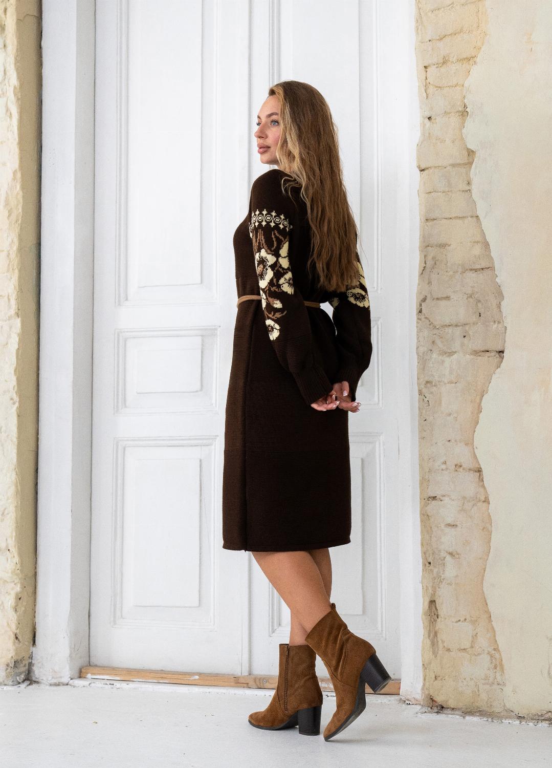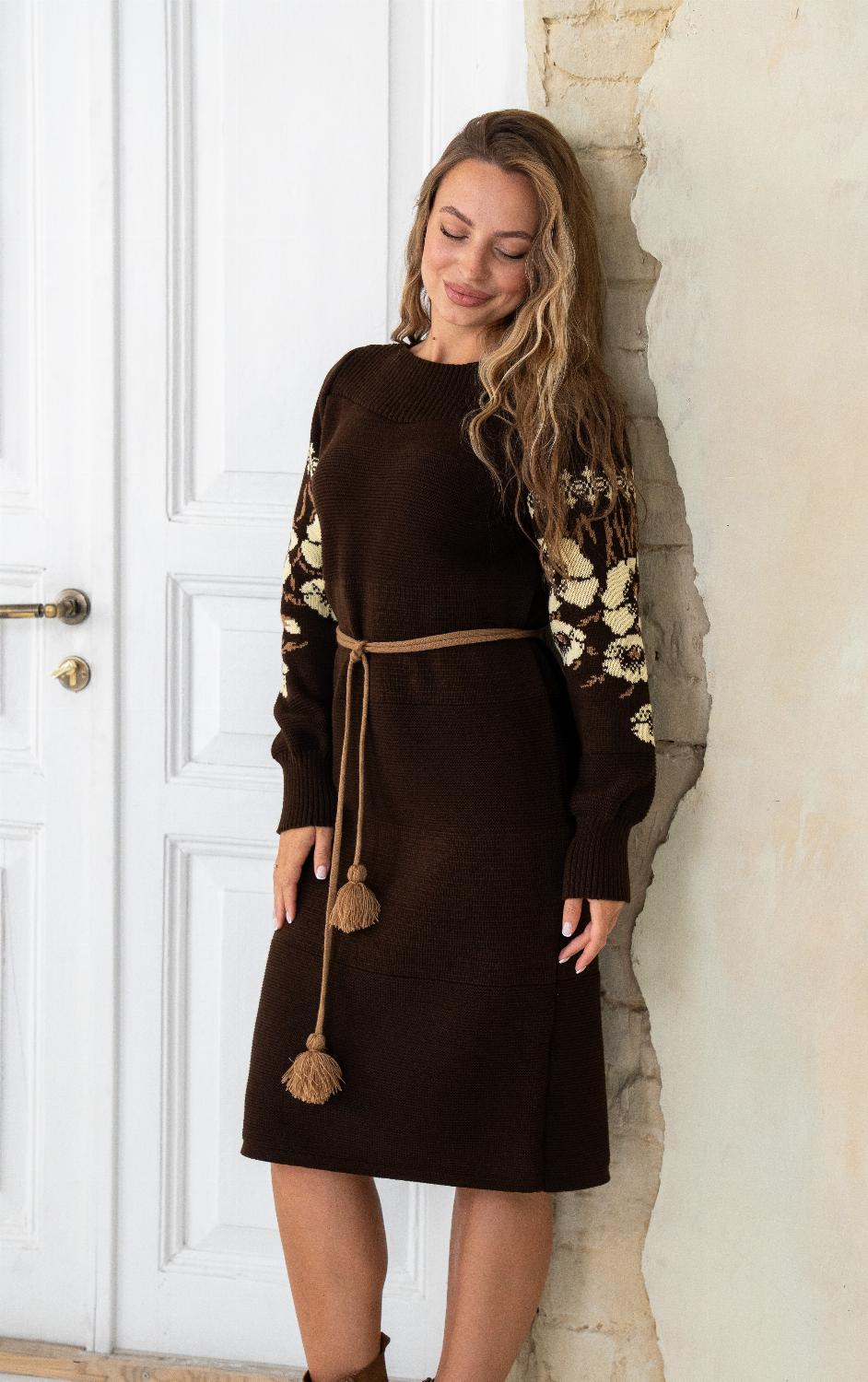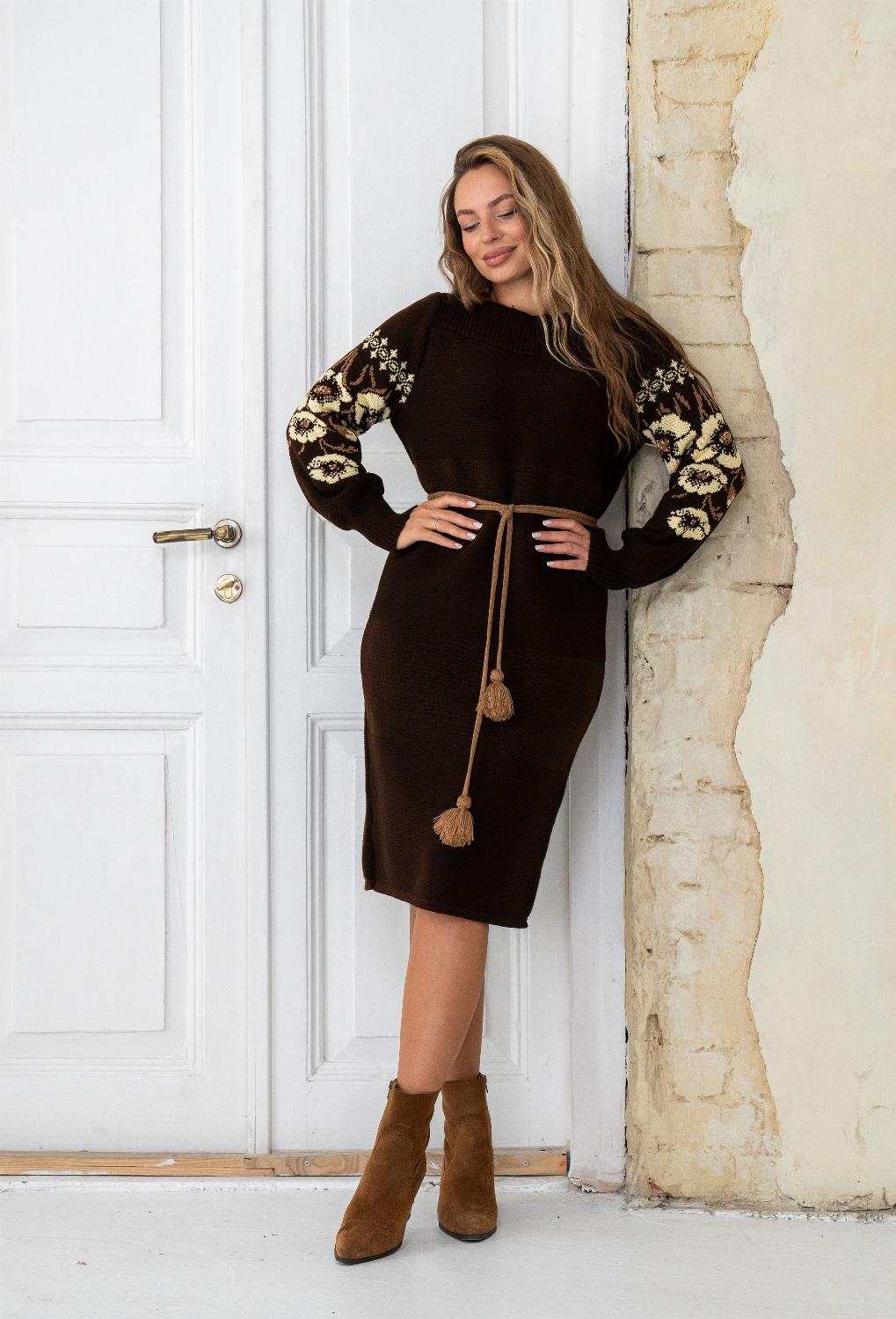 Тепла в'язана вишита сукня має довжину до колін, вона буде ідеально виглядати з туфлями і чобітьми. Оригінальність виробу надає принт у вигляді вишивки, яким прикрашені рукави. Сукня має широкий вільний комір під горло і довгий широкий рукав з манжетою. Матеріал м'який, теплий, приємний на дотик - в'язаний трикотаж. Виріб відмінно сідає по фігурі і добре поєднується з будь-яким низом. Відмінний варіант для повсякденного носіння на роботу або на прогулянку. Подаруйте собі затишну новинку!