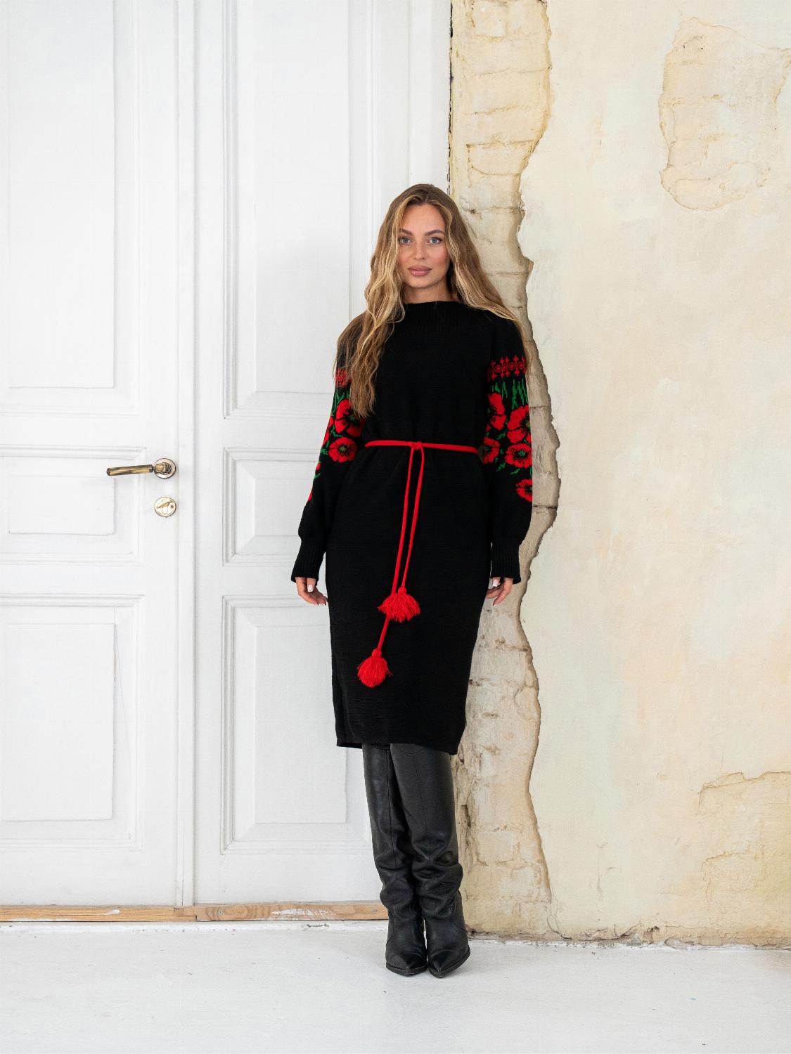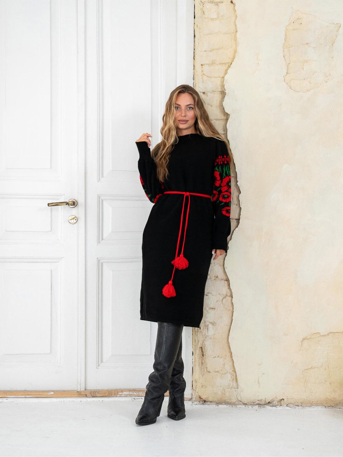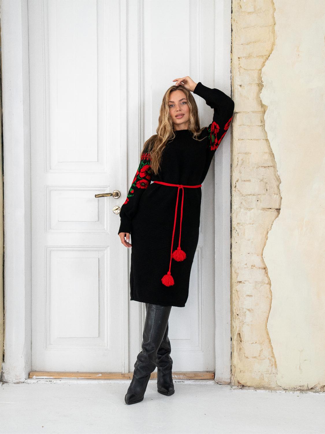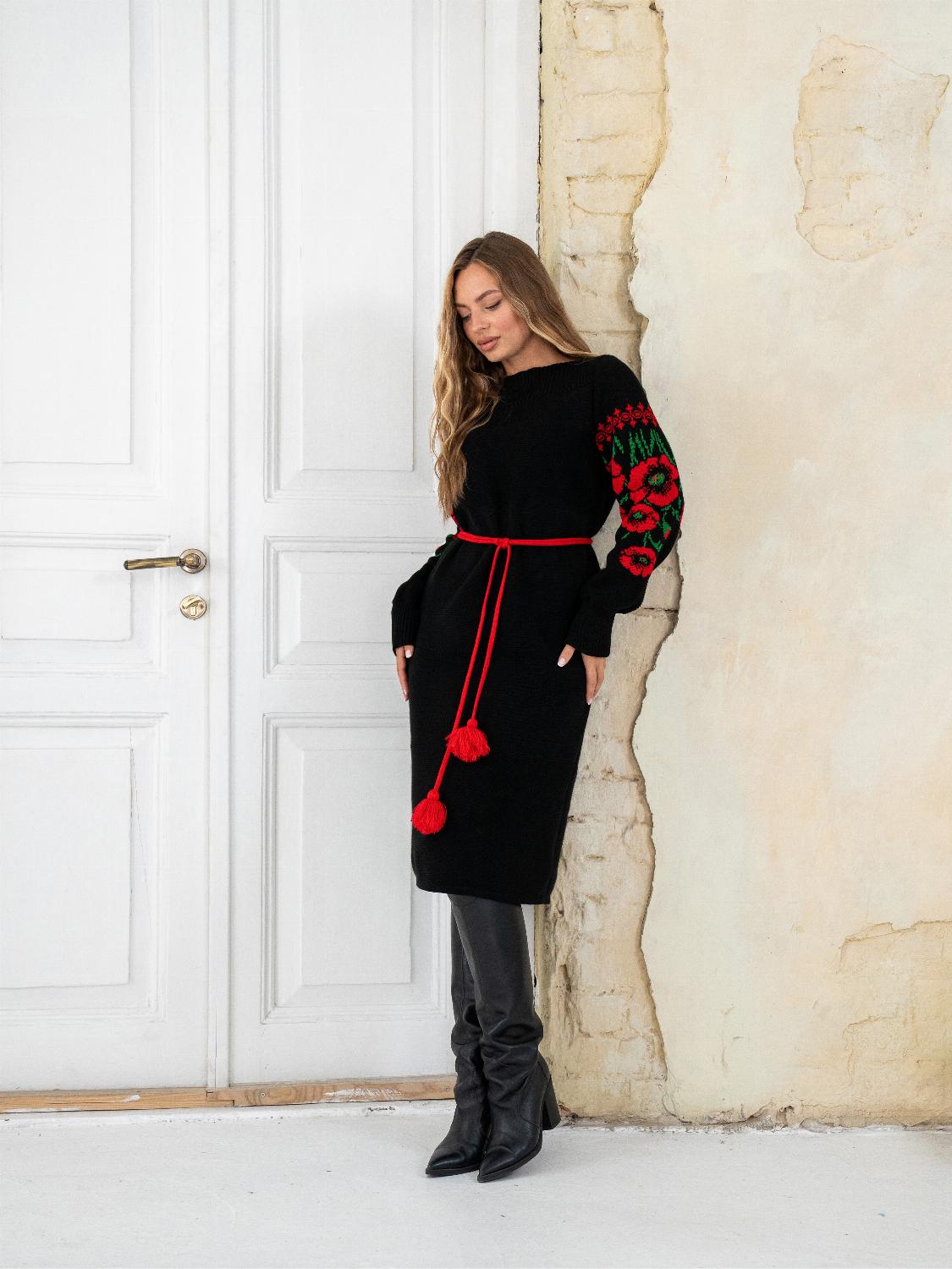 Тепла в'язана вишита сукня має довжину до колін, вона буде ідеально виглядати з туфлями і чобітьми. Оригінальність виробу надає принт у вигляді вишивки, яким прикрашені рукави. Сукня має широкий вільний комір під горло і довгий широкий рукав з манжетою. Матеріал м'який, теплий, приємний на дотик - в'язаний трикотаж. Виріб відмінно сідає по фігурі і добре поєднується з будь-яким низом. Відмінний варіант для повсякденного носіння на роботу або на прогулянку. Подаруйте собі затишну новинку!