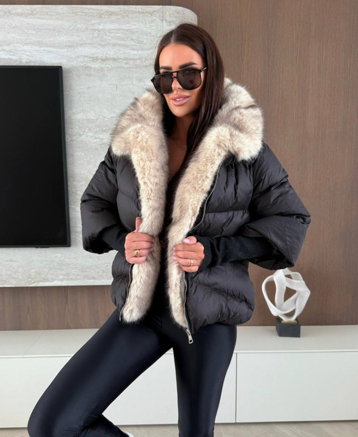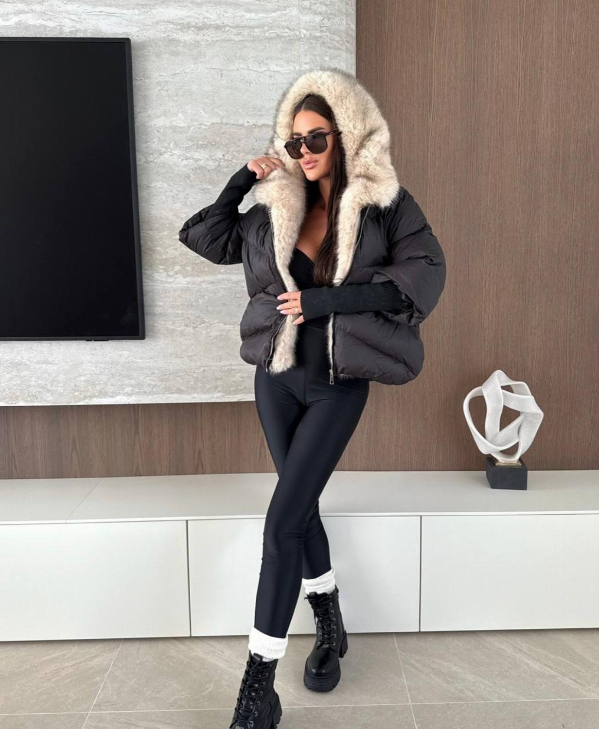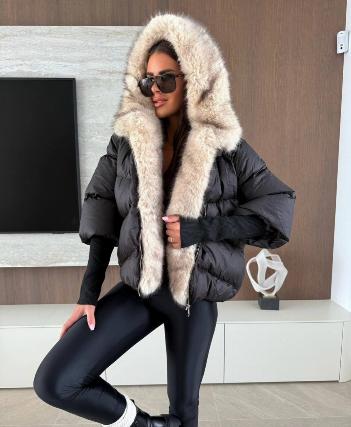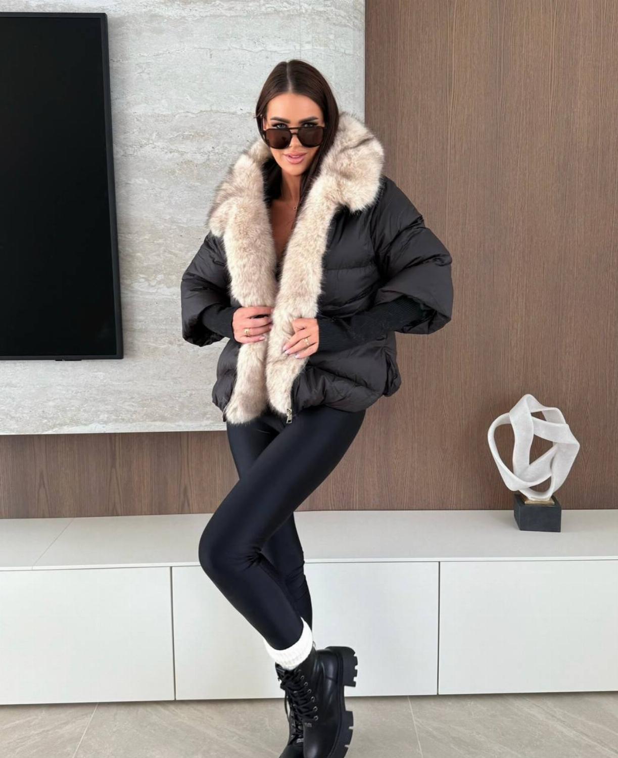 Ця стильна куртка з плащової тканини лаке з наповнювачем з еко-пуху та розкішним штучним хутром зігріє навіть у найхолодніші дні. Матеріал має м’який глянцевий блиск, що додає образу жіночності та сучасності.