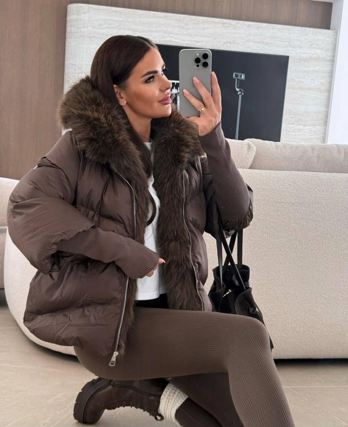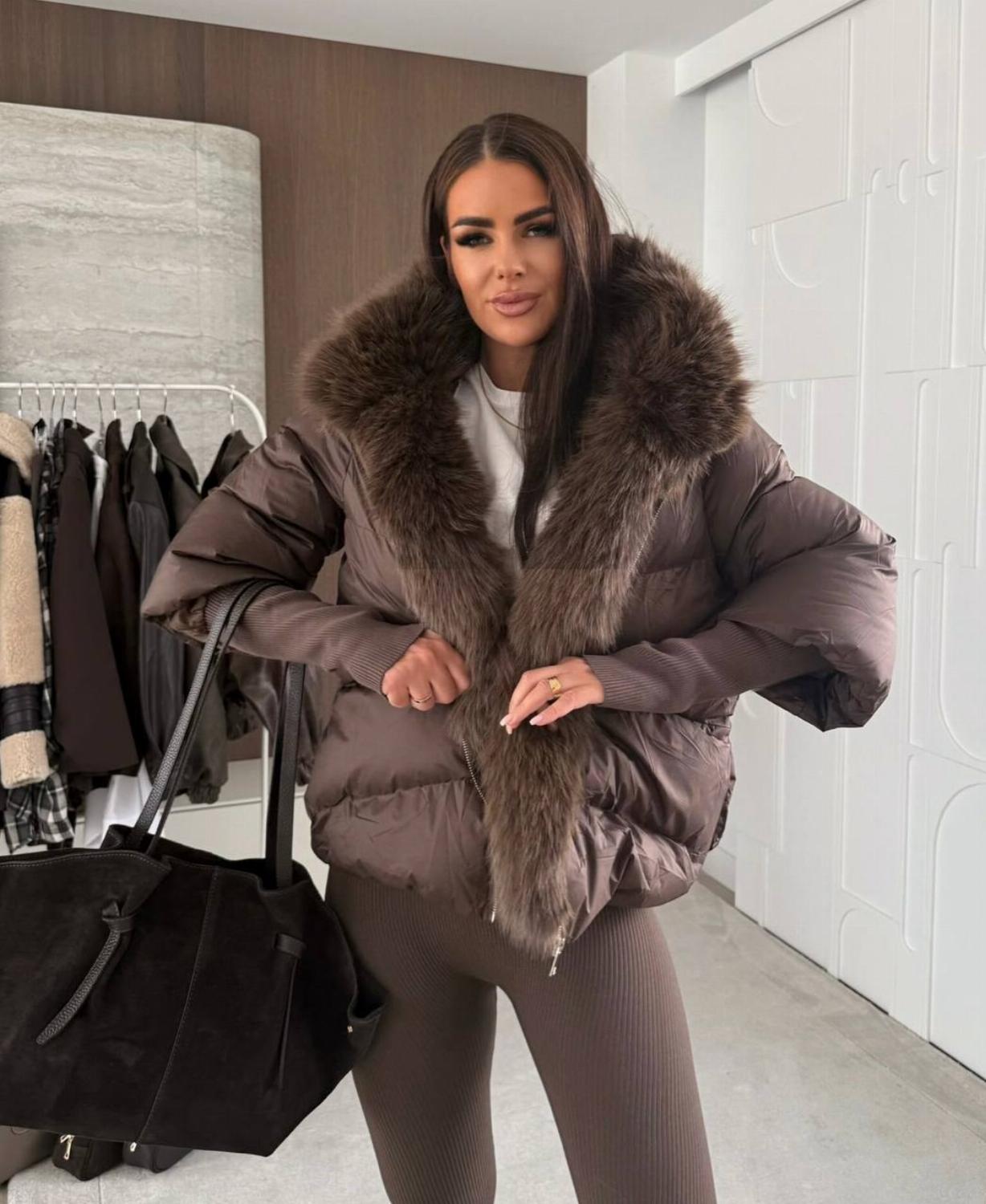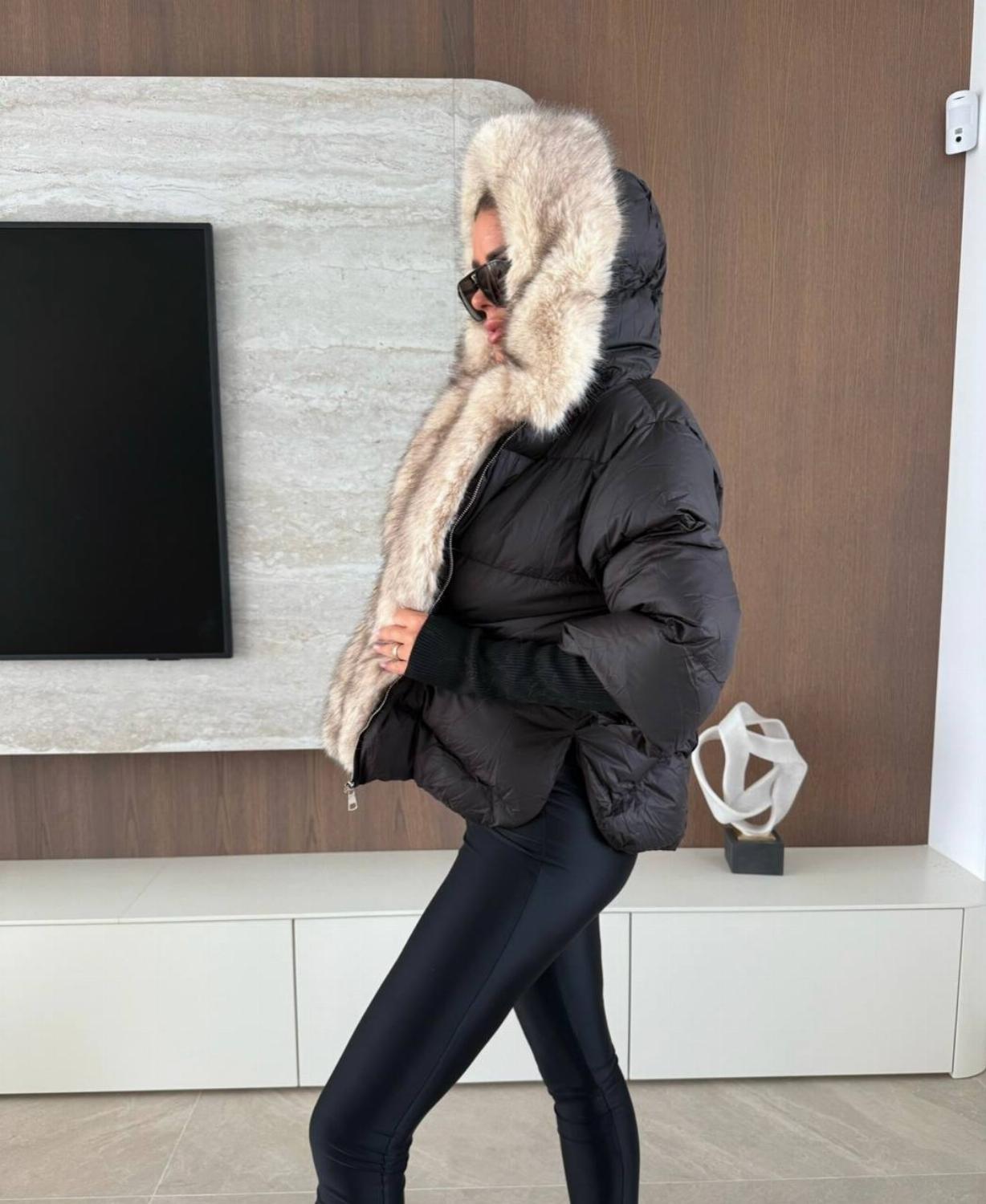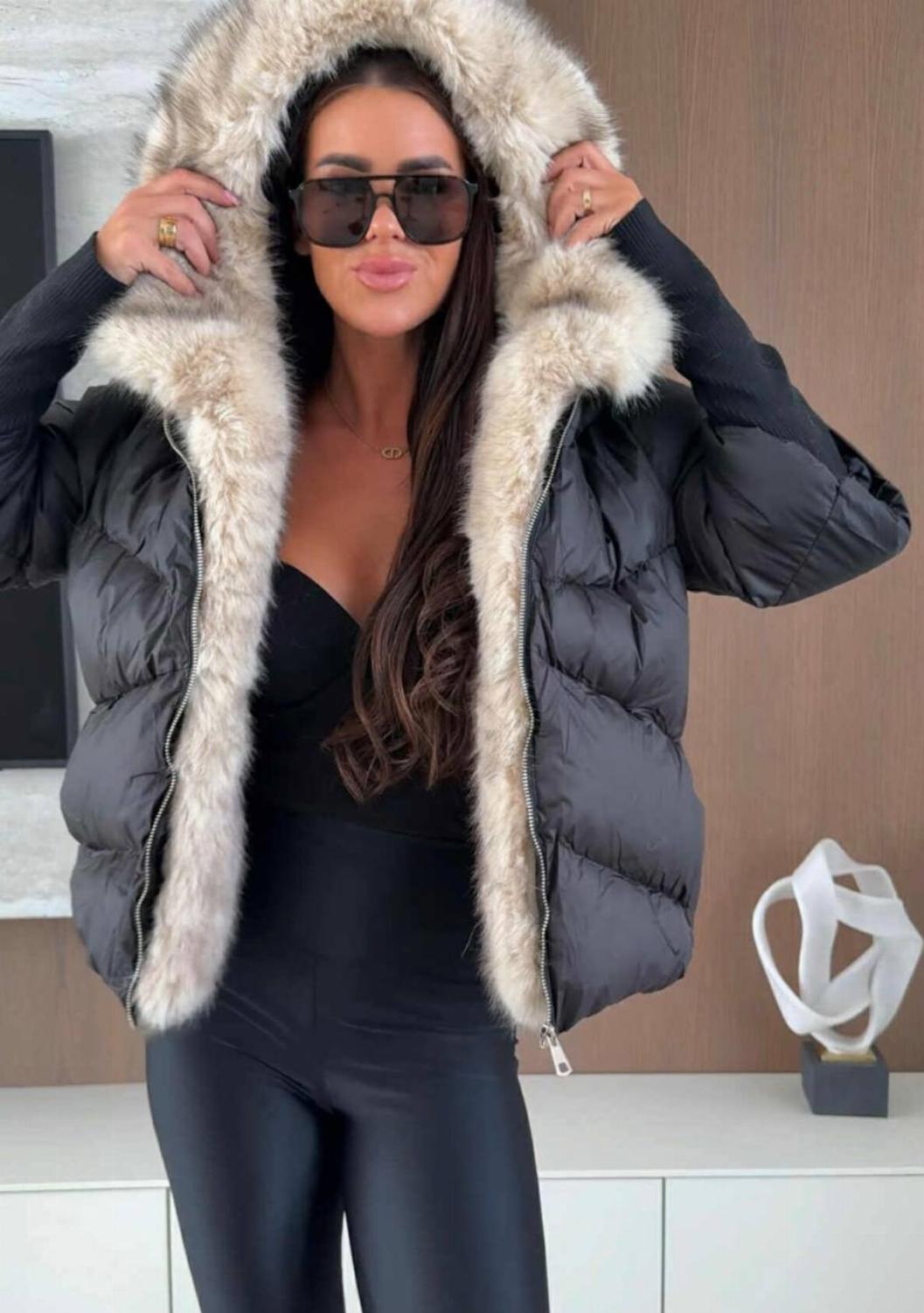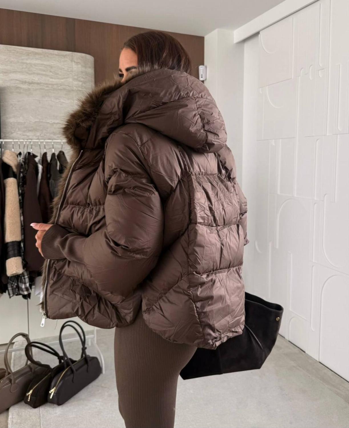 Ця стильна куртка з плащової тканини лаке з наповнювачем з еко-пуху та розкішним штучним хутром зігріє навіть у найхолодніші дні. Матеріал має м’який глянцевий блиск, що додає образу жіночності та сучасності.