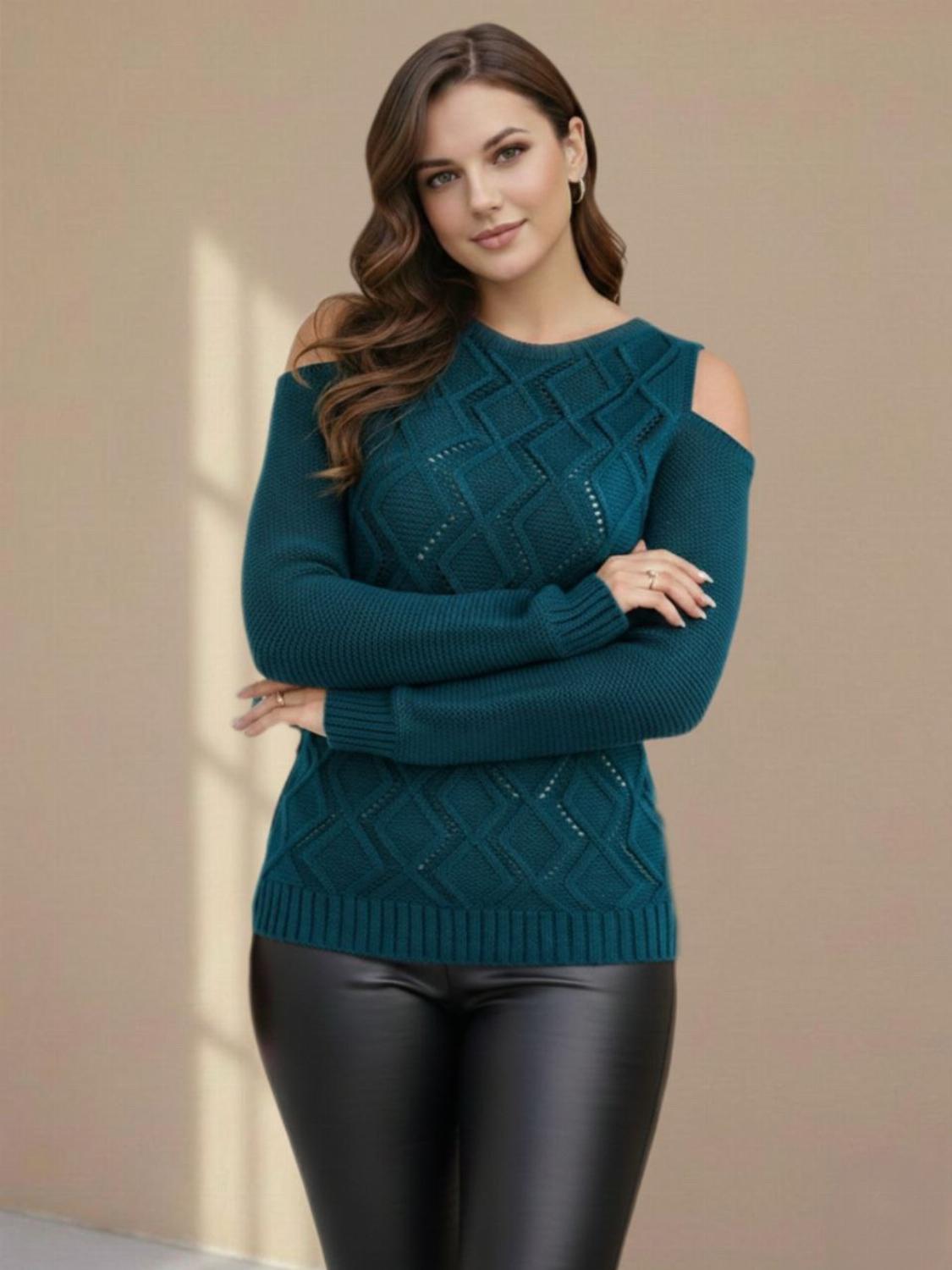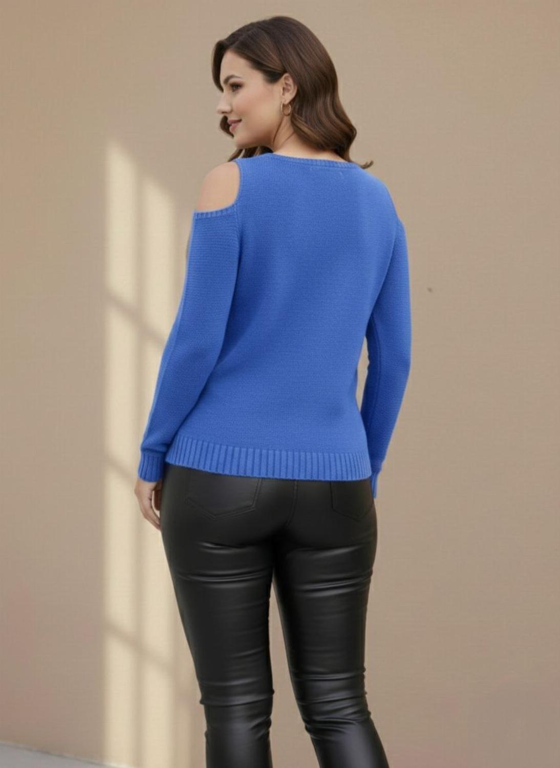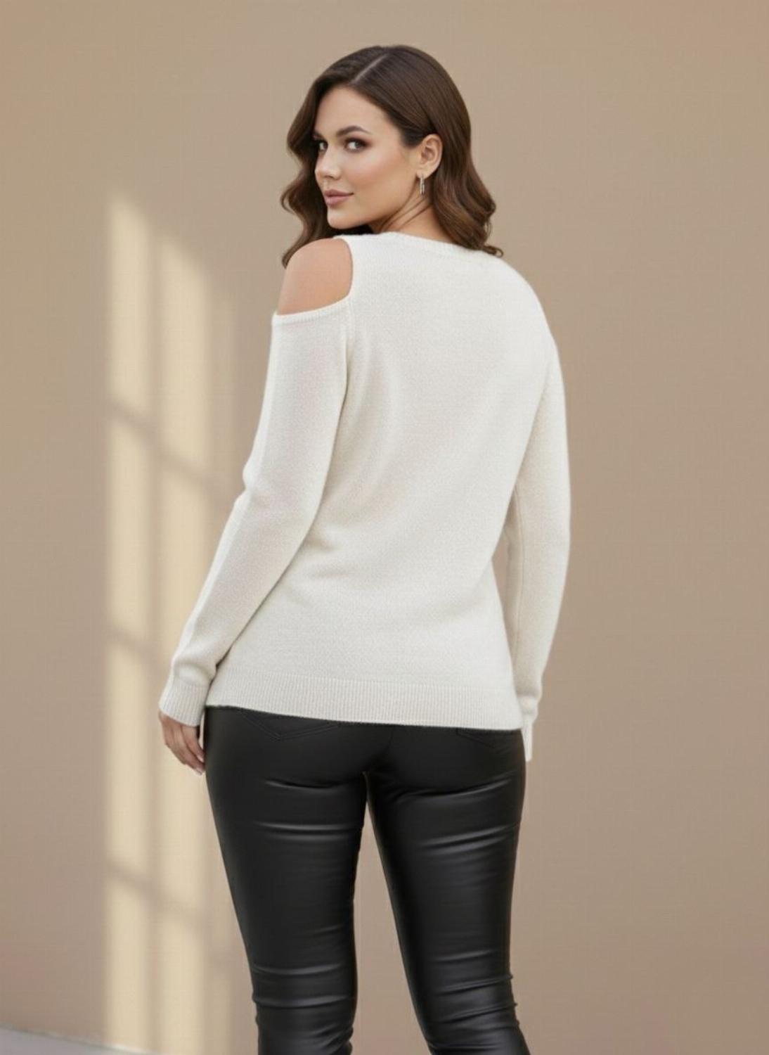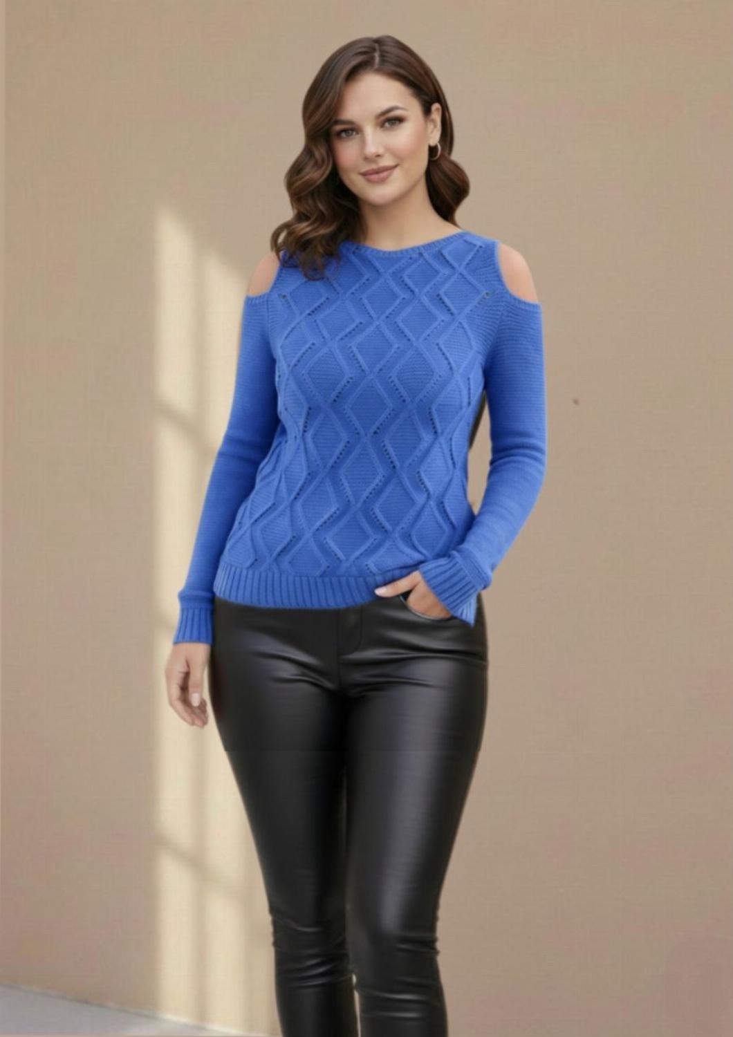 Стильний жіночий светр "Сандра" з відкритими плечима гарно сідає по фігурі. Зручний та приємний, добре поєднується з будь-яким низом – джинсами, лосинами, спідницями. З боків розрізи, спереду візерунок, спинка без малюнків.