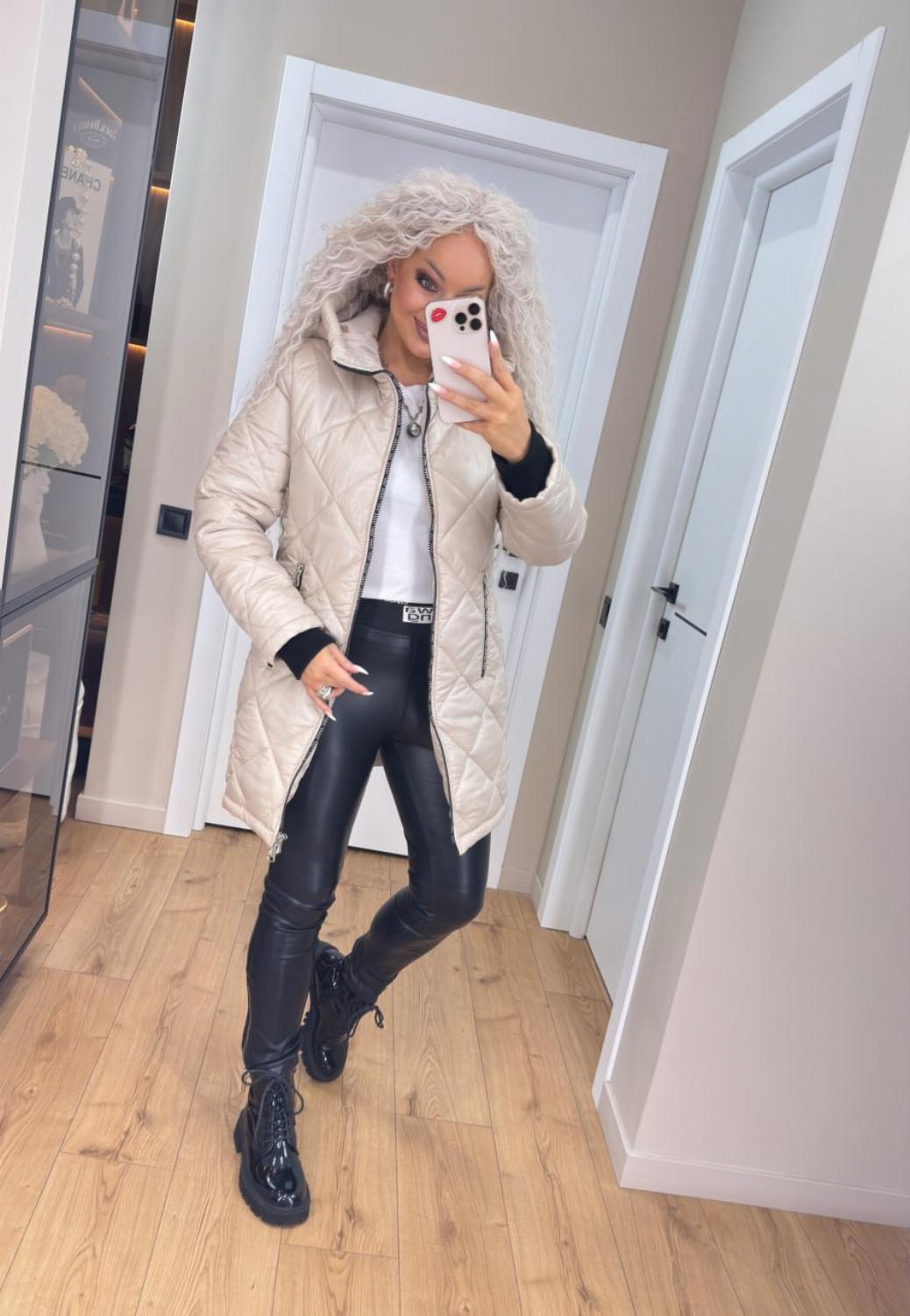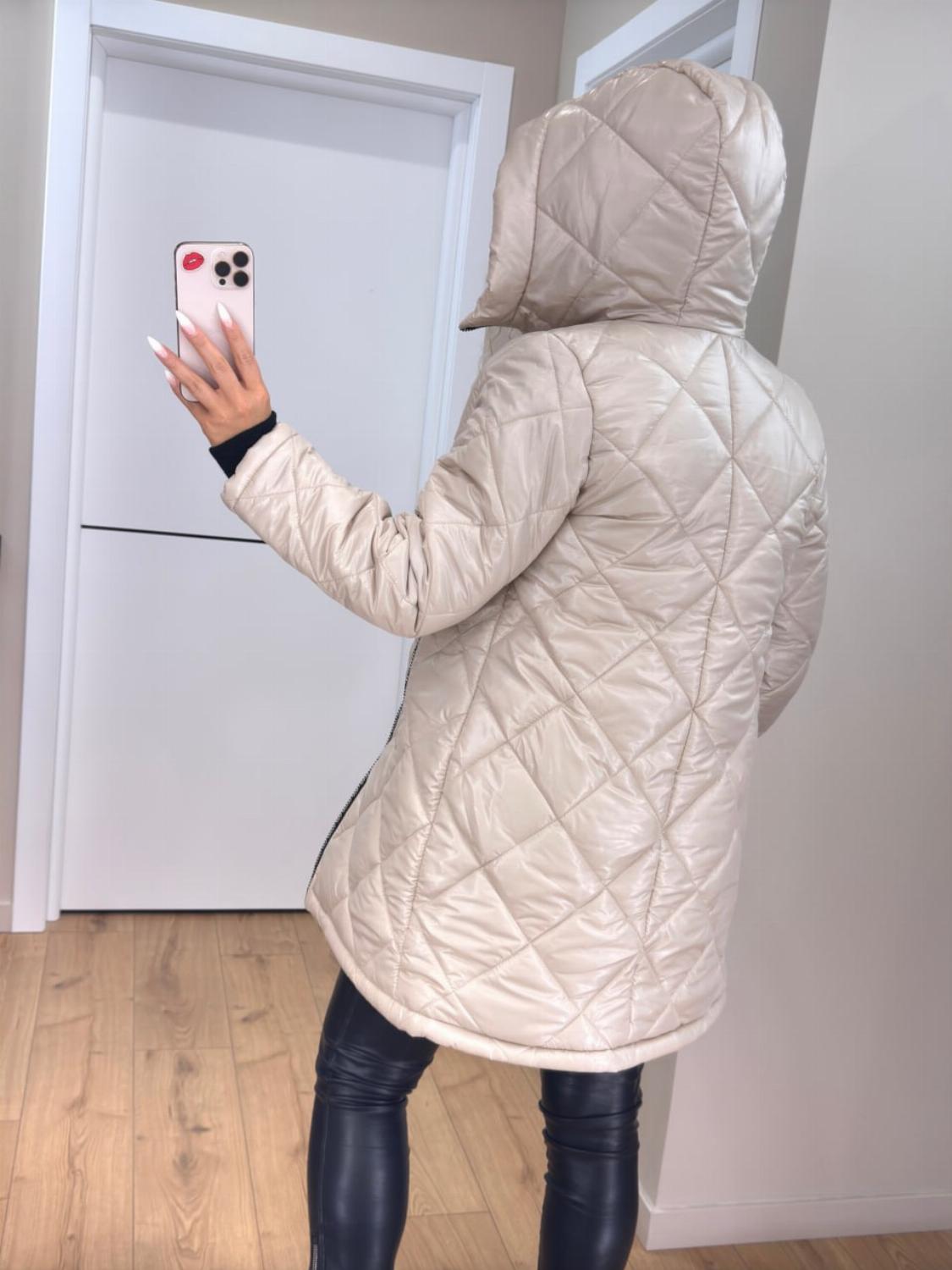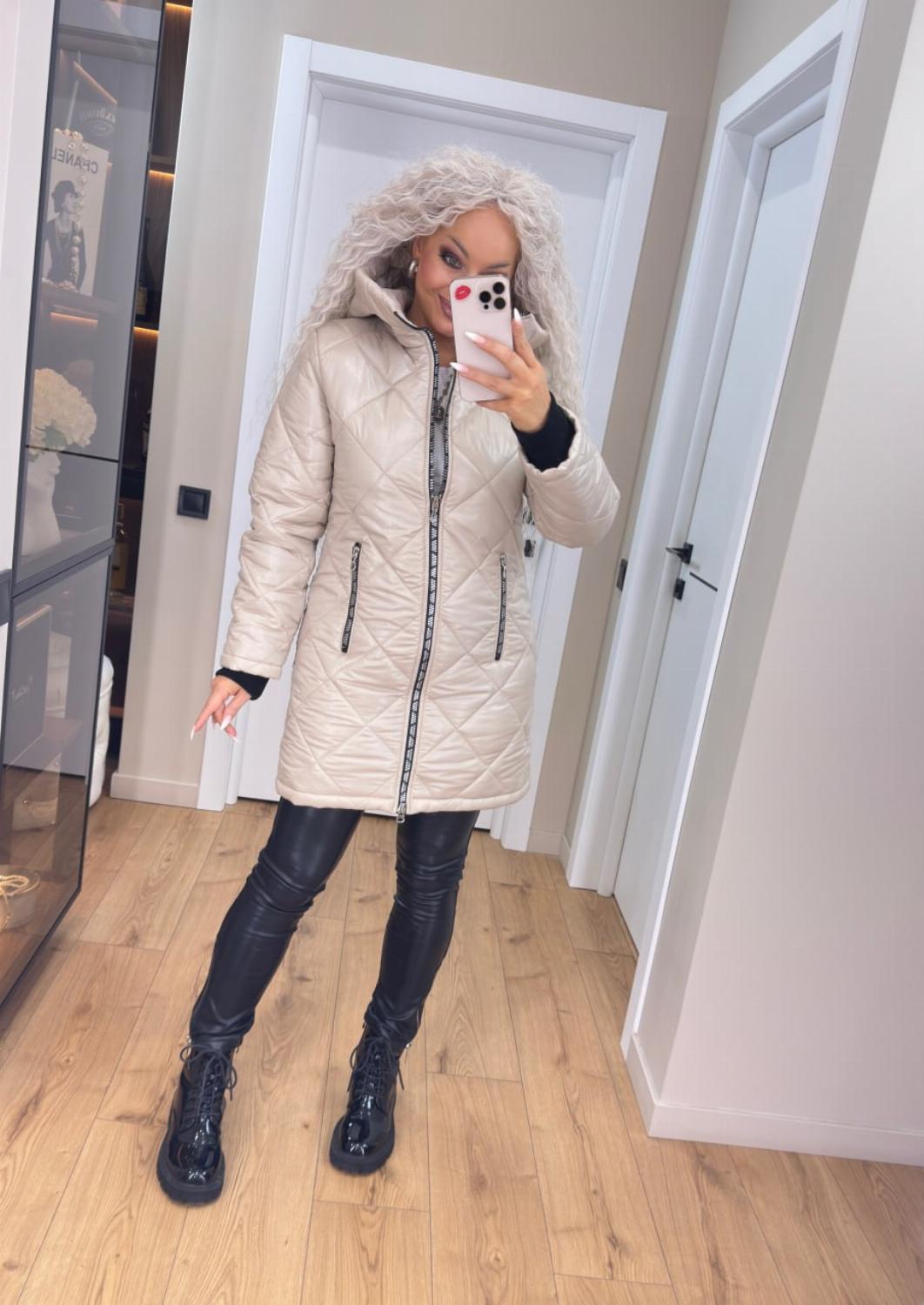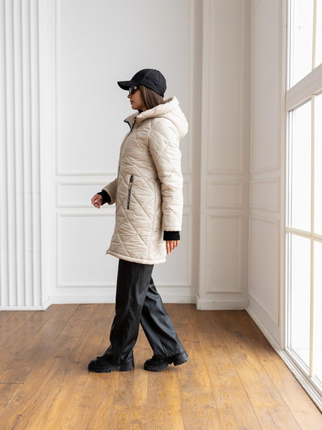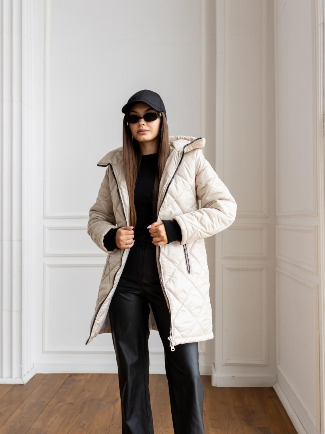 Два класичні кольори — чорний і беж — легко поєднуються як з повсякденними, так і з більш елегантними луками. Куртка чудово виглядає і з джинсами та кросівками, і зі шкіряними штанами чи чоботами.