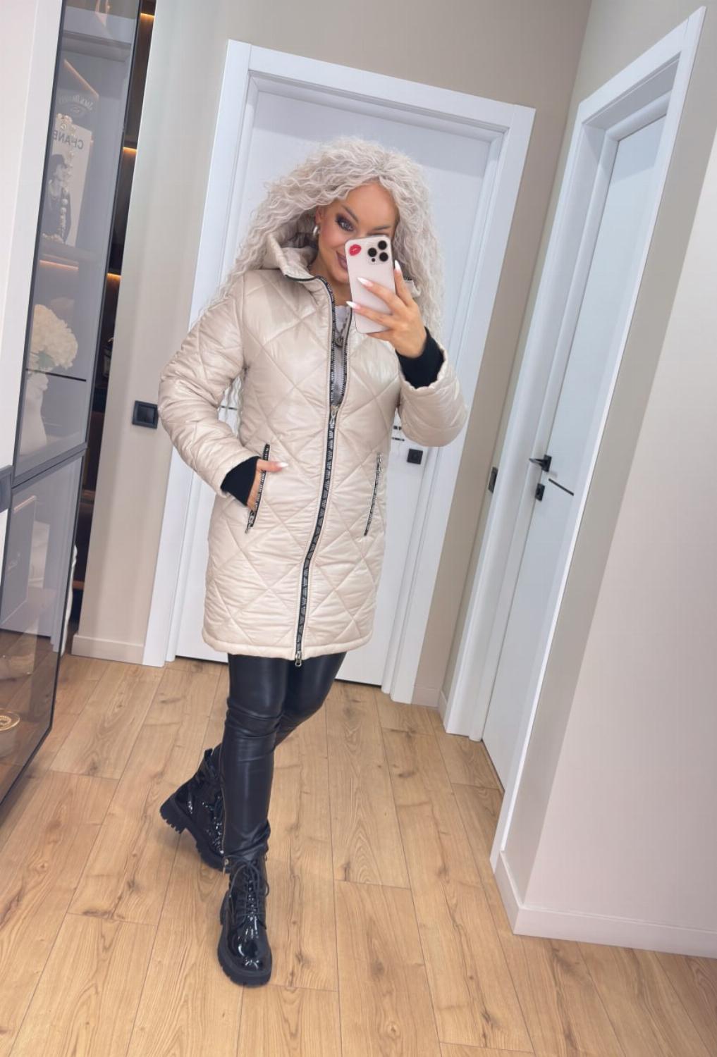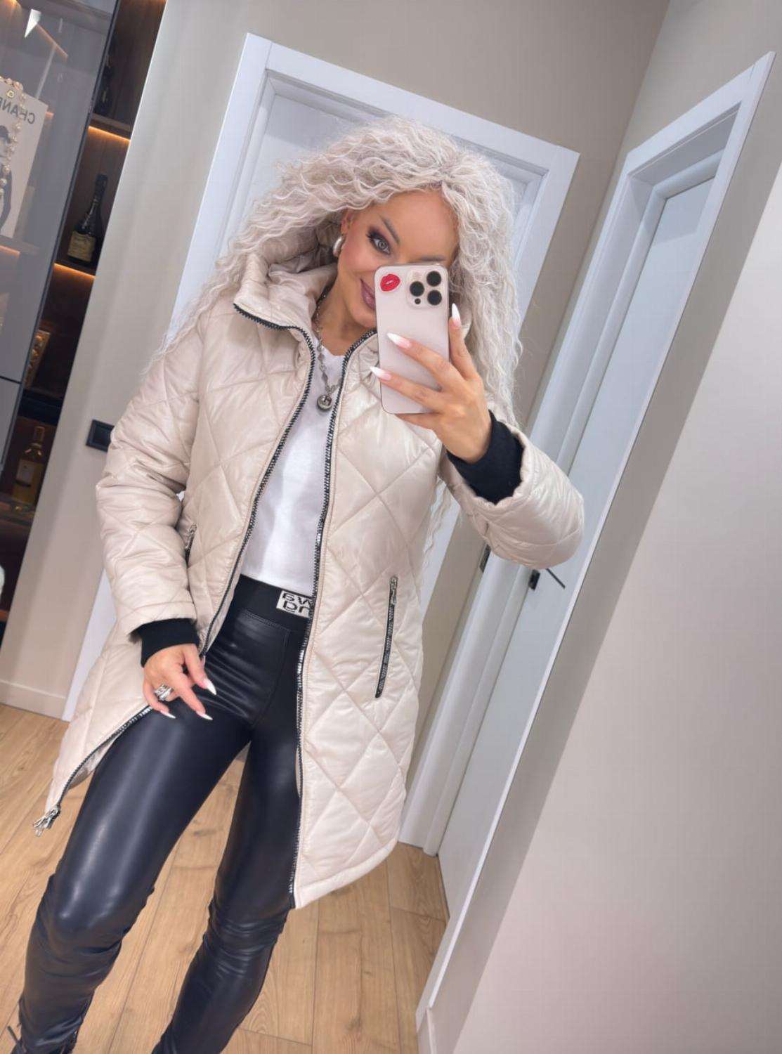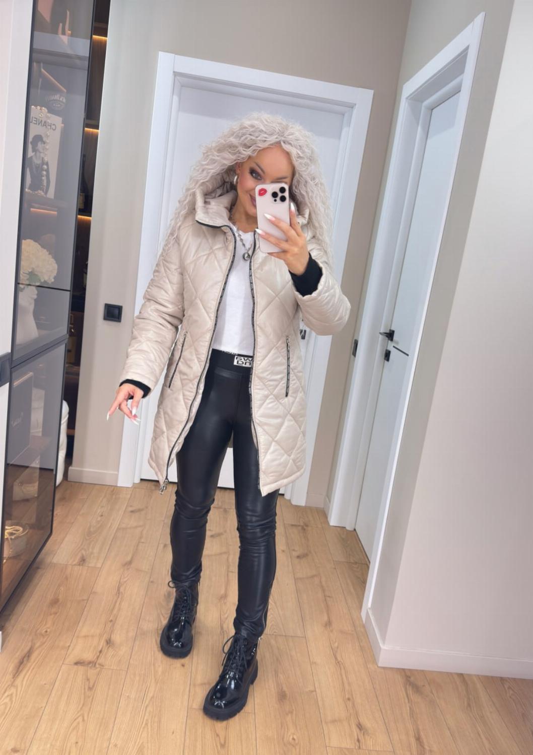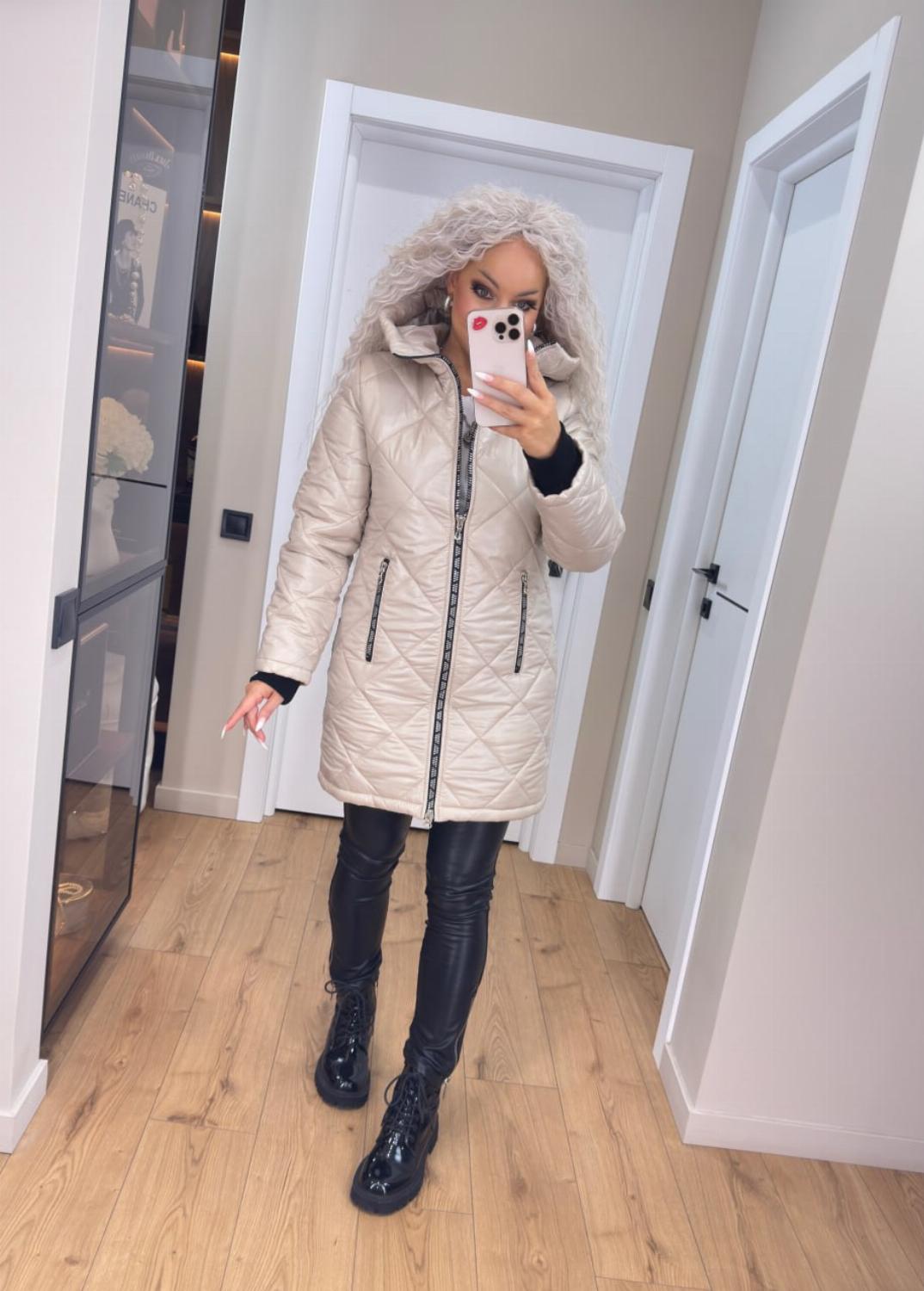 Два класичні кольори — чорний і беж — легко поєднуються як з повсякденними, так і з більш елегантними луками. Куртка чудово виглядає і з джинсами та кросівками, і зі шкіряними штанами чи чоботами.