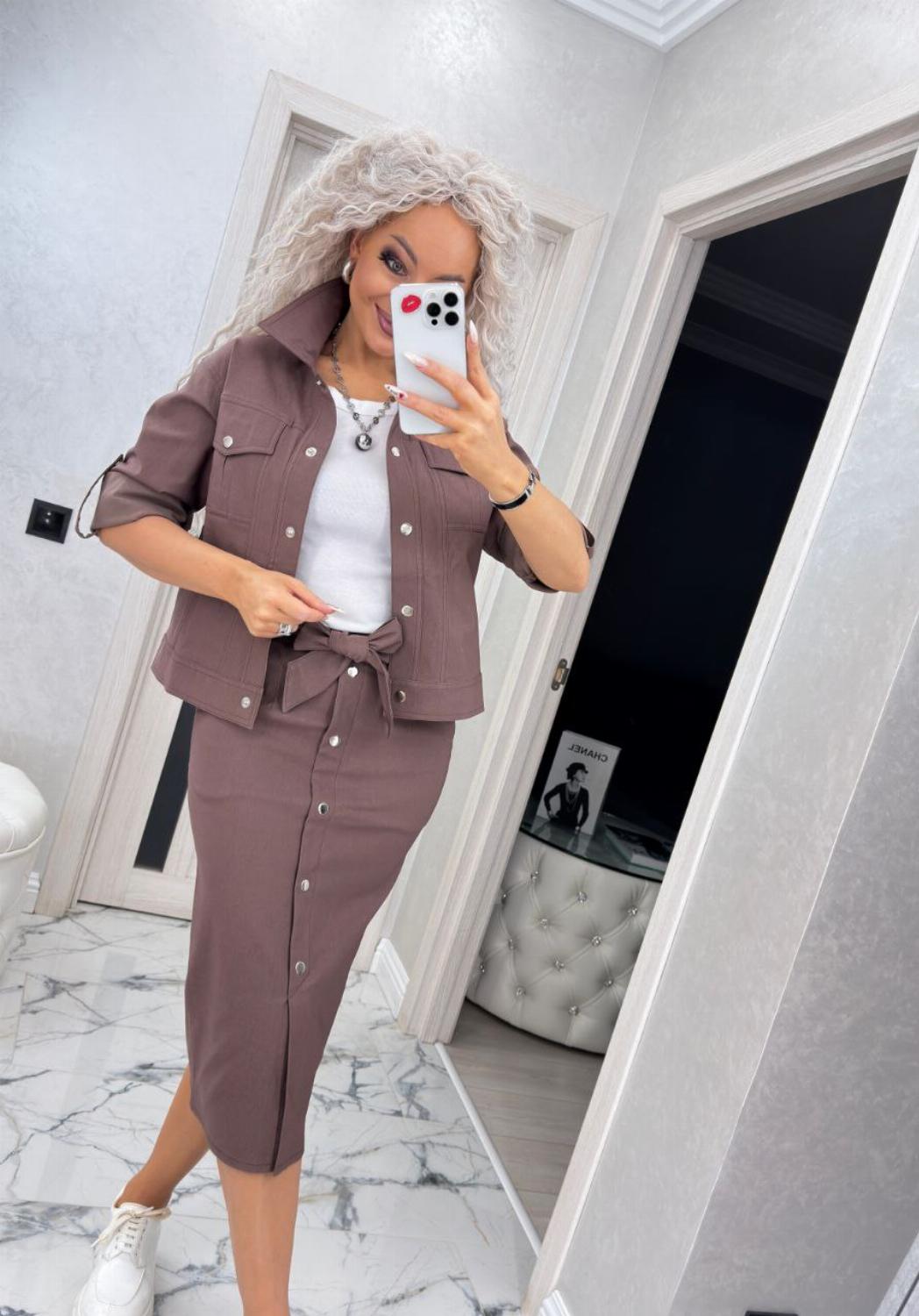 Спідниця з завищеною лінією талії, силует "футляр", застібається на потаємну блискавку. талія прикрашена широким поясом, який входить до комплекту.