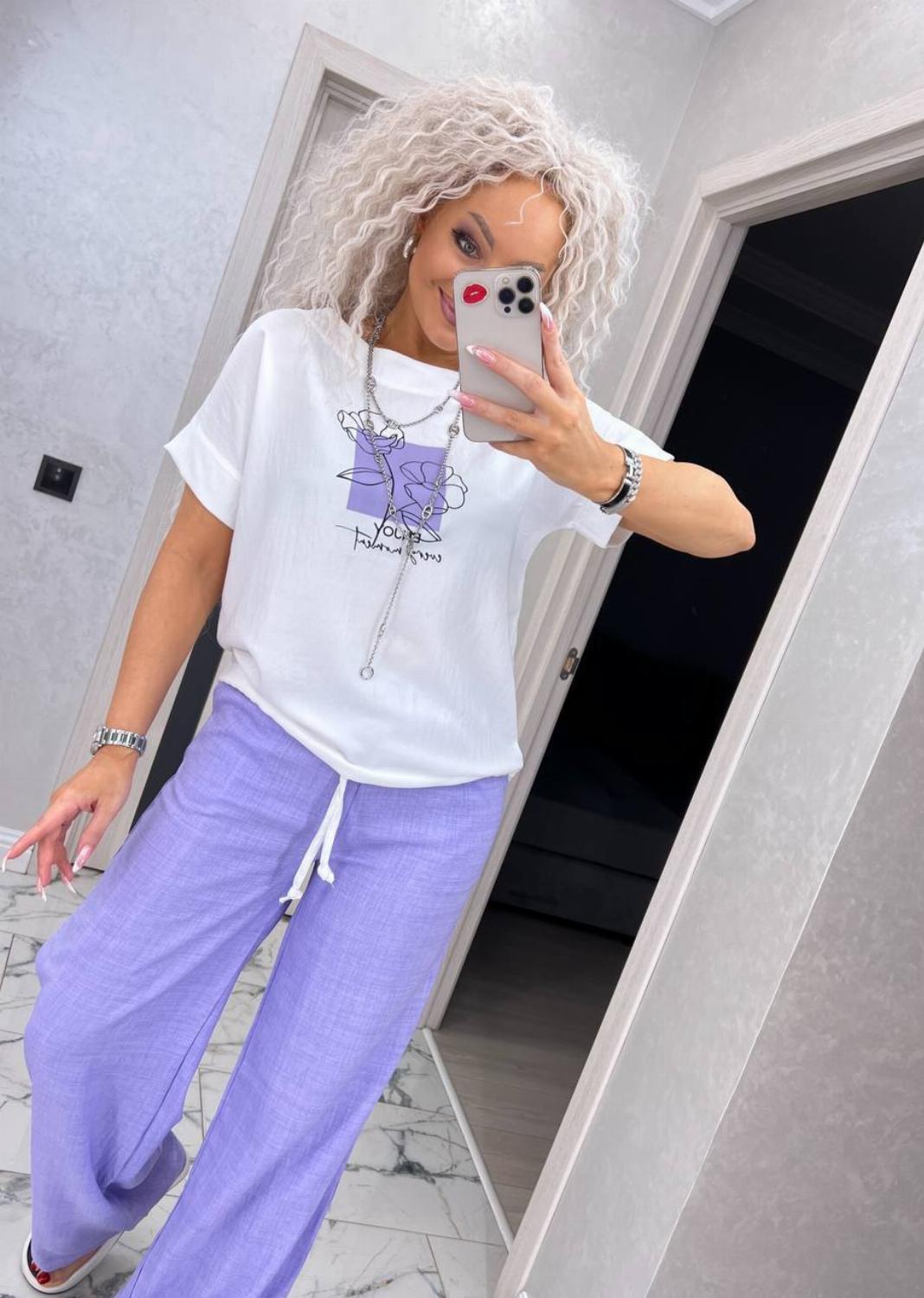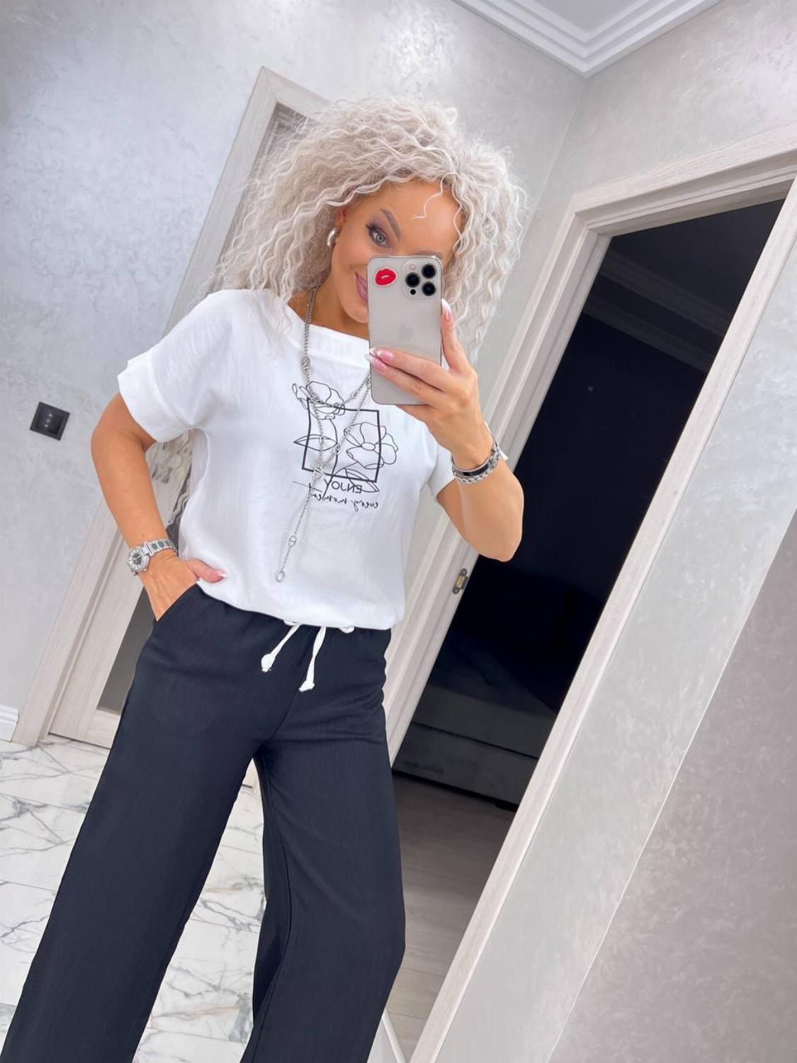 Стильна кофта з коротким рукавом і зручні вільні штани з еластичною резинкою на талії забезпечать максимальний комфорт і підкреслять вашу жіночність.