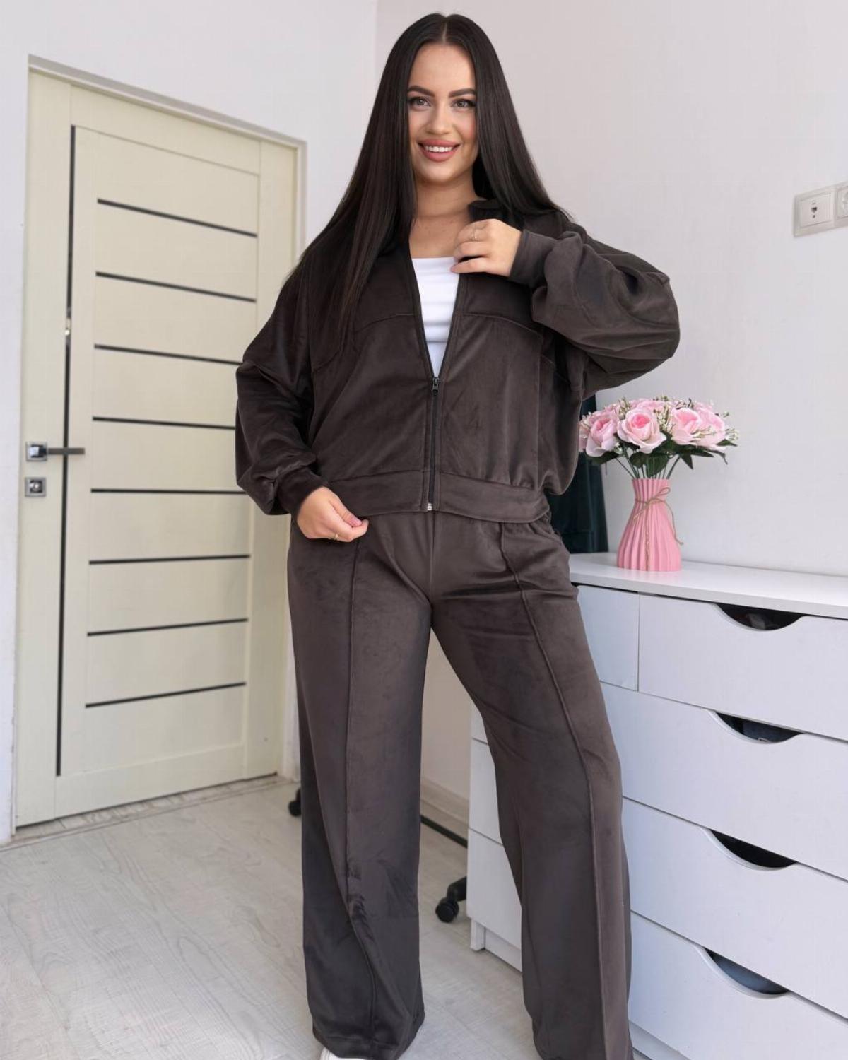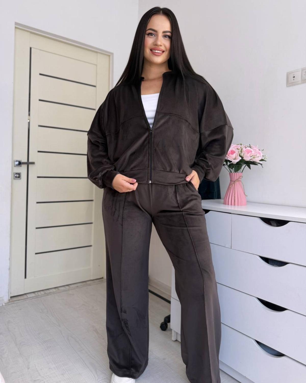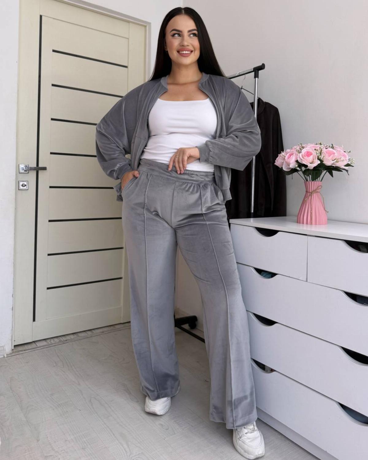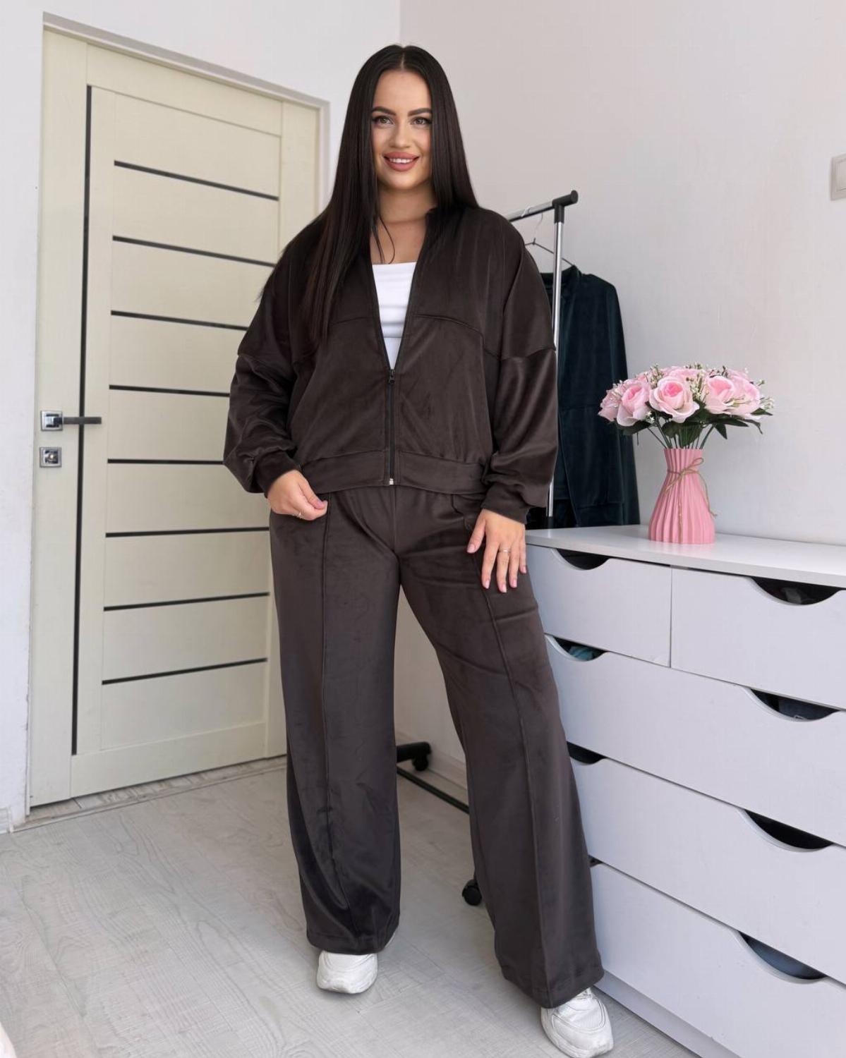 Цей костюм із велюру — ідеальний вибір для прогулянок, подорожей та затишного відпочинку. Завдяки вільному крою та приємній на дотик тканині, він подарує вам комфорт на весь день.
