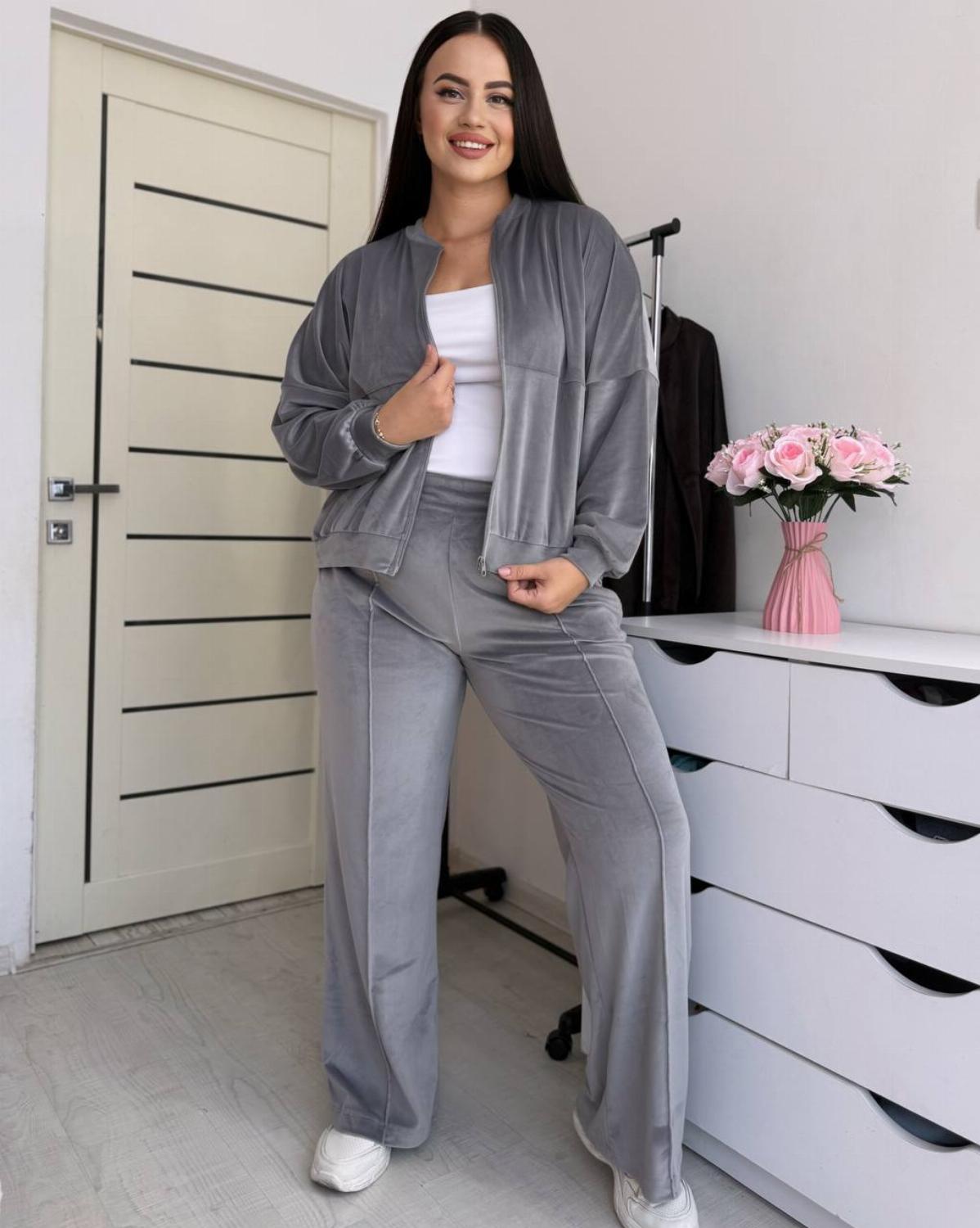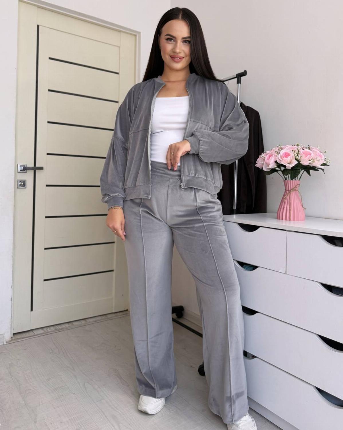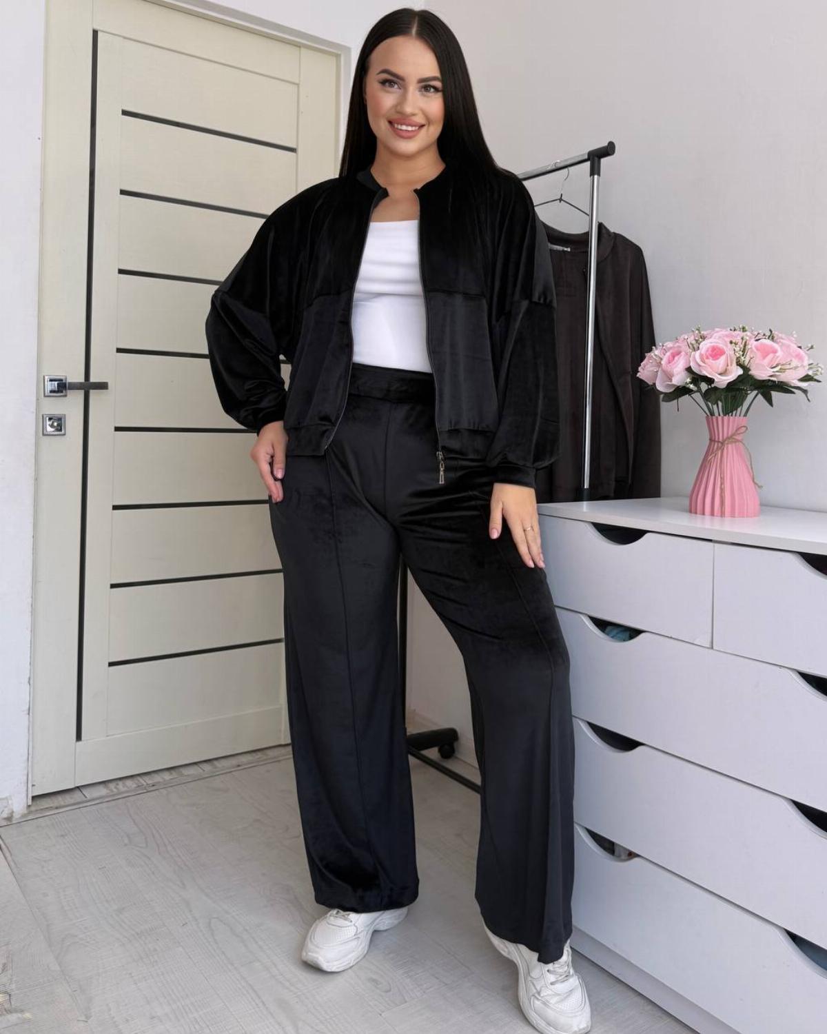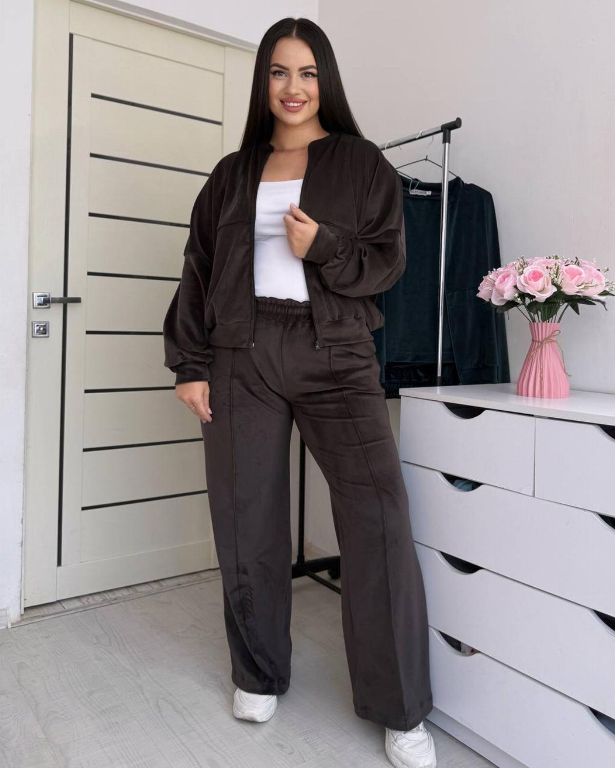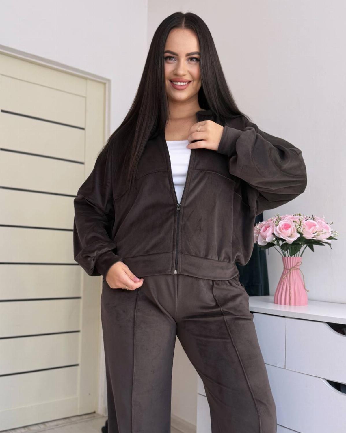 Цей костюм із велюру — ідеальний вибір для прогулянок, подорожей та затишного відпочинку. Завдяки вільному крою та приємній на дотик тканині, він подарує вам комфорт на весь день.