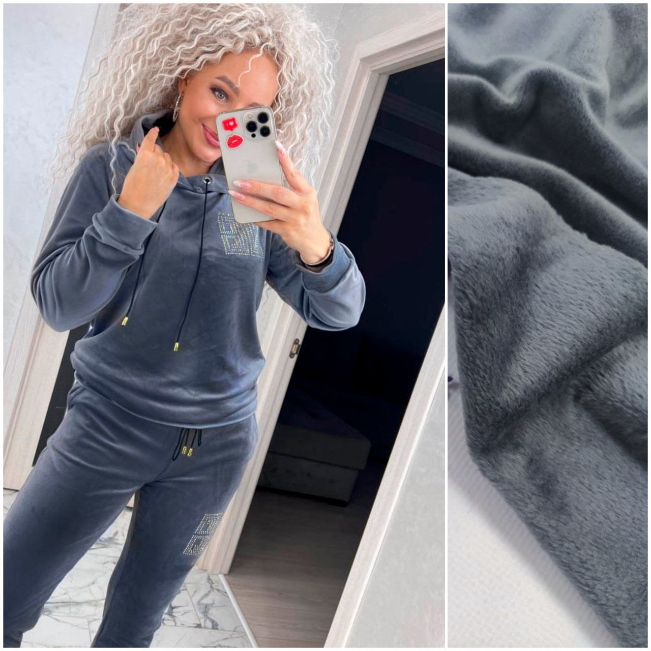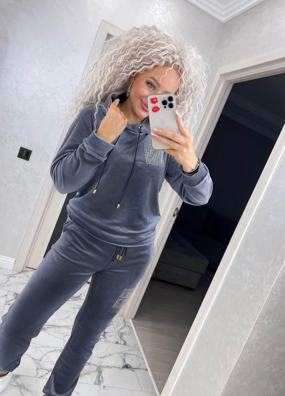 Утеплений жіночий велюровий спортивний костюм зі стразами «Шарон» - ідеальний варіант для повсякденного носіння. Костюм виконаний з якісної тканини з хутром - м'яким, приємним до тіла. Кофту і штани можна носити разом або окремо з іншими речами з вашого гардеробу. Костюм прикрашений аплікацією зі стразами.