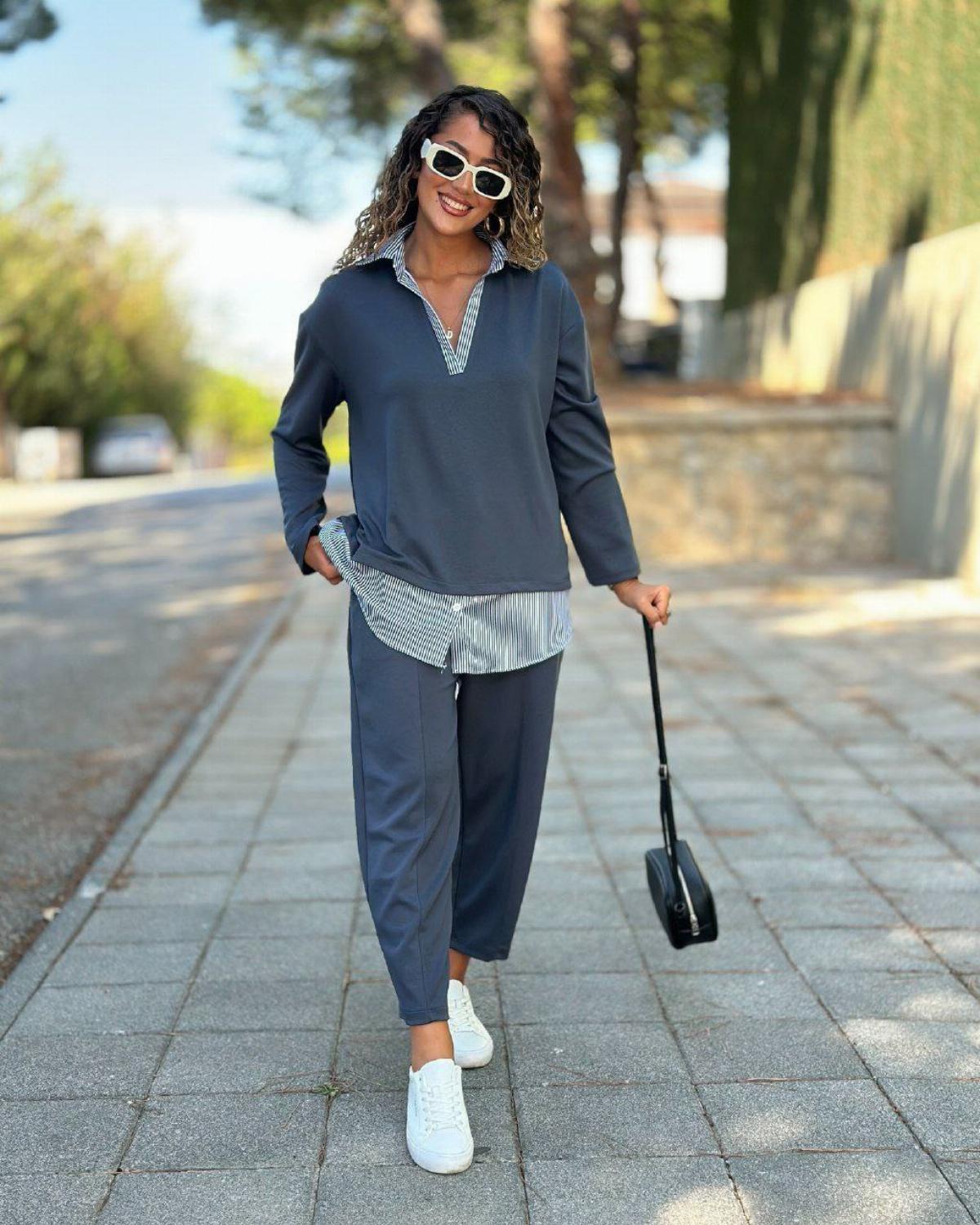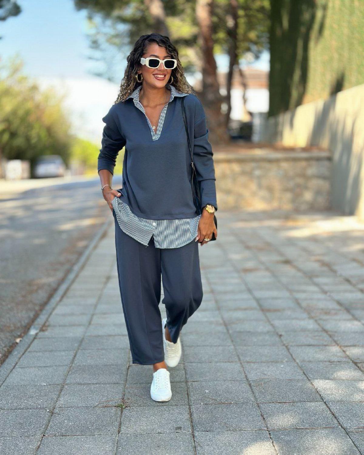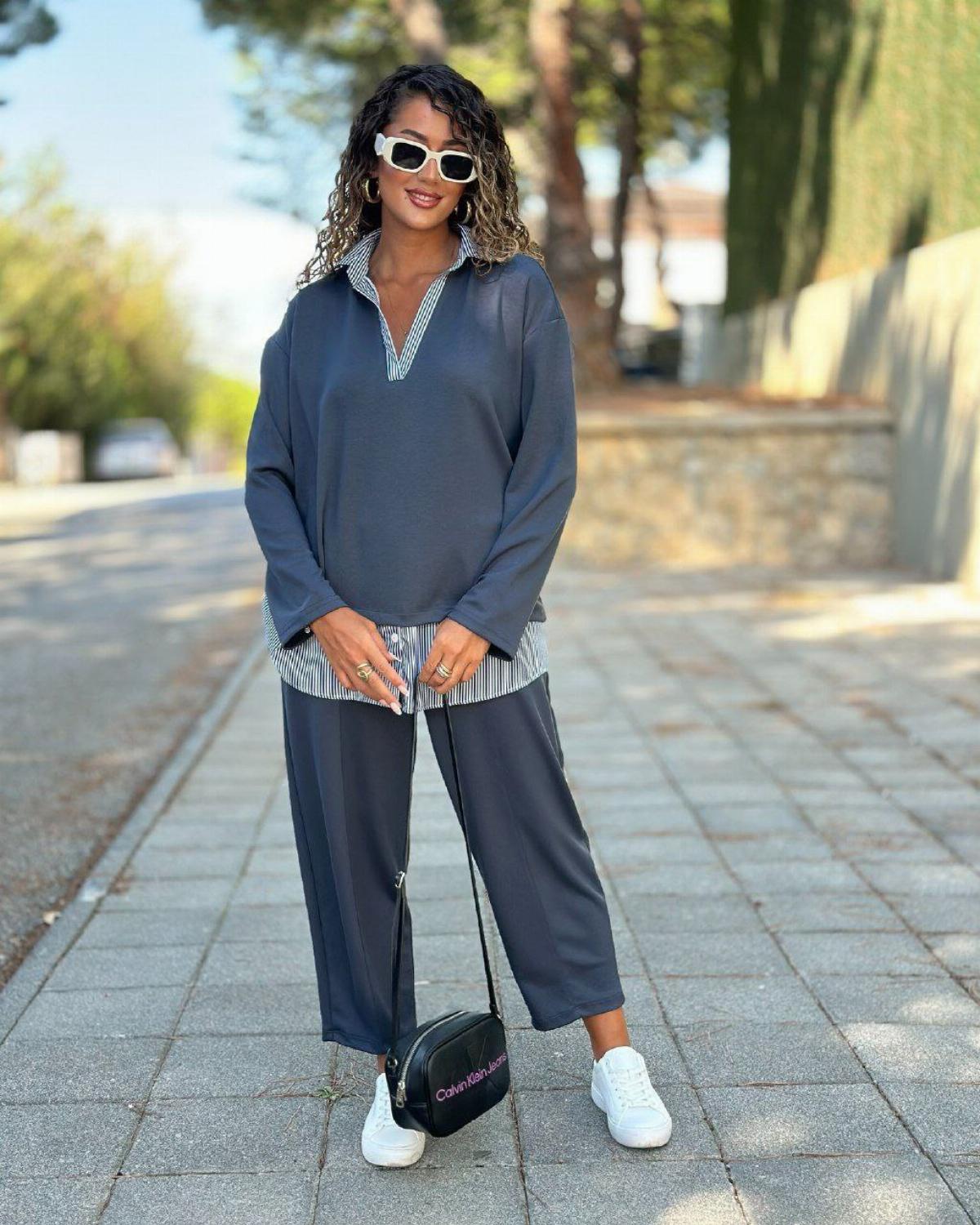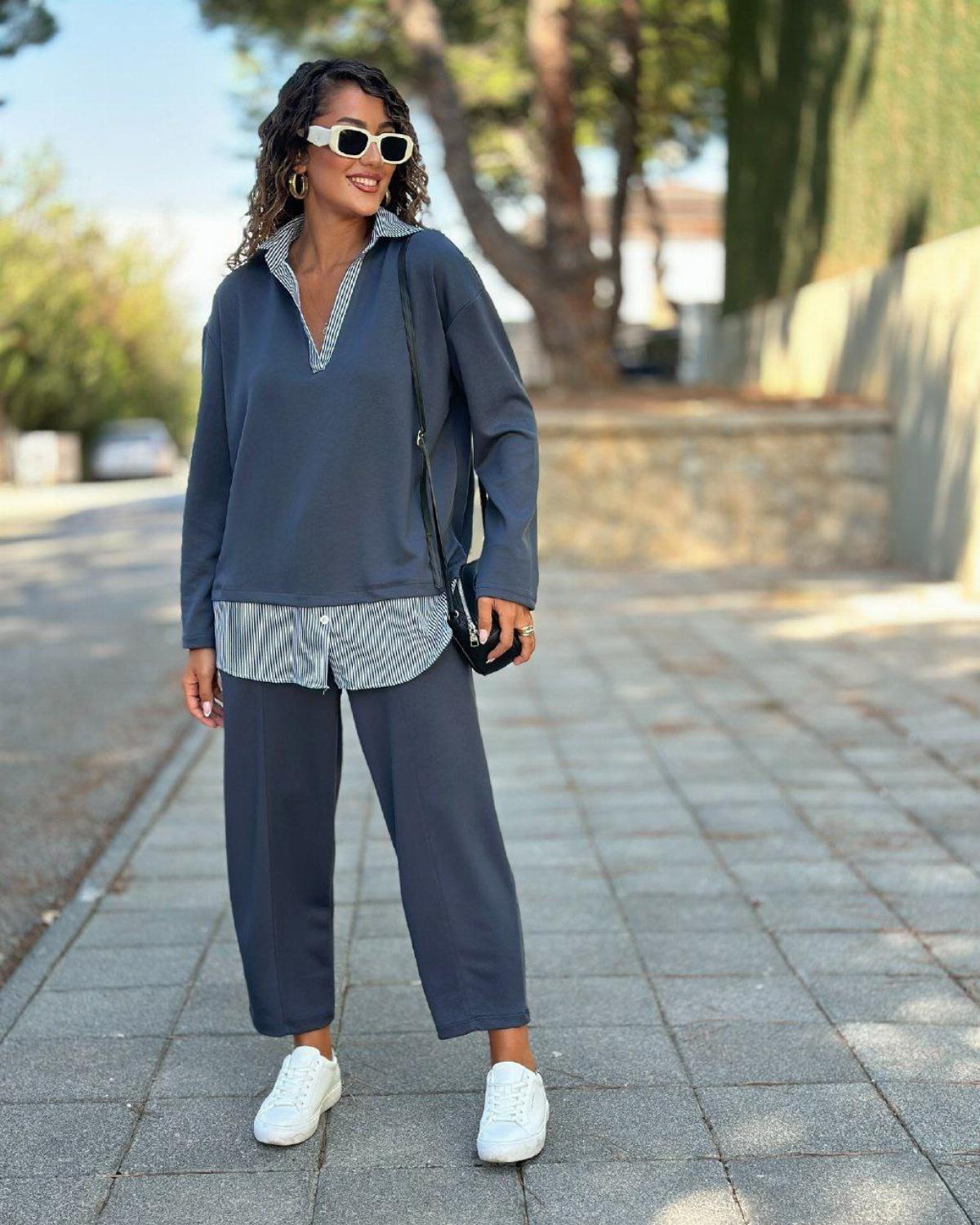 Комфортний крій: Вільні штани та джемпер підкреслюють фігуру, не сковуючи рухів.