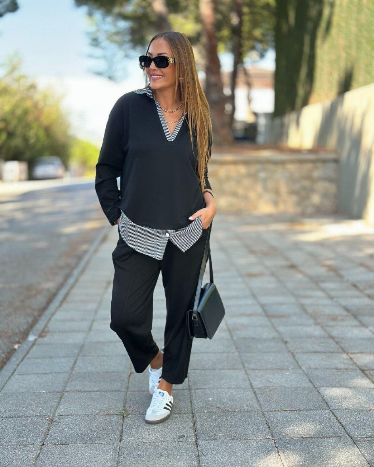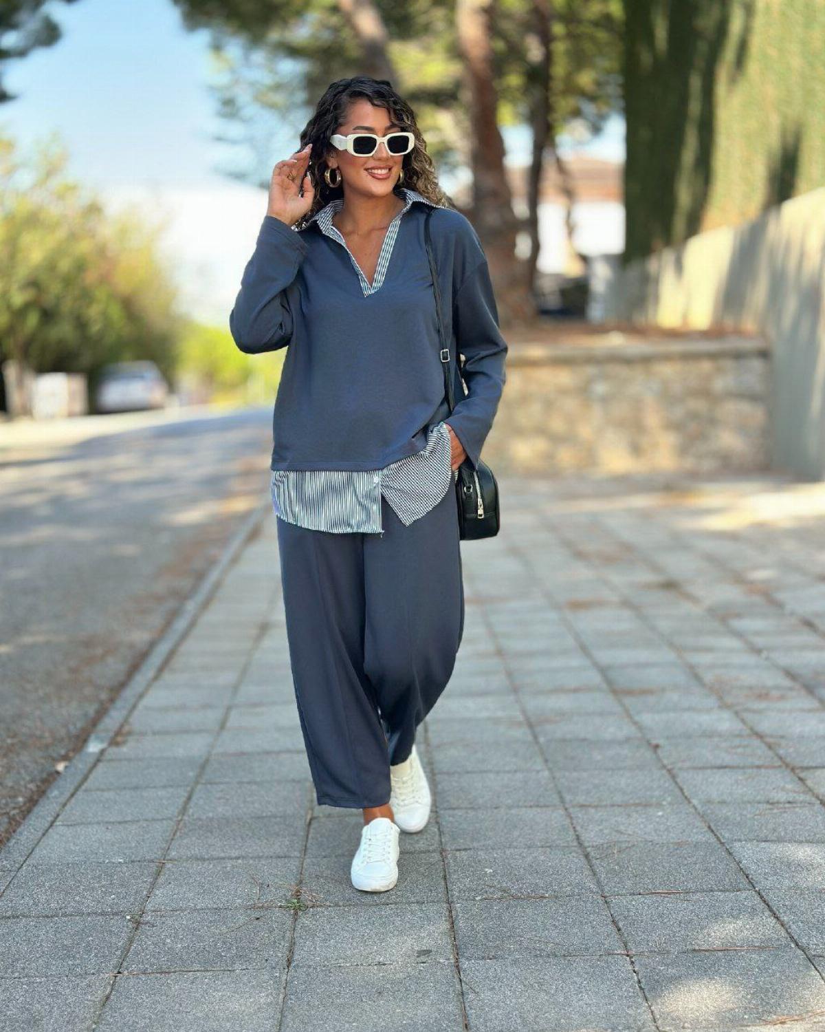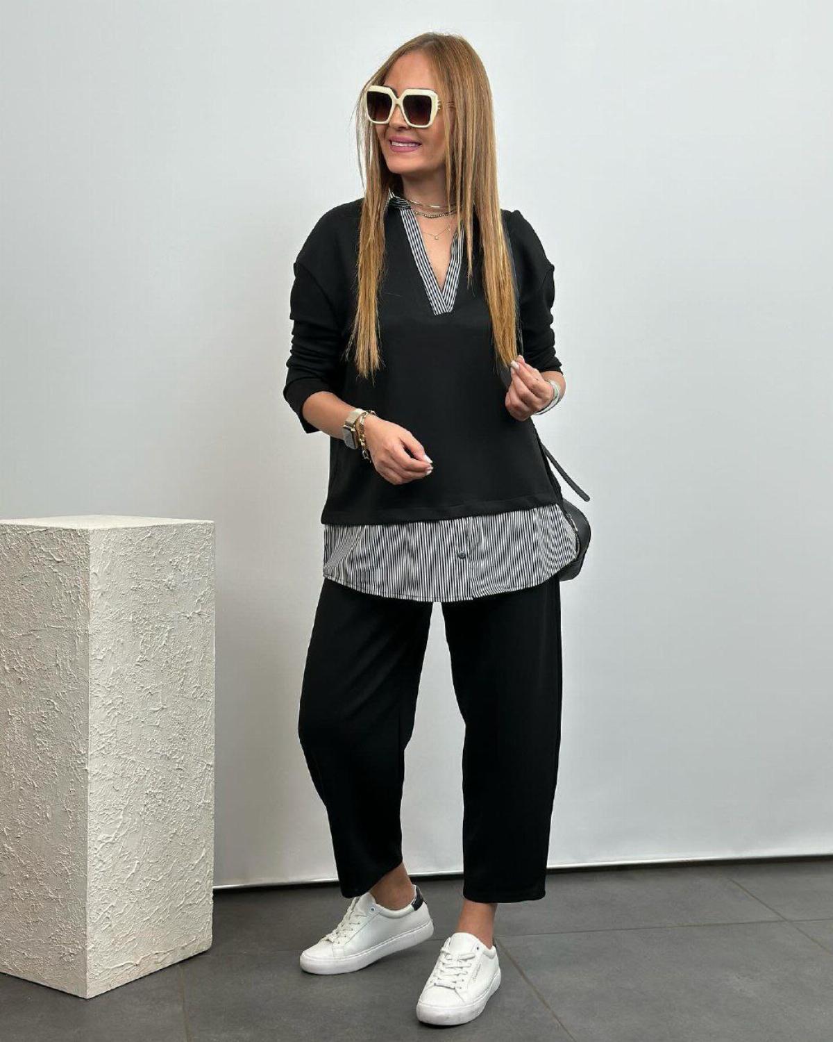 Комфортний крій: Вільні штани та джемпер підкреслюють фігуру, не сковуючи рухів.