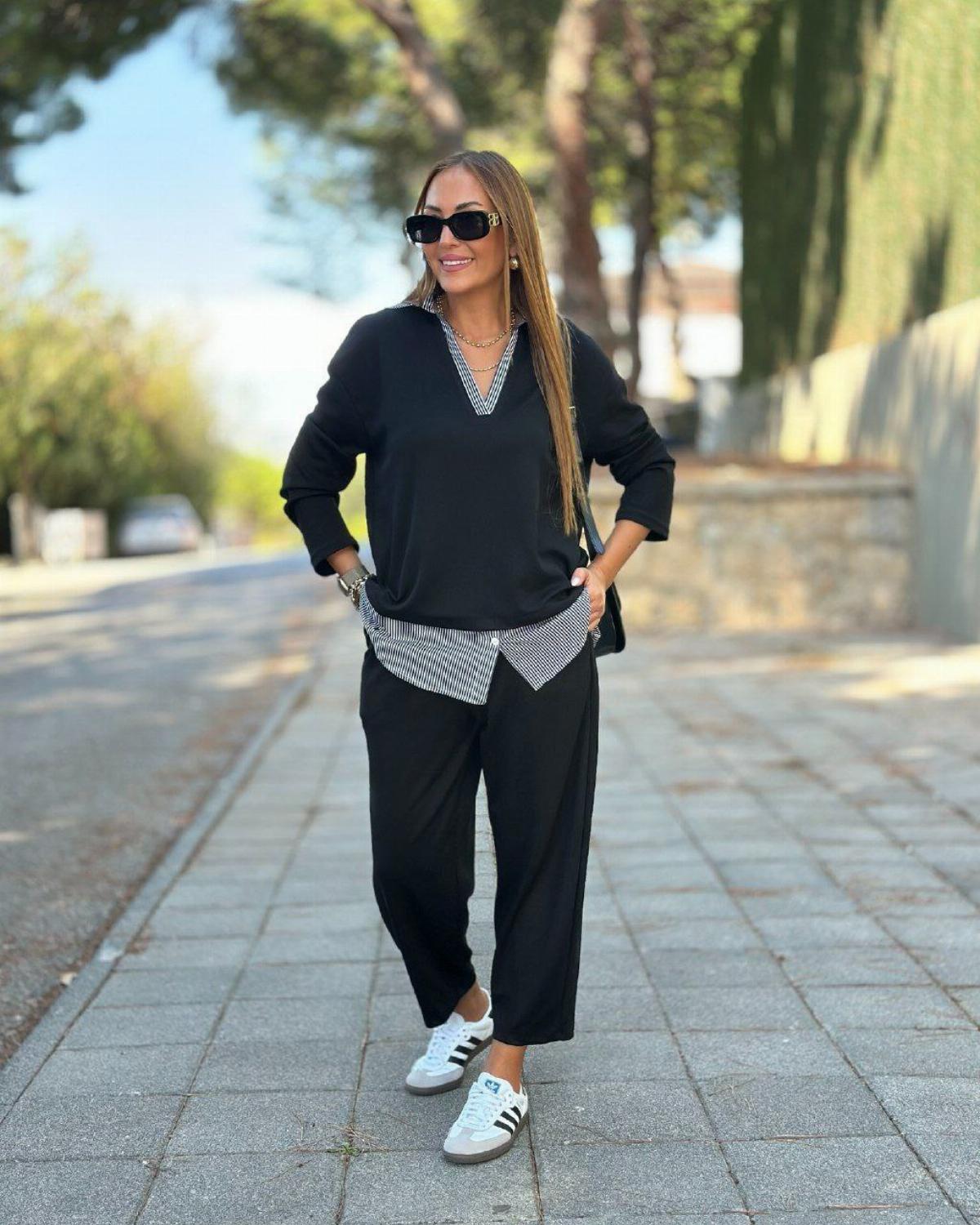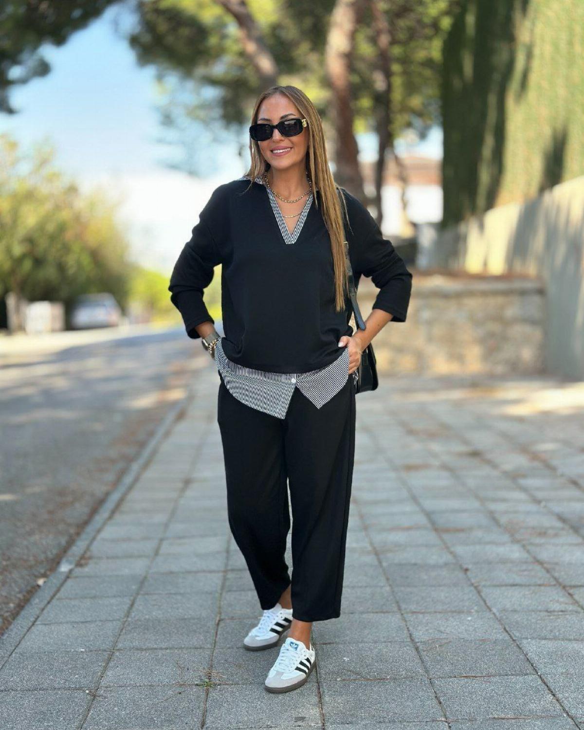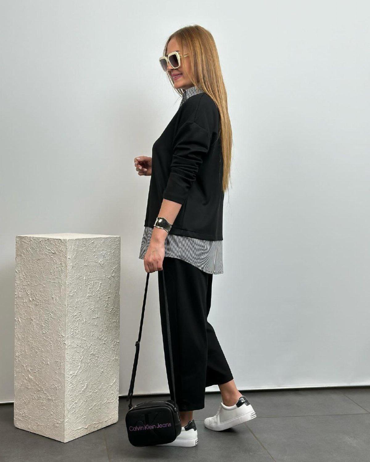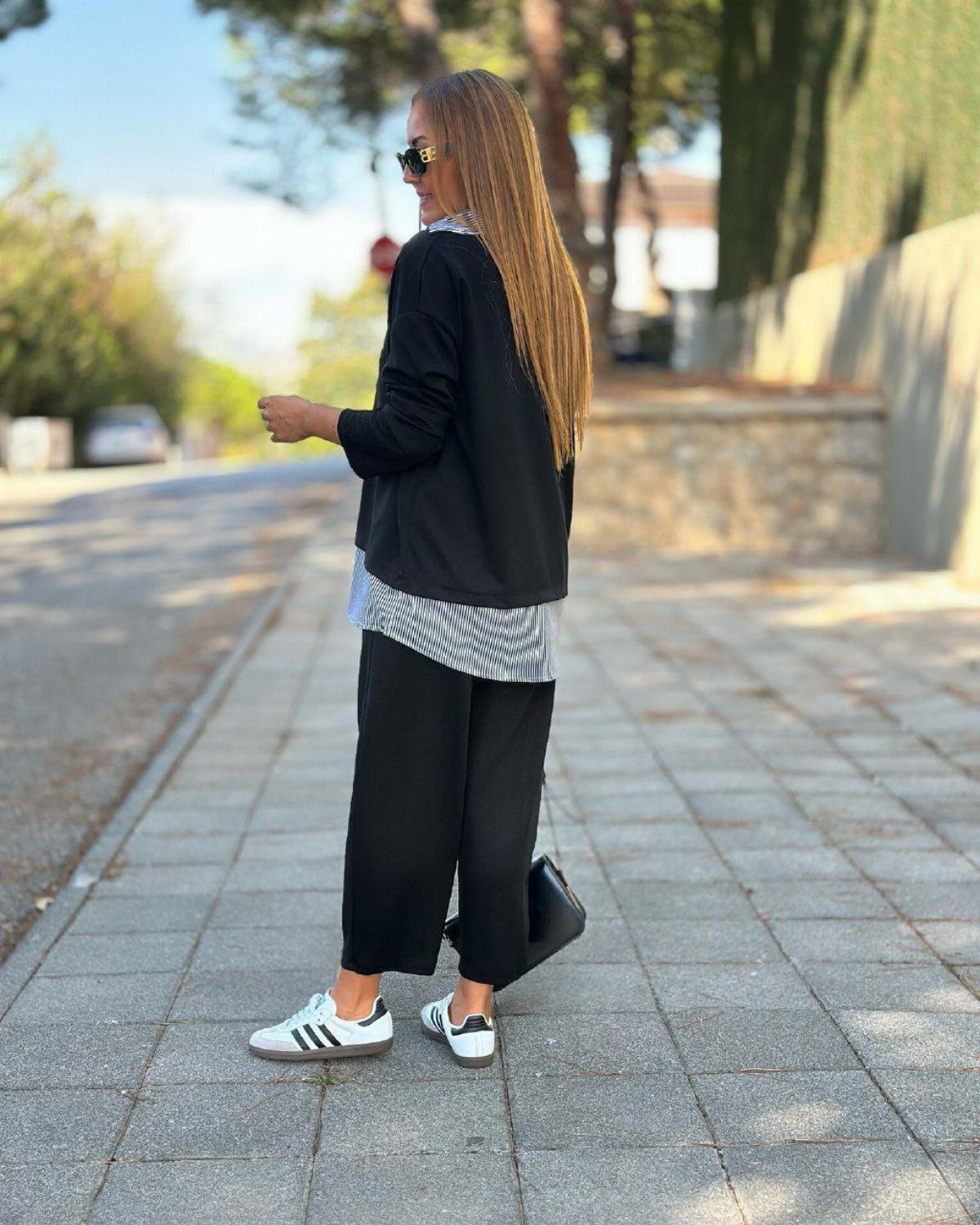 Комфортний крій: Вільні штани та джемпер підкреслюють фігуру, не сковуючи рухів.