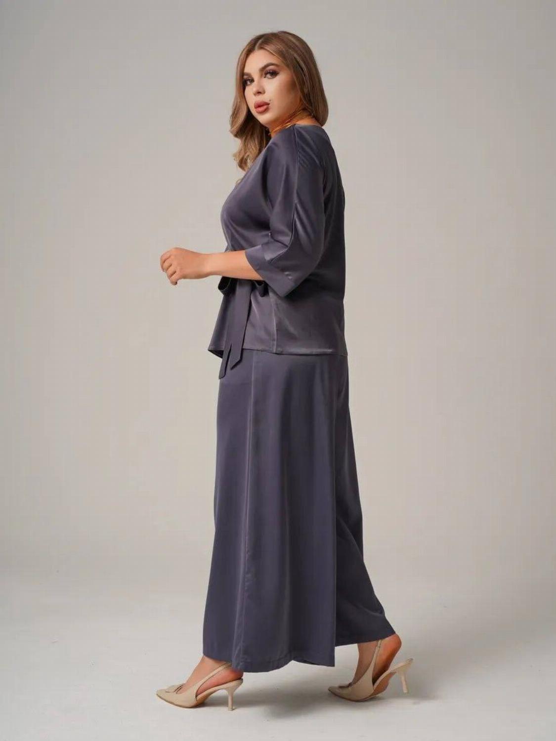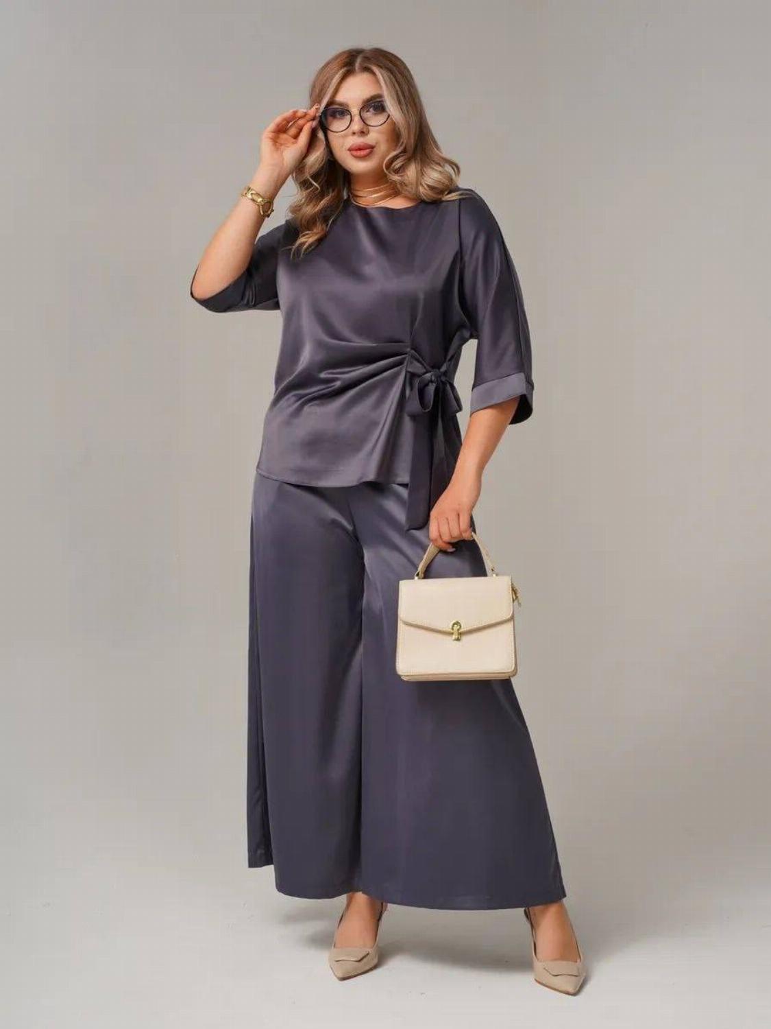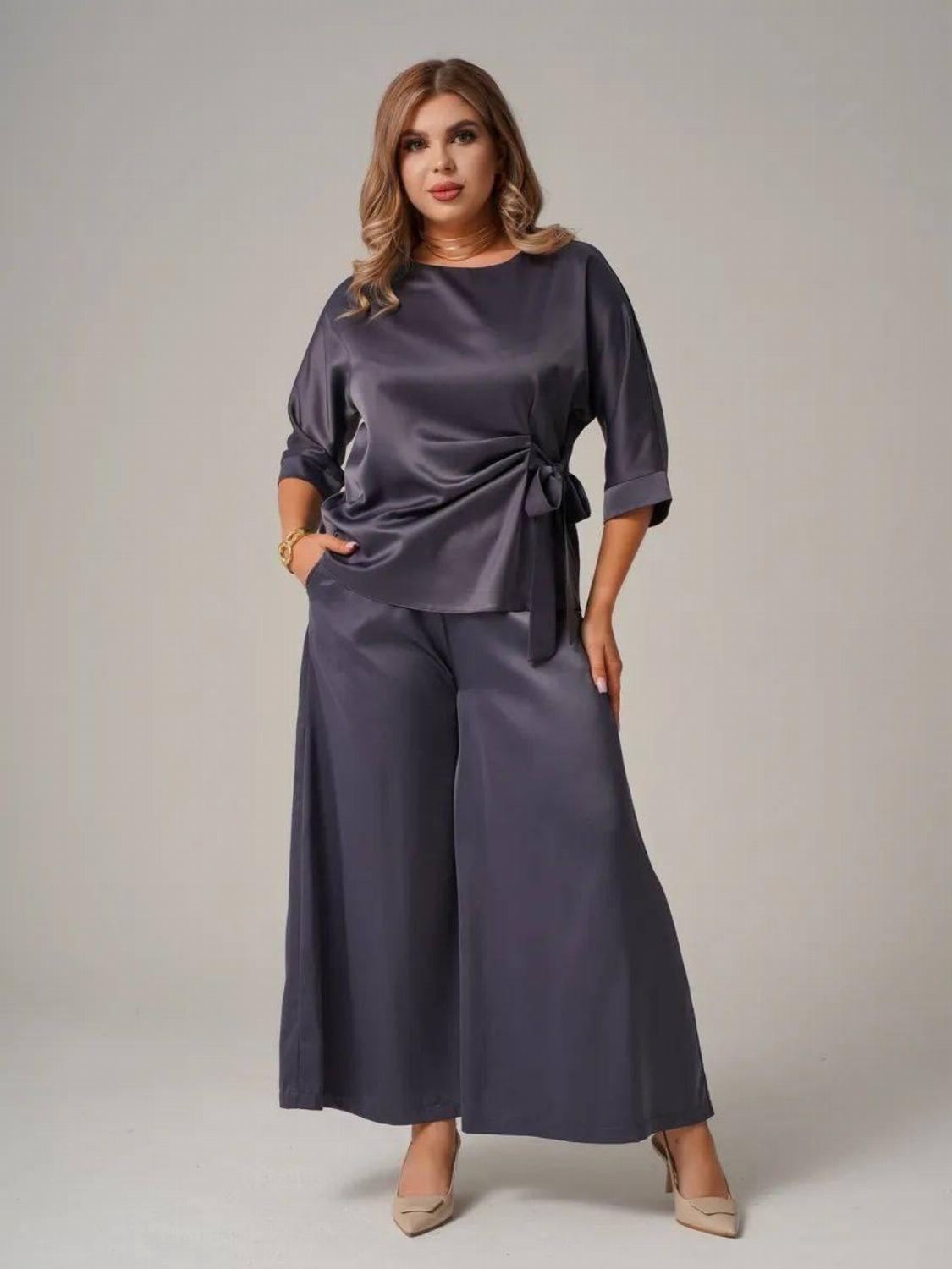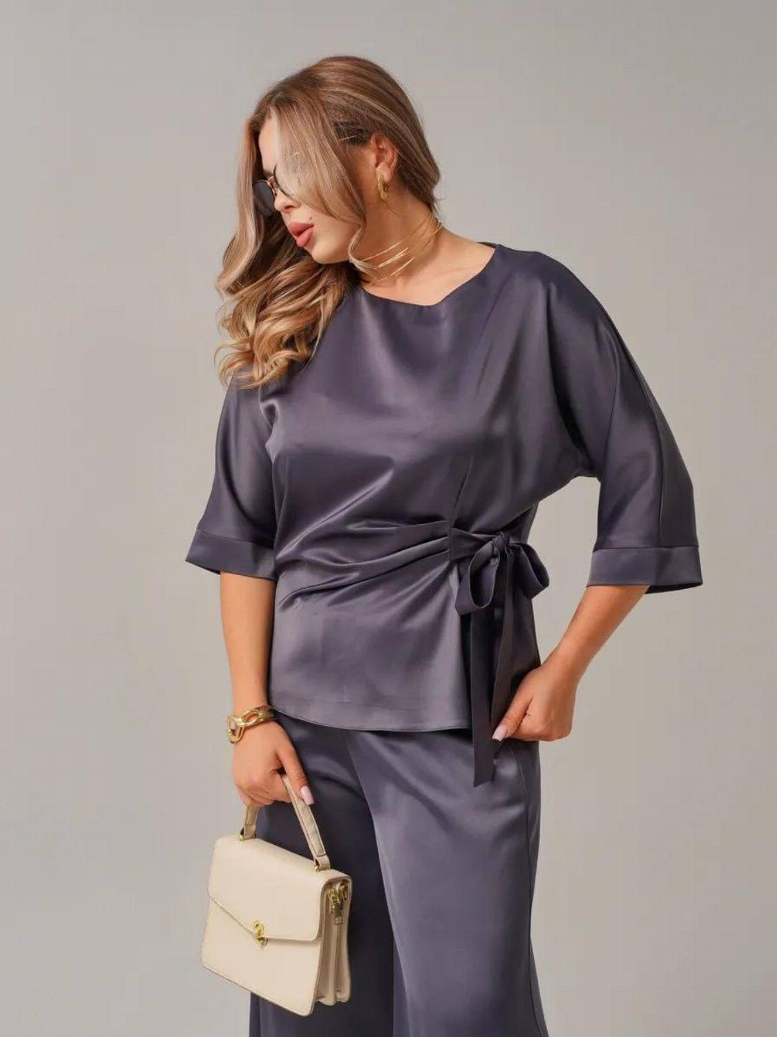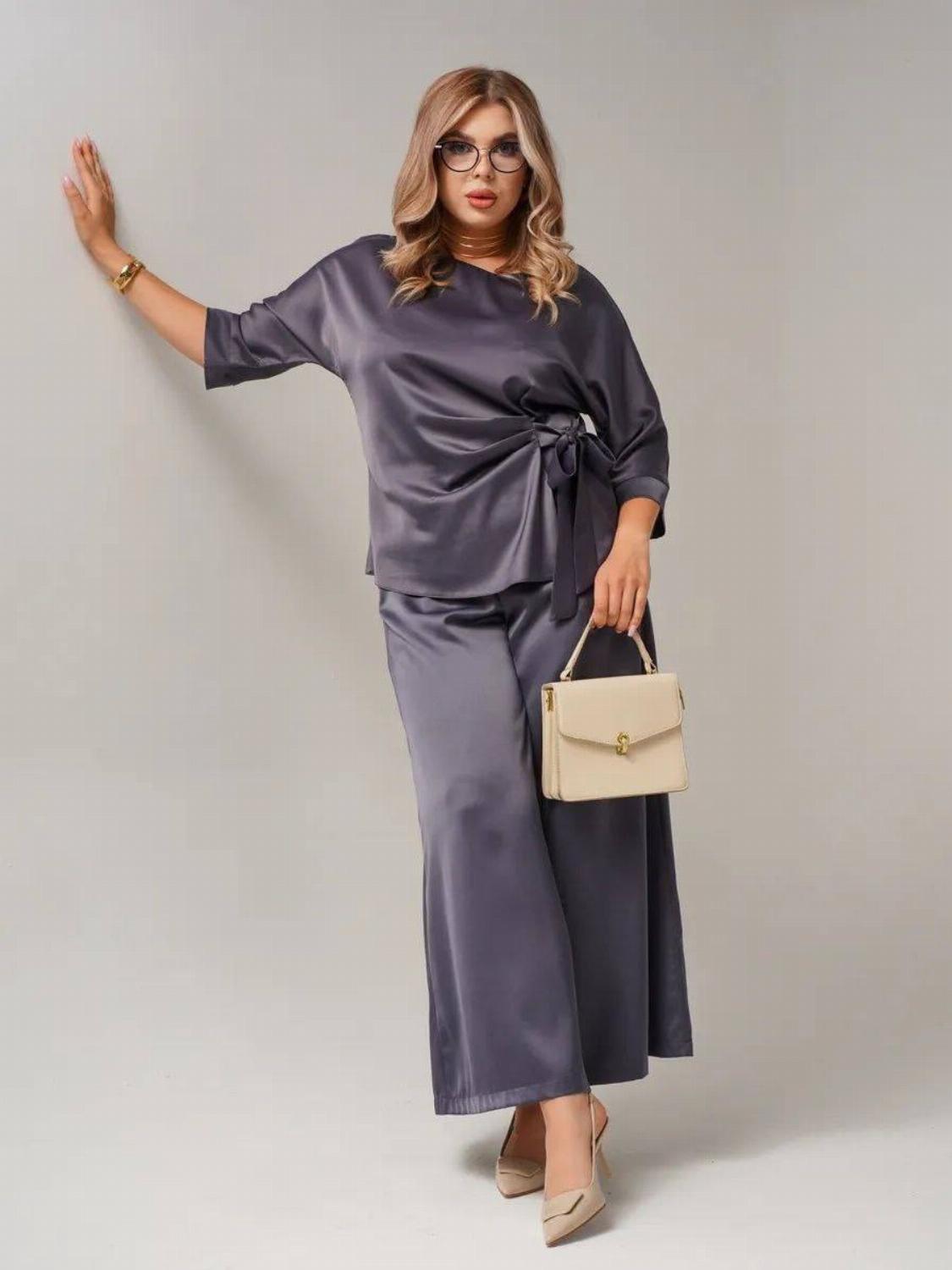 Костюм складається з блузи вільного крою із зав'язкою на талії, яка вигідно підкреслить твою фігуру, та широких штанів, які подарують свободу рухів. Цей комплект ідеально підійде як для офісу, так і для вечірнього виходу.