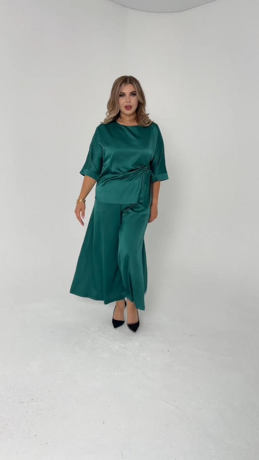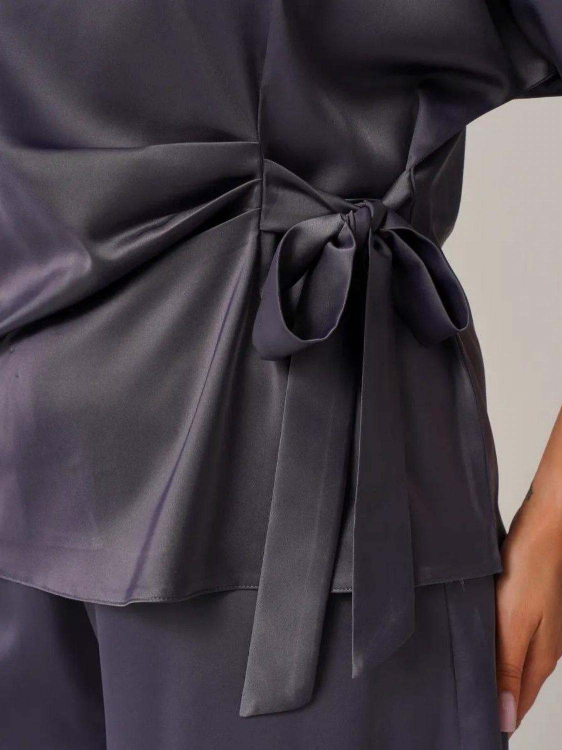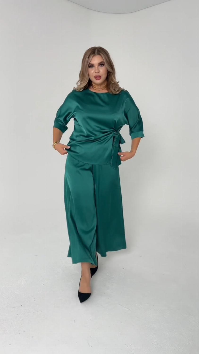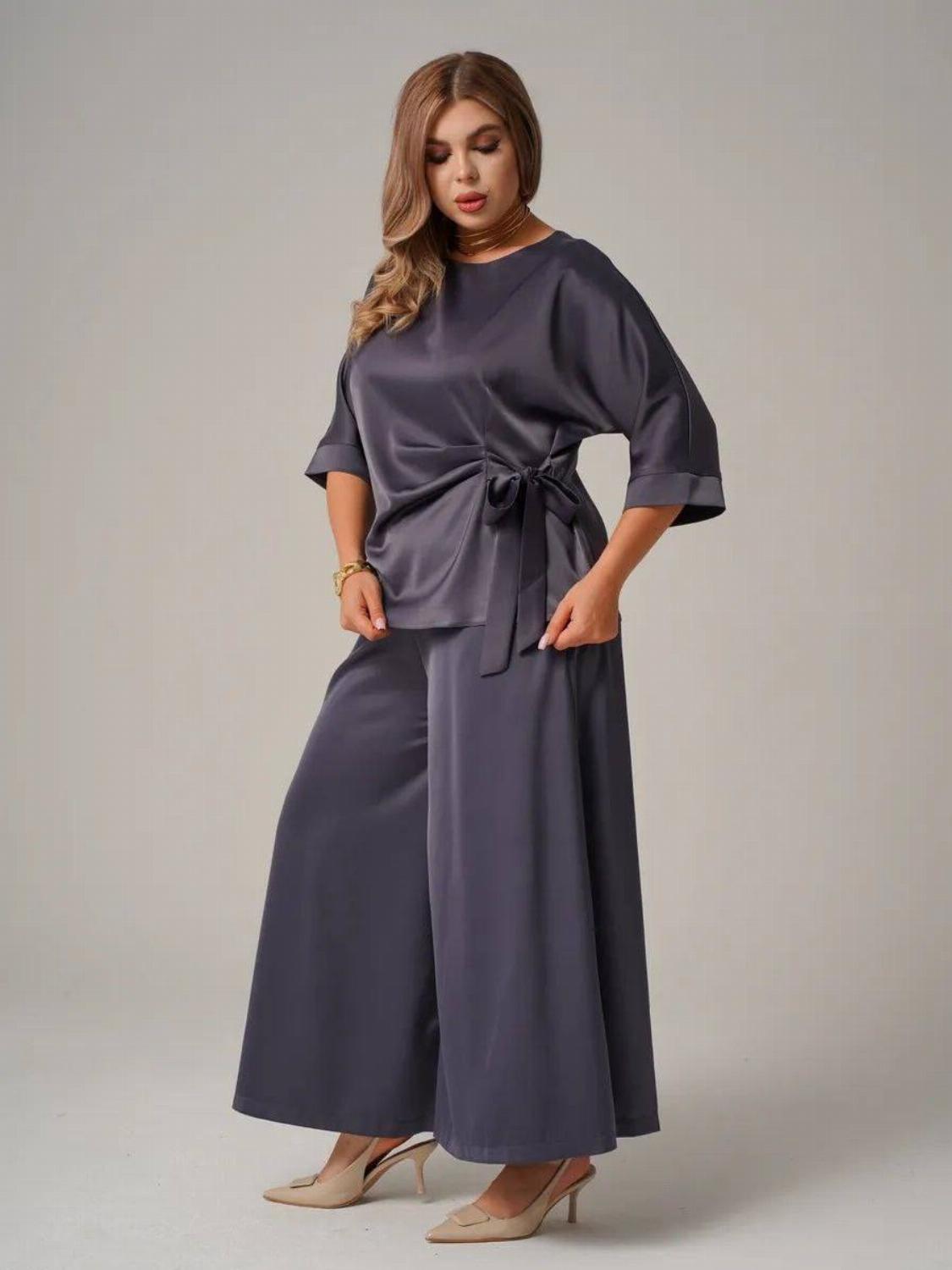 Костюм складається з блузи вільного крою із зав'язкою на талії, яка вигідно підкреслить твою фігуру, та широких штанів, які подарують свободу рухів. Цей комплект ідеально підійде як для офісу, так і для вечірнього виходу.