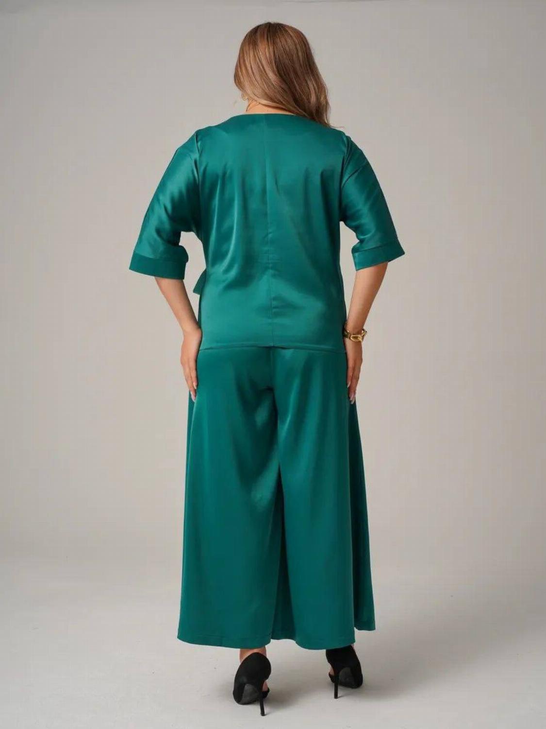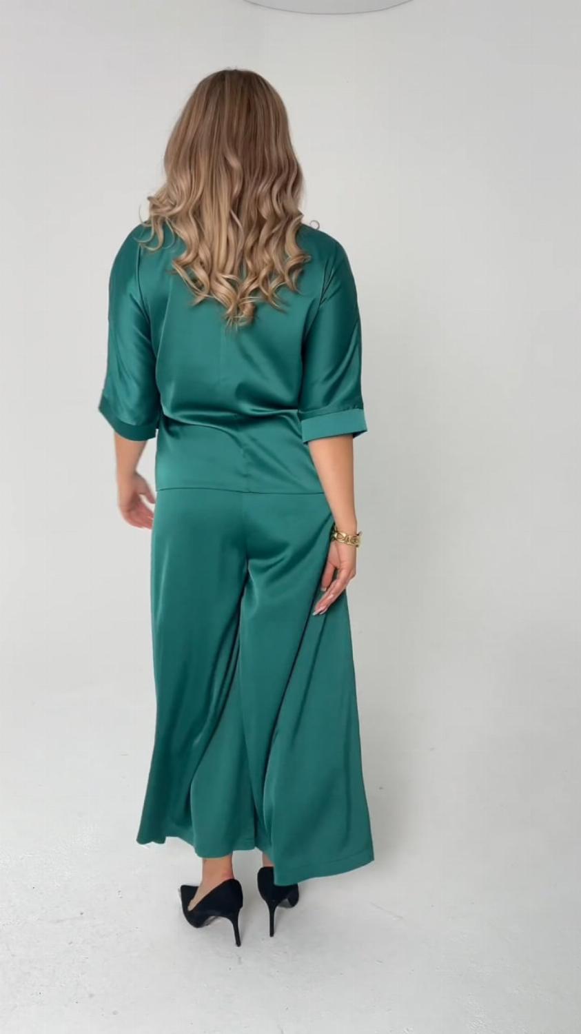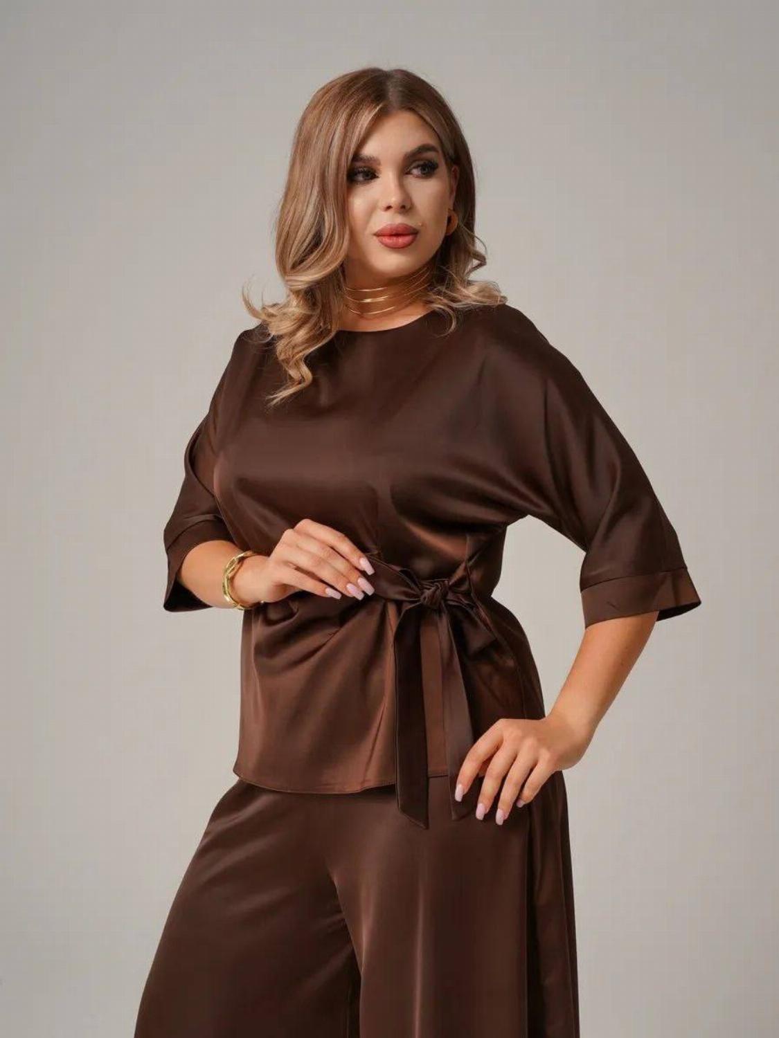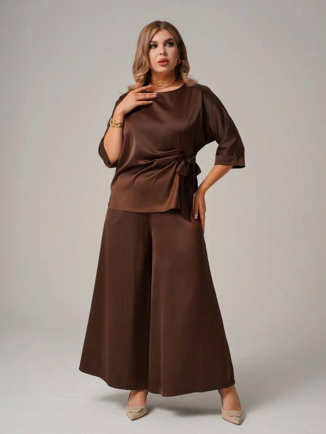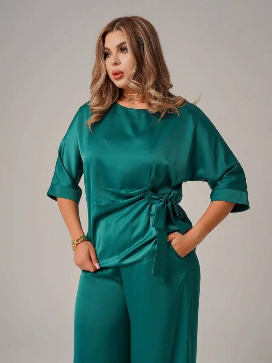 Костюм складається з блузи вільного крою із зав'язкою на талії, яка вигідно підкреслить твою фігуру, та широких штанів, які подарують свободу рухів. Цей комплект ідеально підійде як для офісу, так і для вечірнього виходу.