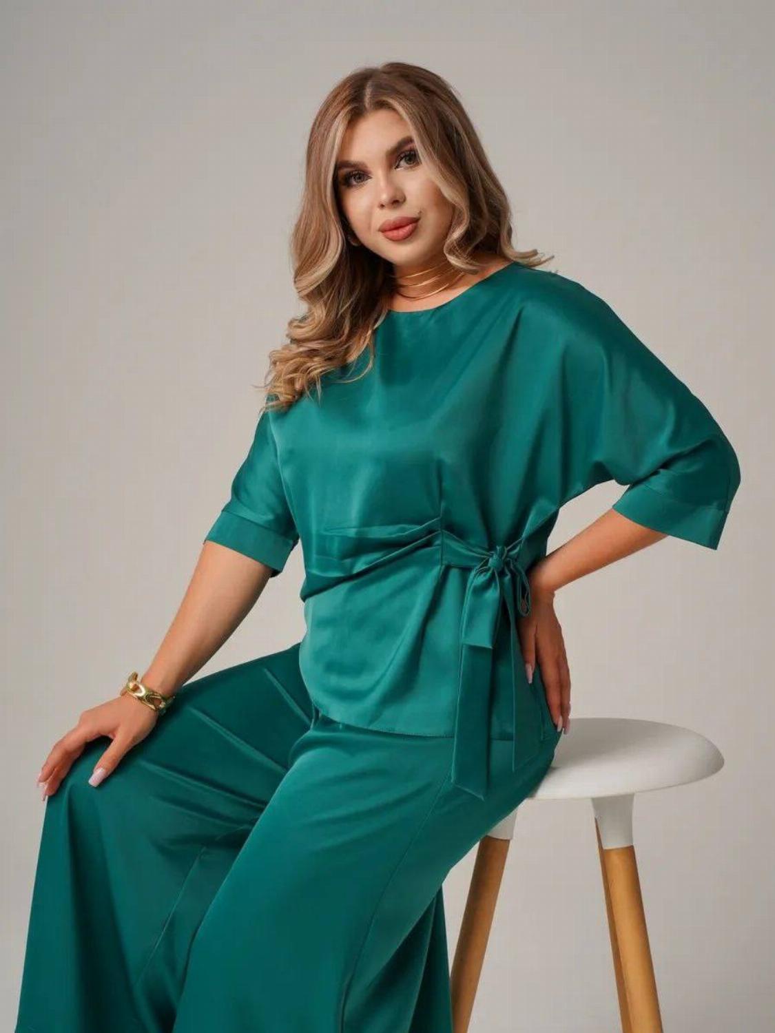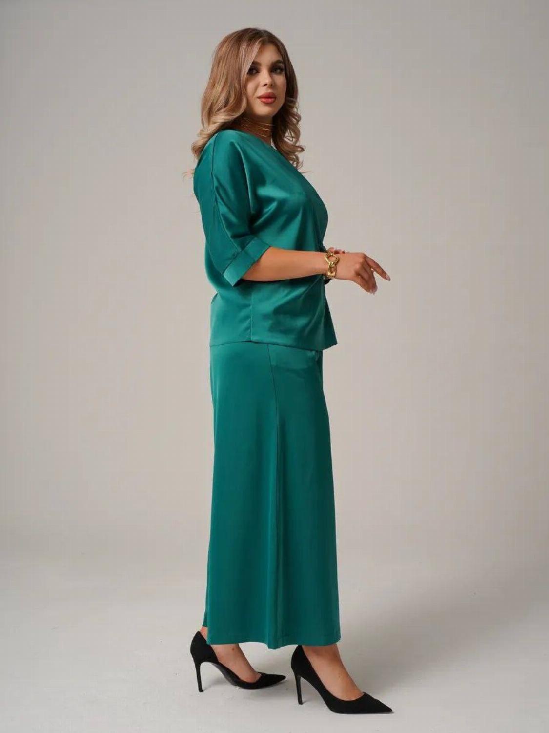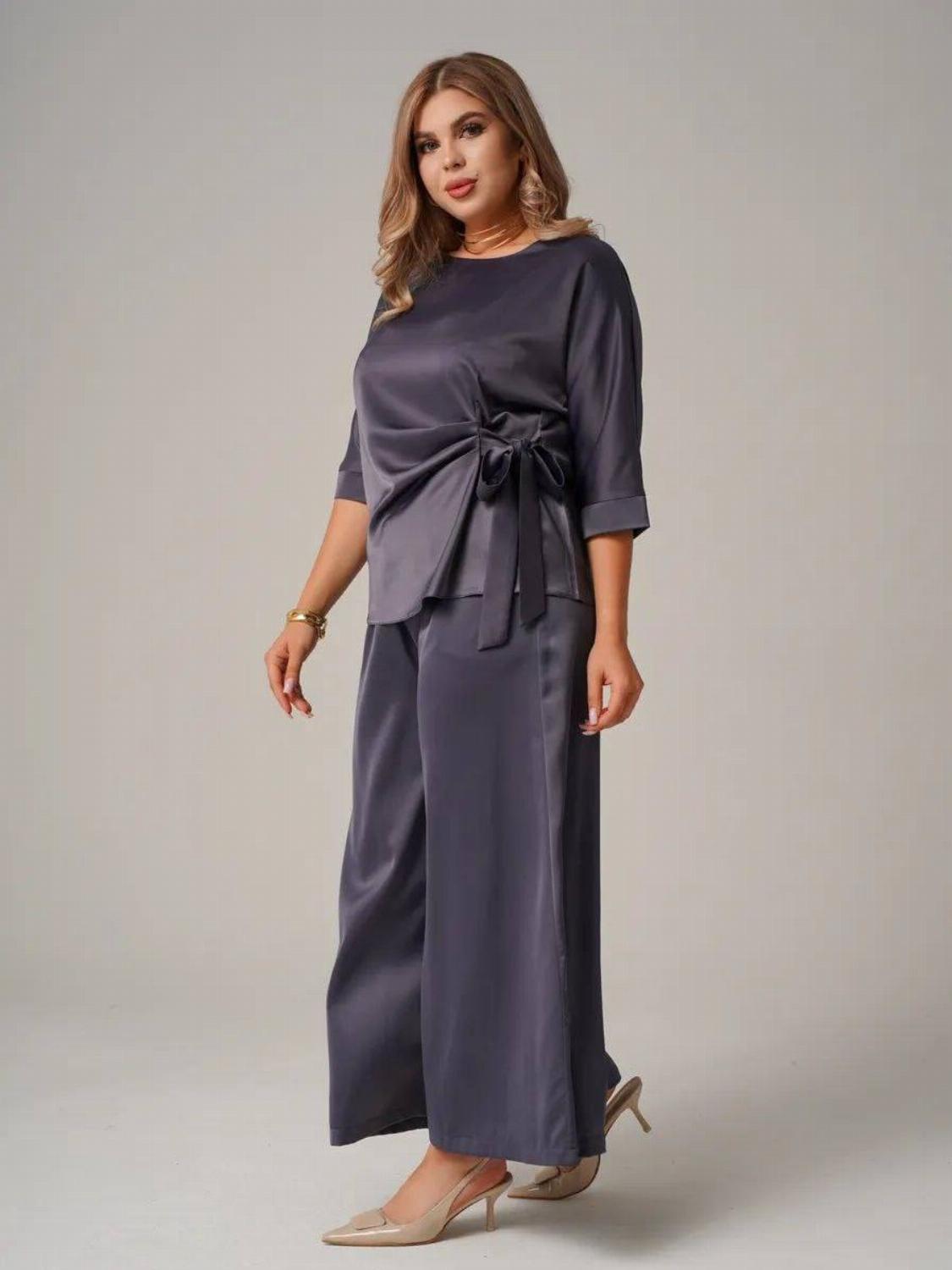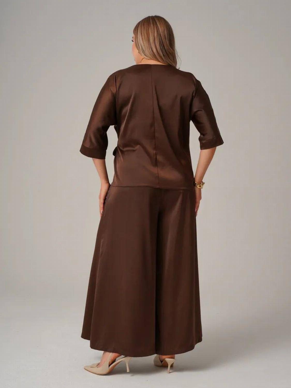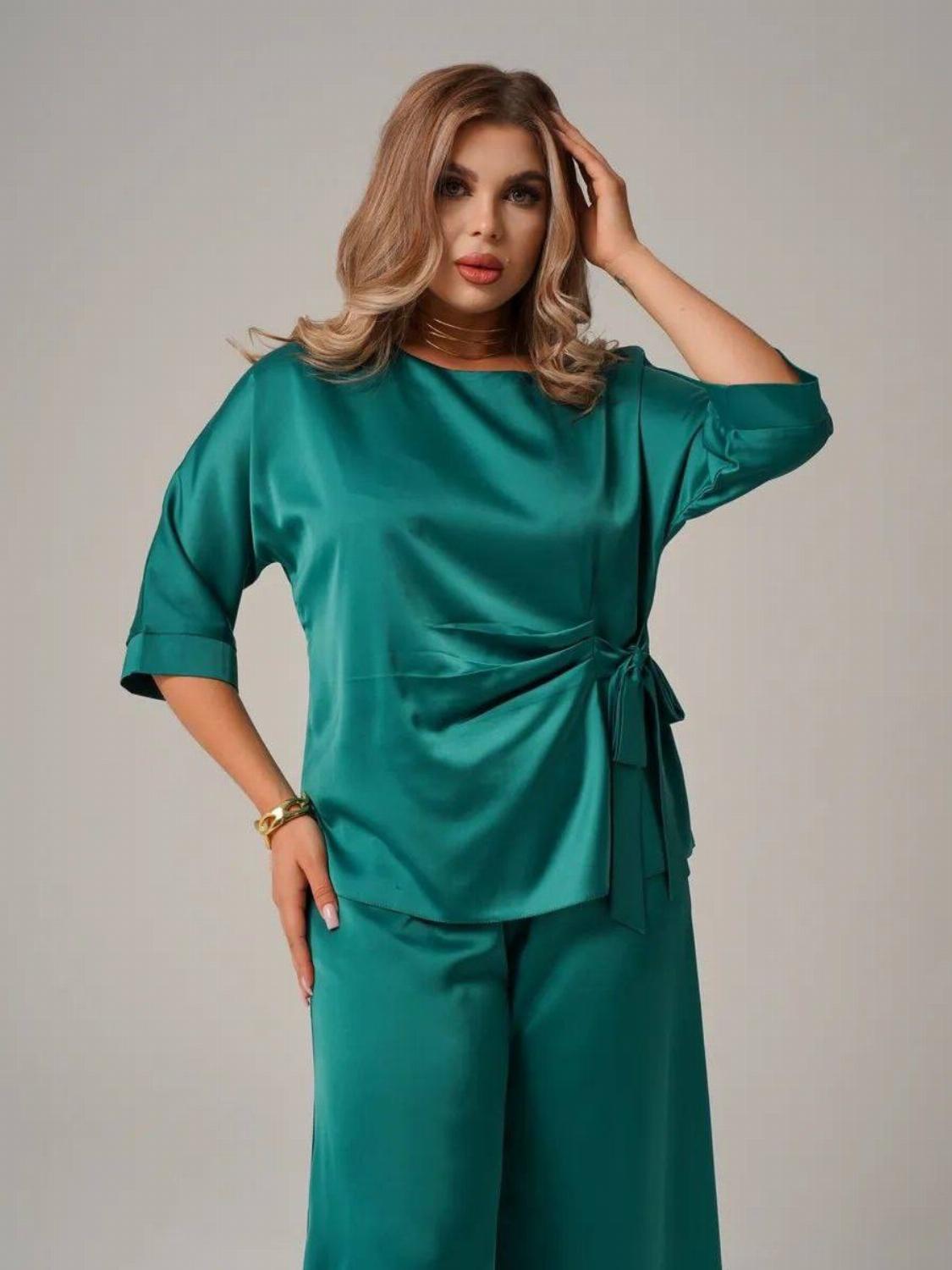 Костюм складається з блузи вільного крою із зав'язкою на талії, яка вигідно підкреслить твою фігуру, та широких штанів, які подарують свободу рухів. Цей комплект ідеально підійде як для офісу, так і для вечірнього виходу.