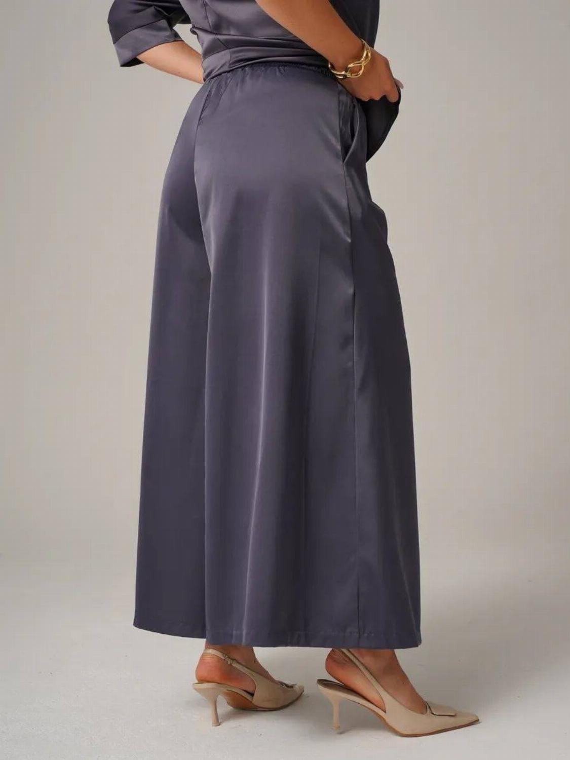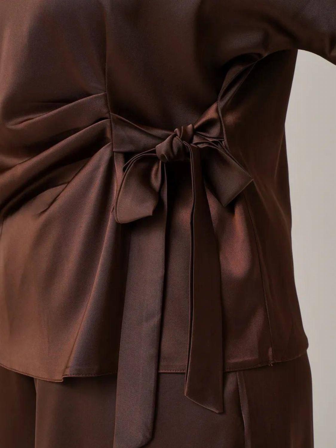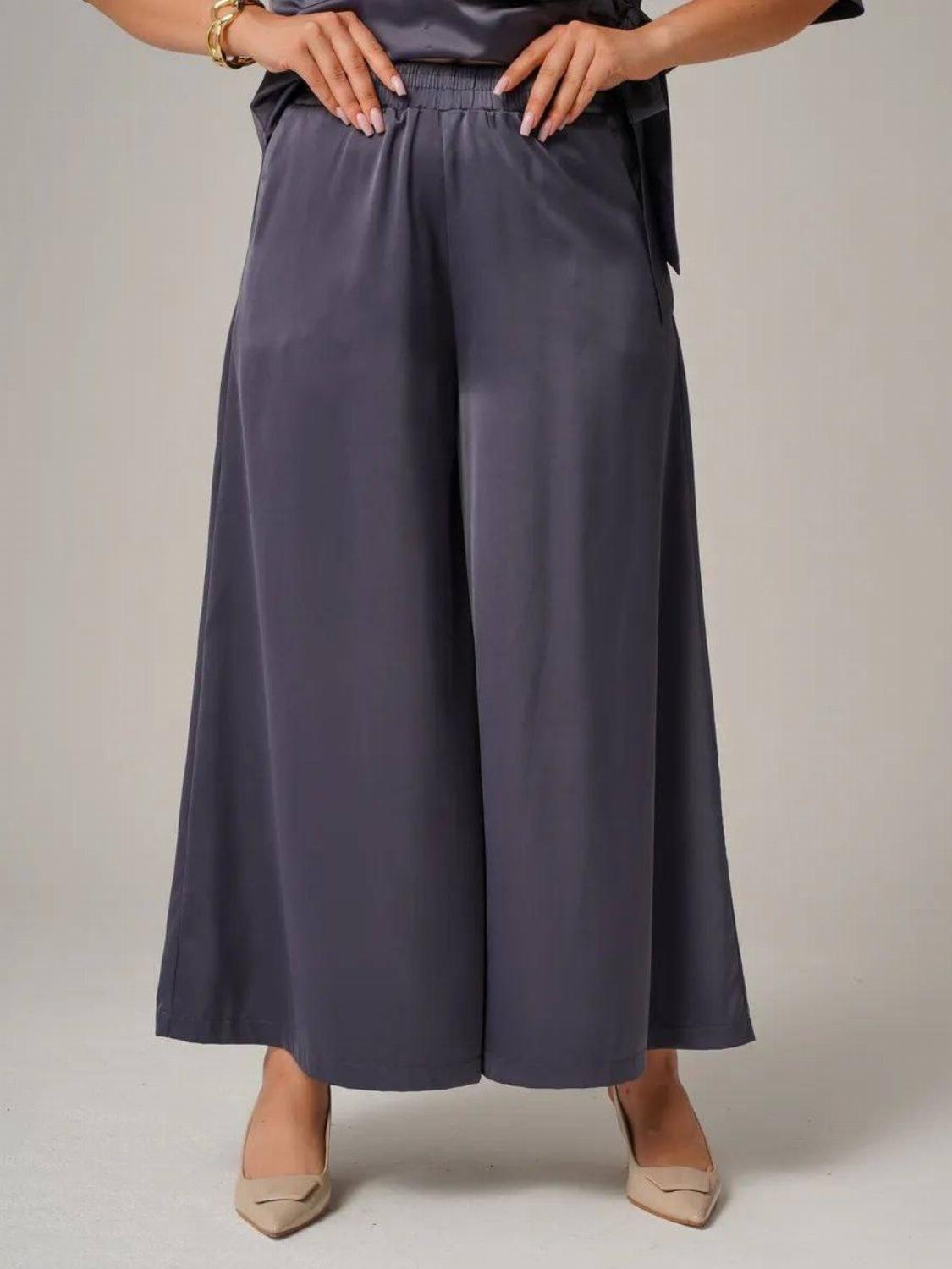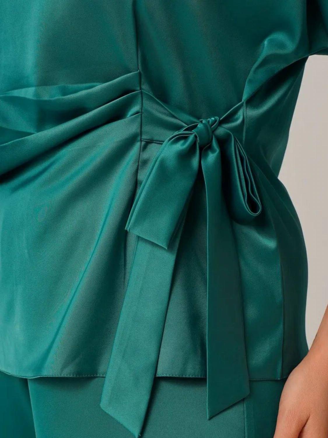 Костюм складається з блузи вільного крою із зав'язкою на талії, яка вигідно підкреслить твою фігуру, та широких штанів, які подарують свободу рухів. Цей комплект ідеально підійде як для офісу, так і для вечірнього виходу.